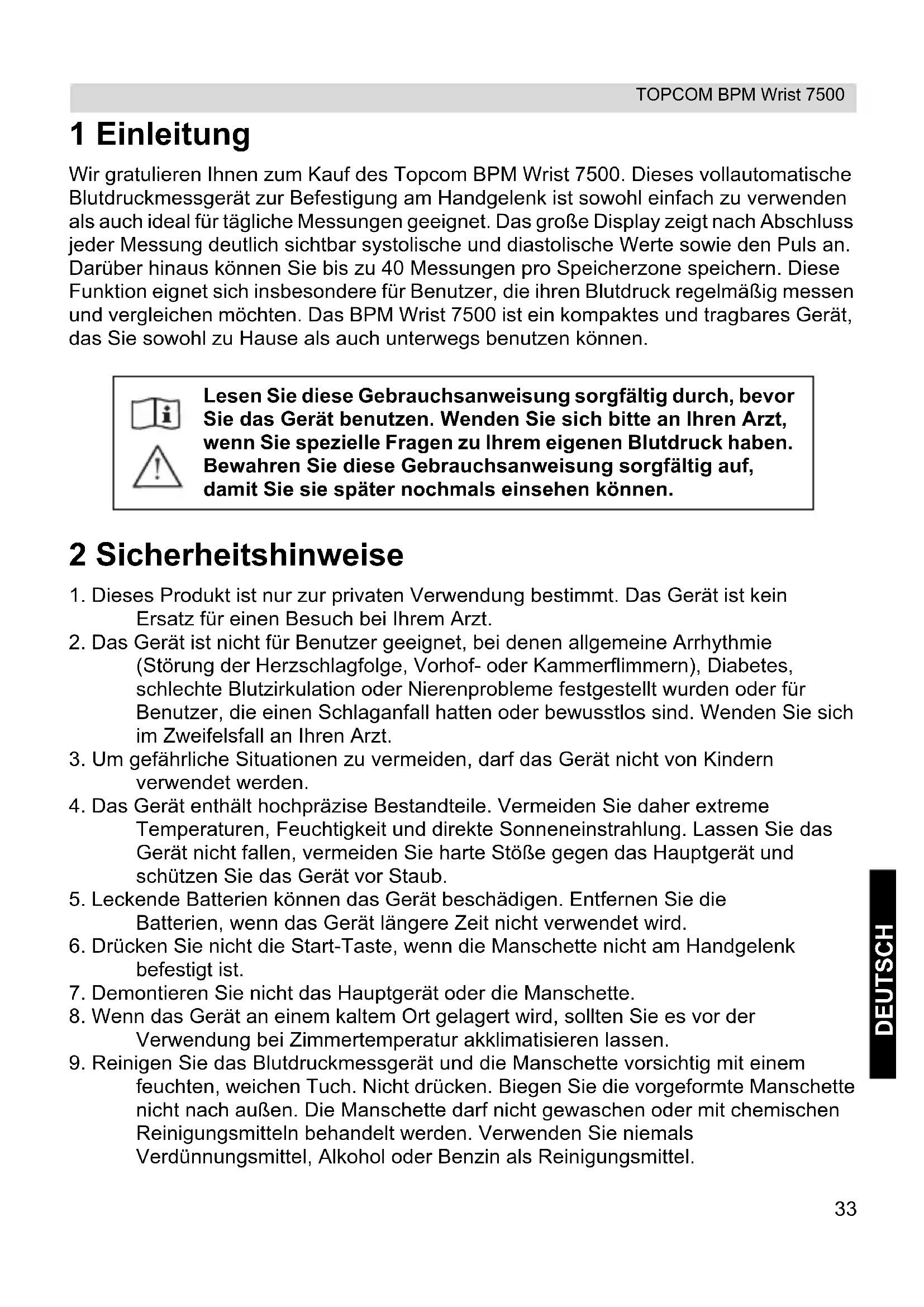 - Fonctionnement continu avec charge brève Le symbole CE indique que l'appareil est conforme aux conditions essentielles de la directive 93/42/EEC.33 TOPCOM BPM Wrist 7500 DEUTSCH 1 Einleitung Wir gratulieren Ihnen zum Kauf des Topcom BPM Wrist 7500. Dieses vollautomatische Blutdruckmessgerät zur Befestigung am Handgelenk ist sowohl einfach zu verwenden als auch ideal für tägliche Messungen geeignet. Das große Display zeigt nach Abschluss jeder Messung deutlich sichtbar systolische und diastolische Werte sowie den Puls an. Darüber hinaus können Sie bis zu 40 Messungen pro Speicherzone speichern. Diese Funktion eignet sich insbesondere für Benutzer, die ihren Blutdruck regelmäßig messen und vergleichen möchten. Das BPM Wrist 7500 ist ein kompaktes und tragbares Gerät, das Sie sowohl zu Hause als auch unterwegs benutzen können. 2 Sicherheitshinweise