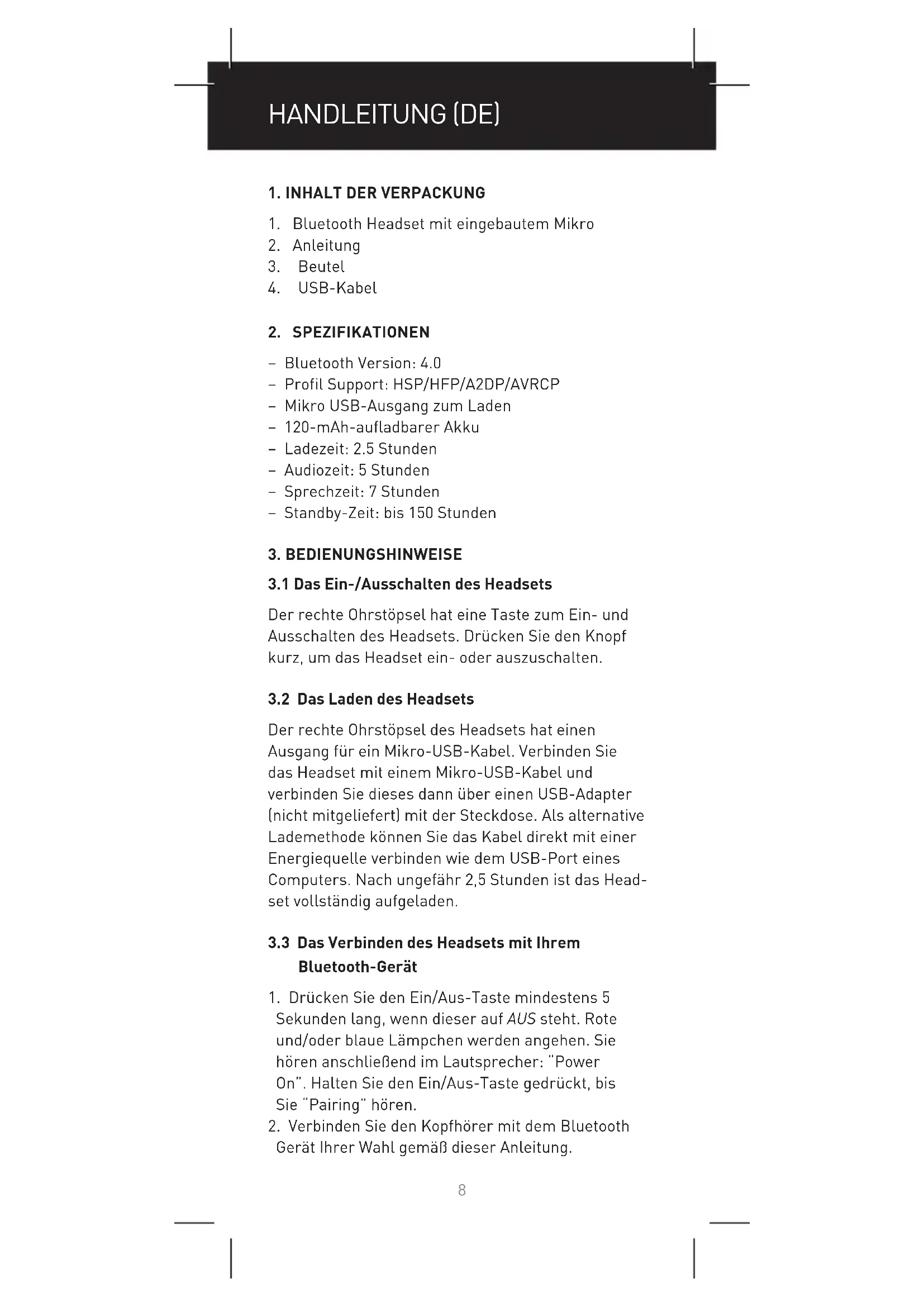 Verbindung hergestellt ist. Wenn Sie zur Bestätigung des Geräts aufgefordert werden, dann klicken Sie „OK“. Sie können das Headset jetzt verwenden und über das Headset die Musik von Ihrem Bluetooth-Gerät hören. Außerdem können Sie eingehende Telefongespräche beantworten. Der Bereich des Headsets beträgt ungefähr 10 Meter.