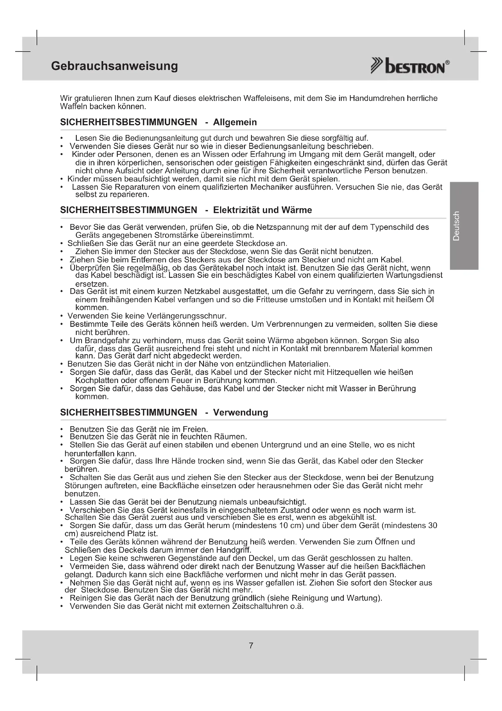 Deutsch Wir gratulieren Ihnen zum Kauf dieses elektrischen Waffeleisens, mit dem Sie im Handumdrehen herrliche Waffeln backen können. SICHERHEITSBESTIMMUNGEN - Allgemein