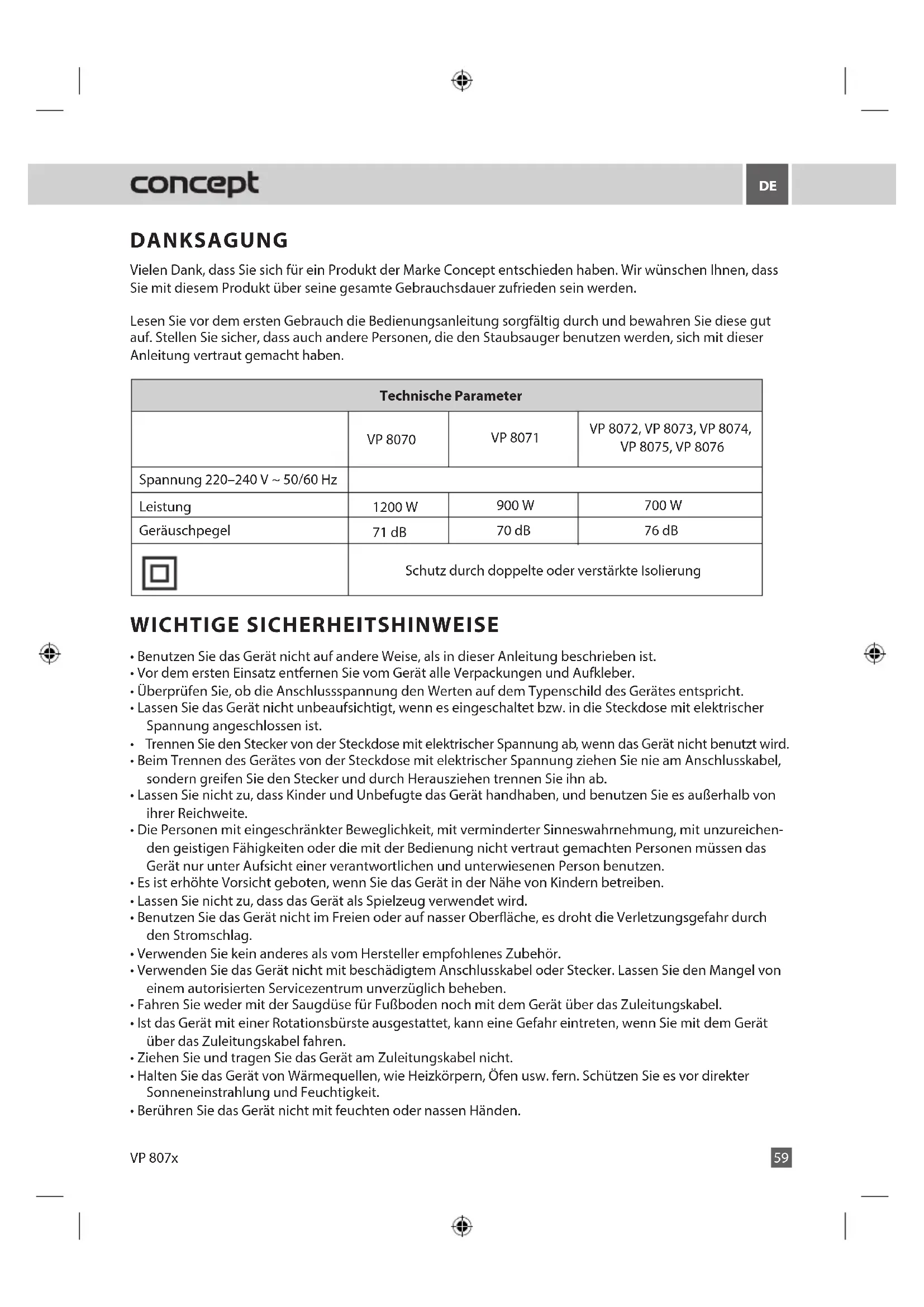 - Berühren Sie das Gerät nicht mit feuchten oder nassen Händen. VP 807x Technische Parameter VP 8072, VP 8073, VP 8074, VP 8075, VP 8076 Spannung 220–240 V ~ 50/60 Hz Leistung 700 W Geräuschpegel 76 dB Schutz durch doppelte oder verstärkte Isolierung VP 8070 1200 W 71 dB VP 8071 900 W 70 dBDE