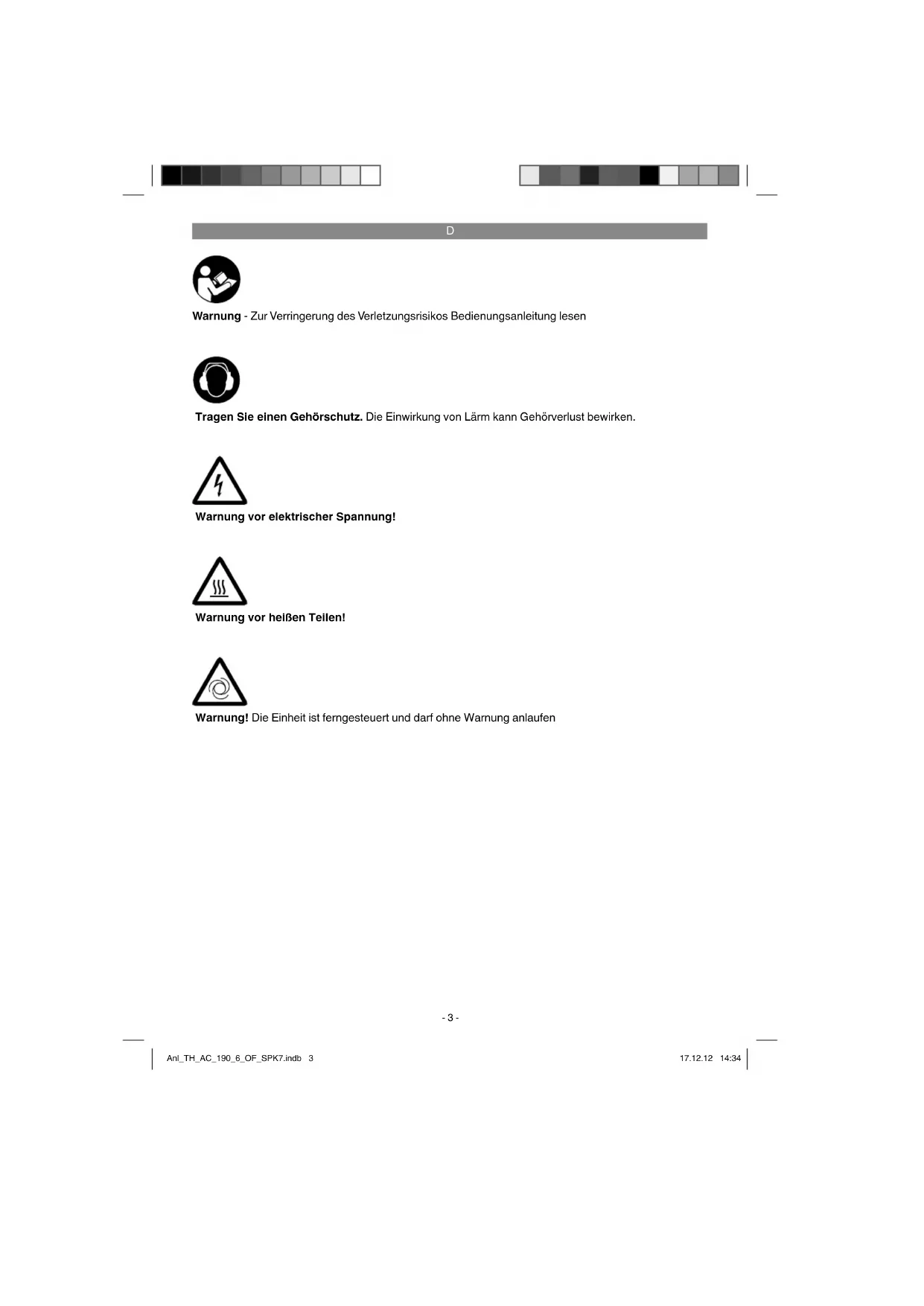 Warnung - Zur Verringerung des Verletzungsrisikos Bedienungsanleitung lesen Tragen Sie einen Gehörschutz. Die Einwirkung von Lärm kann Gehörverlust bewirken. Warnung vor elektrischer Spannung! Warnung vor heißen Teilen! Warnung! Die Einheit ist ferngesteuert und darf ohne Warnung anlaufen Anl_TH_AC_190_6_OF_SPK7.indb 3Anl_TH_AC_190_6_OF_SPK7.indb 3 17.12.12 14:3417.12.12 14:34D