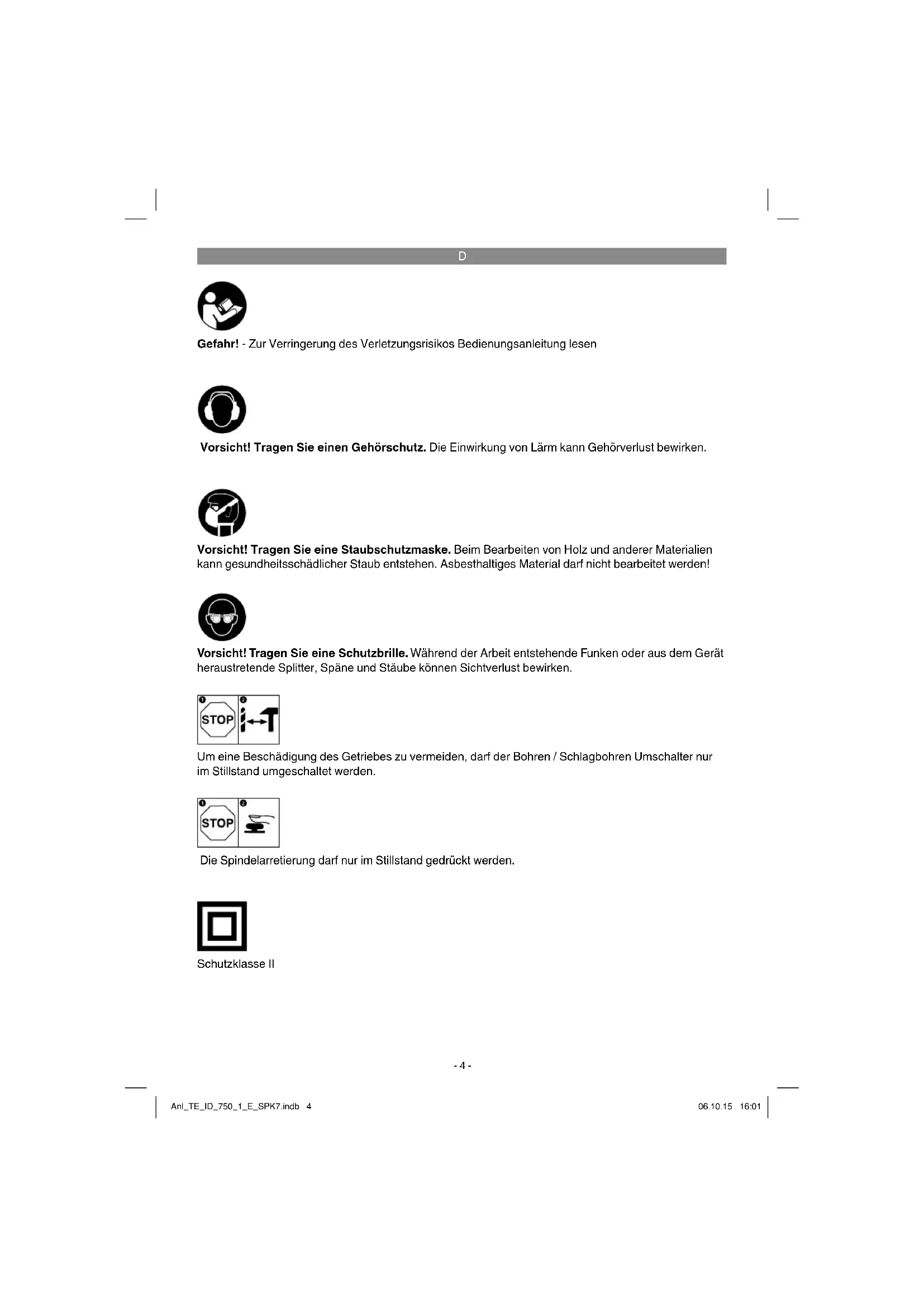 Gefahr! - Zur Verringerung des Verletzungsrisikos Bedienungsanleitung lesen Vorsicht! Tragen Sie einen Gehörschutz. Die Einwirkung von Lärm kann Gehörverlust bewirken. Vorsicht! Tragen Sie eine Schutzbrille. Während der Arbeit entstehende Funken oder aus dem Gerät heraustretende Splitter, Späne und Stäube können Sichtverlust bewirken. Vorsicht! Tragen Sie eine Staubschutzmaske. Beim Bearbeiten von Holz und anderer Materialien kann gesundheitsschädlicher Staub entstehen. Asbesthaltiges Material darf nicht bearbeitet werden! Um eine Beschädigung des Getriebes zu vermeiden, darf der Bohren / Schlagbohren Umschalter nur im Stillstand umgeschaltet werden. Schutzklasse II Die Spindelarretierung darf nur im Stillstand gedrückt werden. Anl_TE_ID_750_1_E_SPK7.indb 4Anl_TE_ID_750_1_E_SPK7.indb 4 06.10.15 16:0106.10.15 16:01D