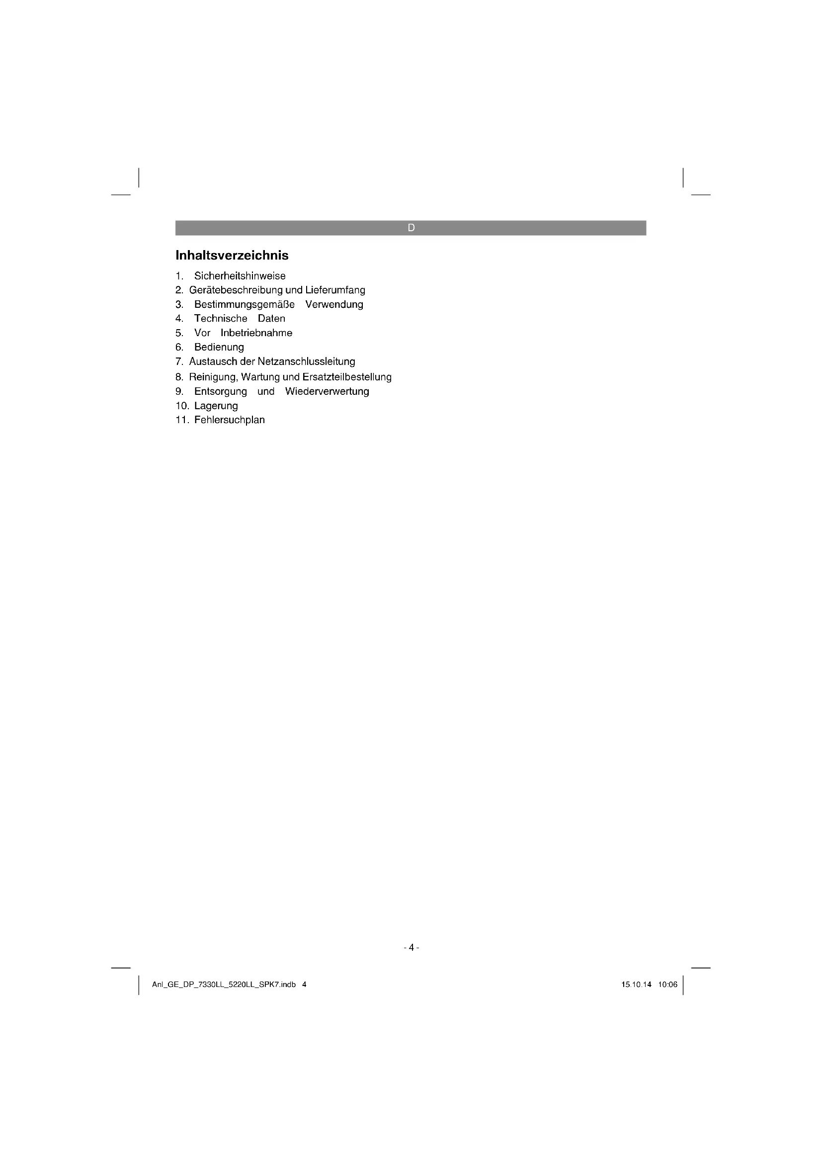 Verschmutzung der Flüssig- keit könnte durch Ausfließen von Schmiermitteln auftreten. Anl_GE_DP_7330LL_5220LL_SPK7.indb 6Anl_GE_DP_7330LL_5220LL_SPK7.indb 6 15.10.14 10:0615.10.14 10:06D