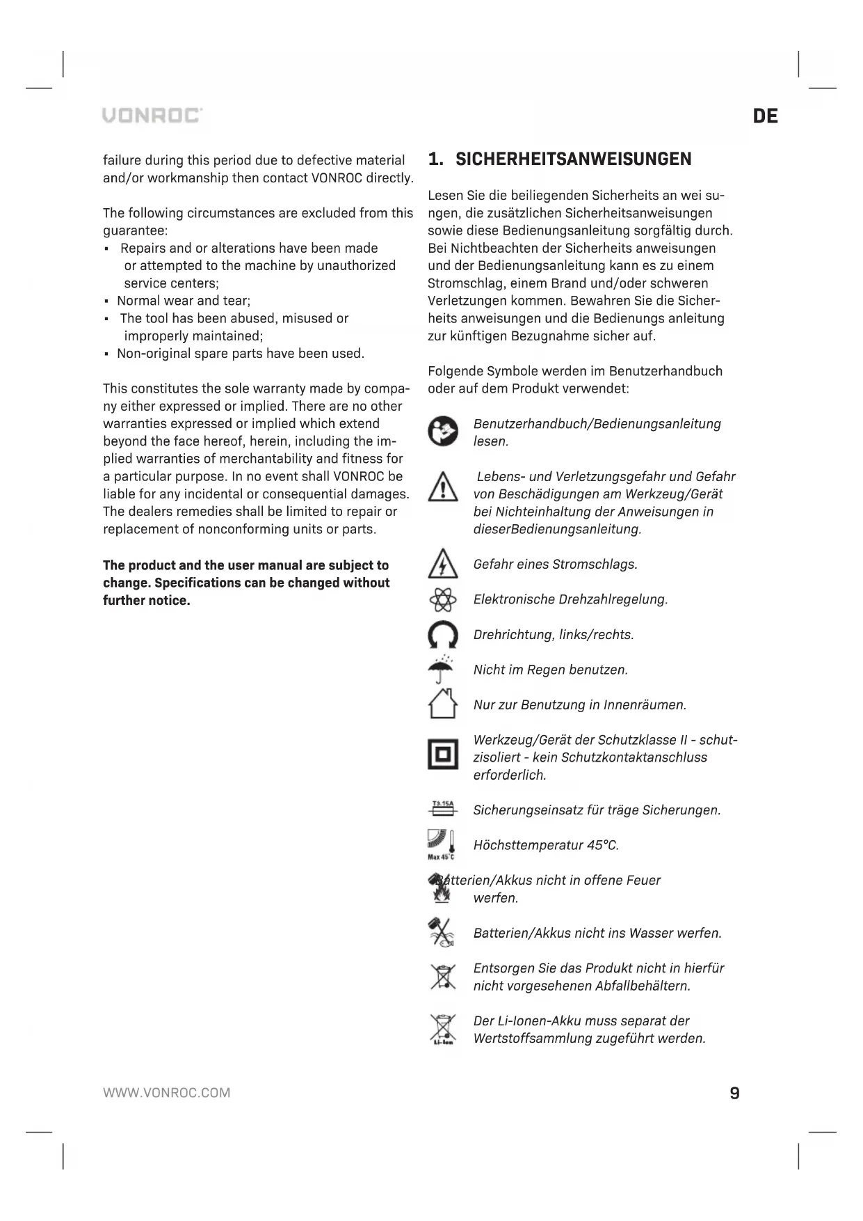 Schalten Sie das Werkzeug immer aus, und entnehmen Sie den Akku aus dem Gerät, bevor Sie Reinigungs- oder Wartungs- arbeiten am Werkzeug vornehmen. Reinigen Sie das Werkzeuggehäuse regelmäßig mit einem weichen Lappen, vorzugsweise nach jeder Verwendung. Stellen Sie sicher, dass die Lüf- tungsöffnungen frei von Staub und Schmutz sind. Entfernen Sie anhaftenden Schmutz mit einem wei- chen Lappen, der leicht mit Seifenwasser befeuch- tet wurde. Verwenden Sie keine Lösungsmittel wie Benzin, Alkohol, Ammoniak usw., da Chemikalien dieser Art die Kunststoffteile beschädigen. UMWELTSCHUTZ Schadhafte und/oder zu entsorgende elektrische oder elektronische Werkzeuge und Geräte müssen an den dafür vorge sehenen Recycling-Stellen abgegeben werden. Nur für EG-Länder Entsorgen Sie Elektrowerkzeuge nicht über den Hausmüll. Entsprechend der EU-Richtlinie 2012/19/EG über Elektro- und Elektronik-Altgeräte sowie der Umsetzung in nationales Recht müssen Elektrowerkzeuge, die nicht mehr im Gebrauch sind, getrennt gesammelt und umweltschonend entsorgt werden. GARANTIE VONROC-Produkte werden nach den höchsten Qua- li täts stan dards entwickelt und sind für den gesetz- lich festgelegten Zeitraum, ausgehend von dem ur- sprüng lichen Kauf datum, garantiert frei von Fehlern in Material und Aus führ ung. Sollte das Produkt in diesem Zeitraum aufgrund von Material- und/oder Ver ar bei tungs mängeln Fehler aufweisen, wenden Sie sich bitte direkt an VONROC Kundendienst. Folgende Umstände sind von der Garantie ausge- schlossen: