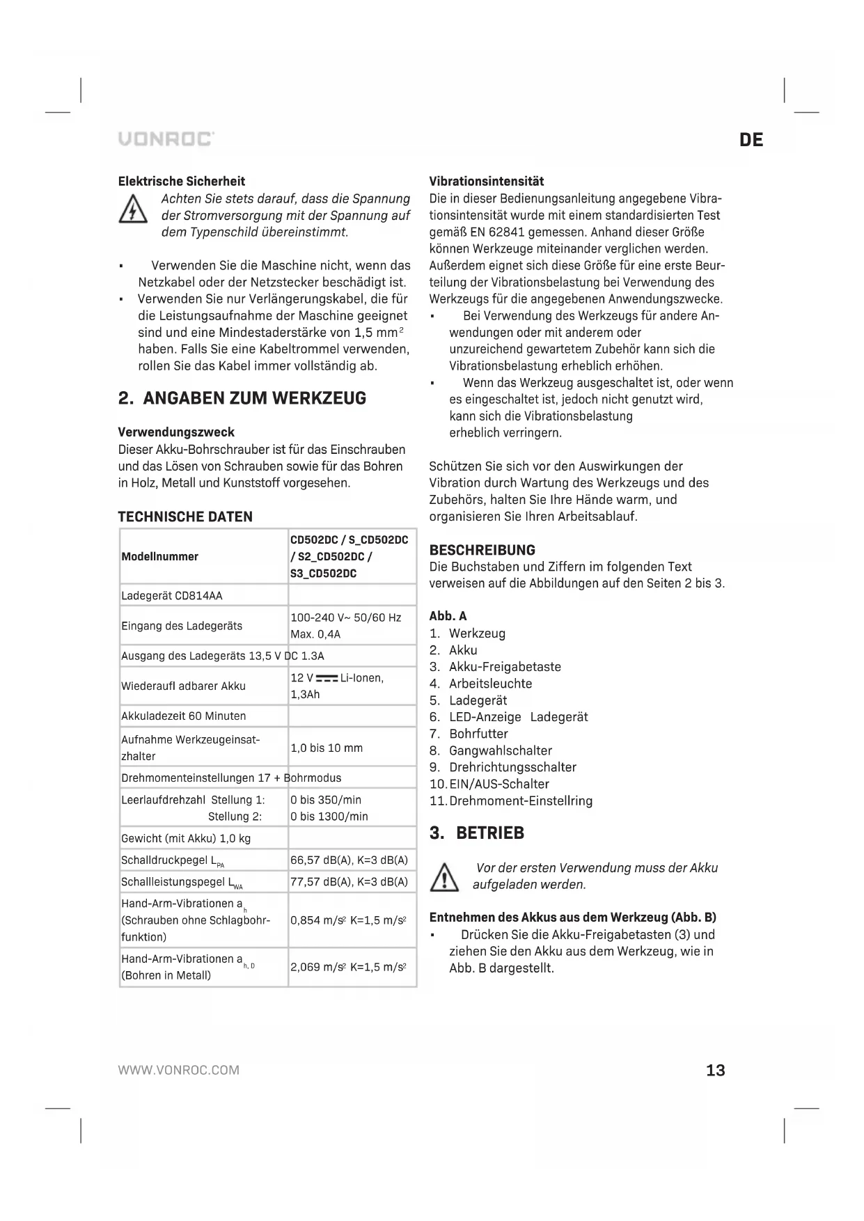 CD502DC - Bohrmaschine Vonroc - Kostenlose Bedienungsanleitung