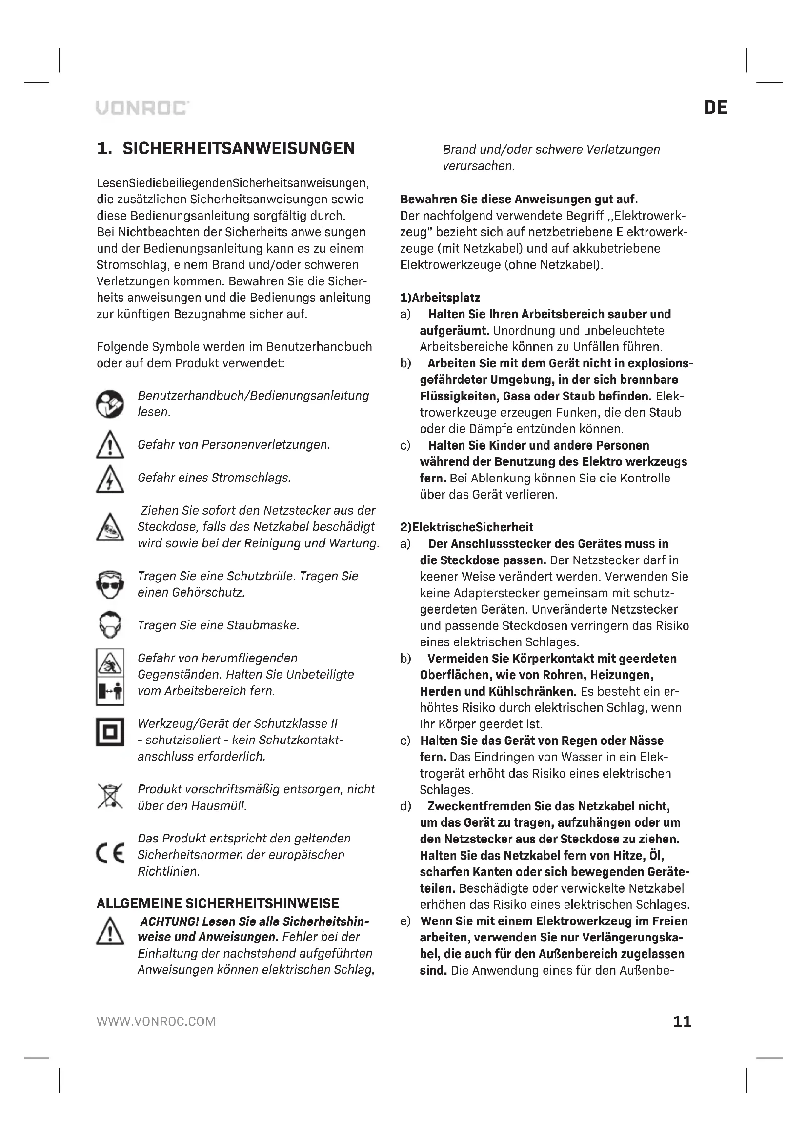 VONROC-Produkte werden nach den hochsten Quali tats stan dards entwickelt und sind fur den gesetzlich festgelegten Zeitraum, ausgehend von dem ursprung lichen Kauf datum, garantiert frei von Fehlern in Material und Aus fahrung. Sollte das Produkt in thisem Zeitraum aufgrund von Material- und/oder VerarbeitungsmängelnFehleraufweisen,wenden Sie sichitte direkt an VONROC Kundendienst.