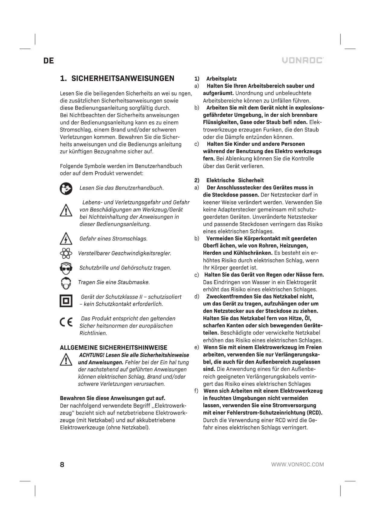 Reinigen Sie das Werkzeuggehäuse regelmäßig mit einem weichen Lappen, vorzugsweise nach jeder Verwendung. Stellen Sie sicher, dass die Lüf- tungsöffnungen frei von Staub und Schmutz sind. Entfernen Sie anhaftenden Schmutz mit einem wei- chen Lappen, der leicht mit Seifenwasser befeuch- tet wurde. Verwenden Sie keine Lösungsmittel wie Benzin, Alkohol, Ammoniak usw., da Chemikalien dieser Art die Kunststoffteile beschädigen. UMWELTSCHUTZ Schadhafte und/oder zu entsorgende elektrische oder elektronische Werkzeuge und Geräte müssen an den dafür vorgesehenen Recycling-Stellen abgegeben werden. Nur für EG-Länder Entsorgen Sie Elektrowerkzeuge nicht über den Hausmüll. Entsprechend der EU-Richtlinie 2012/19/ EG über Elektro- und Elektronik-Altgeräte sowie der Umsetzung in nationales Recht müssen Elektrowerk- zeuge, die nicht mehr im Gebrauch sind, getrennt gesammelt und umweltschonend entsorgt werden. GARANTIE VONROC-Produkte werden nach den höchsten Qua- li täts stan dards entwickelt und sind für den gesetz- lich festgelegten Zeitraum, ausgehend von dem ur- sprüng lichen Kauf datum, garantiert frei von Fehlern in Material und Aus führ ung. Sollte das Produkt in diesem Zeitraum aufgrund von Material- und/oder Ver ar bei tungs mängeln Fehler aufweisen, wenden Sie sich bitte direkt an VONROC Kundendienst. Folgende Umstände sind von der Garantie ausge- schlossen: