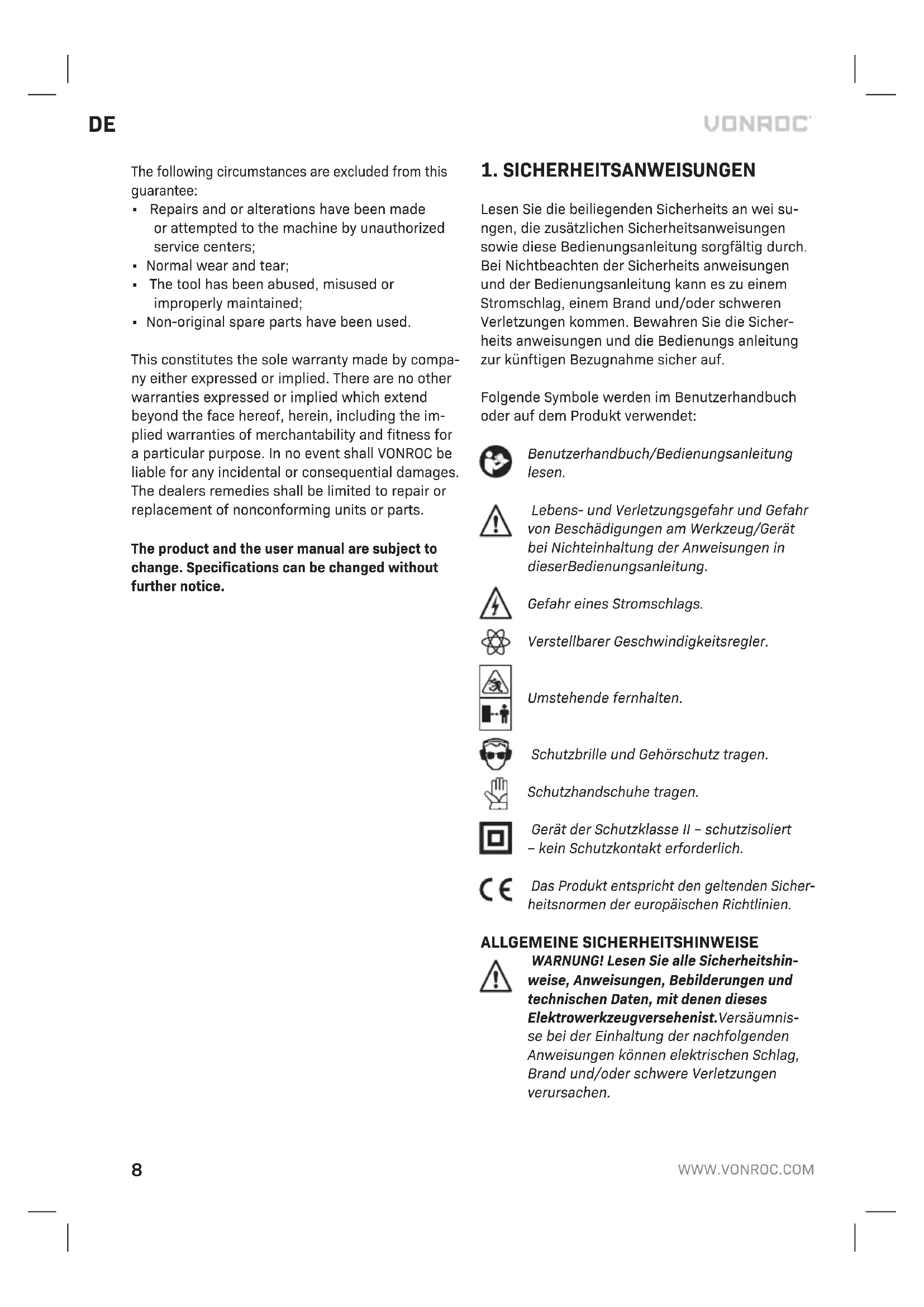 Schalten Sie die Maschine vor der Reinigung und Wartung immer aus und ziehen Sie den Netzstecker aus der Steckdose. Reinigen Sie das Werkzeuggehäuse regelmäßig mit einem weichen Lappen, vorzugsweise nach jeder Verwendung. Stellen Sie sicher, dass die Lüftungsöf- fnungen frei von Staub und Schmutz sind. Entfernen Sie anhaftenden Schmutz mit einem weichen Lappen, der leicht mit Seifenwasser befeuchtet wurde. Ver- wenden Sie keine Lösungsmittel wie Benzin, Alkohol, Ammoniak usw., da Chemikalien dieser Art die Kunst- stoffteile beschädigen. UMWELTSCHUTZ Schadhafte und/oder zu entsorgende elektrische oder elektronische Werkzeuge und Geräte müssen an den dafür vorgesehenen Recycling-Stellen abgegeben werden. Nur für EG-Länder Entsorgen Sie Elektrowerkzeuge nicht über den Hausmüll. Entsprechend der EU-Richtlinie 2012/19/EG über Elektro- und Elektronik-Altgeräte sowie der Umsetzung in nationales Recht müssen Elektrowerkzeuge, die nicht mehr im Gebrauch sind, getrennt gesammelt und umweltschonend entsorgt werden. GARANTIE VONROC-Produkte werden nach den höchsten Qua li täts stan dards entwickelt und sind für den gesetz lich festgelegten Zeitraum, ausgehend von dem ur sprüng lichen Kauf datum, garantiert frei von Fehlern in Material und Aus führ ung. Sollte das Produkt in diesem Zeitraum aufgrund von Material- und/oder Ver ar bei tungs mängeln Fehler aufweisen, wenden Sie sich bitte direkt an VONROC Kunden- dienst. Folgende Umstände sind von der Garantie ausge- schlossen: