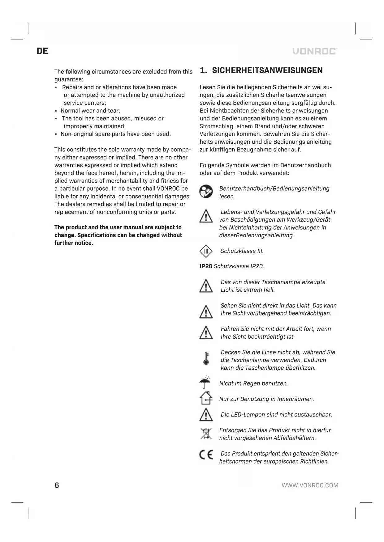 VONROC-Produkte werden nach den hochsten Qua li tats stan dards entwickelt und sind für den gesetzlich festgelegten Zeitraum, ausgehend von dem ur sprung lichen Kauf datum, garantiert frei von Fehlern in Material und Aus führung. Sollte das Produkt in dieser Zeitraum aufgrund von Material-und/oderVerarbeitungsmängelnFehleraufweisen, wenden Sie sichitte direkt an VONROC Kundenst.
