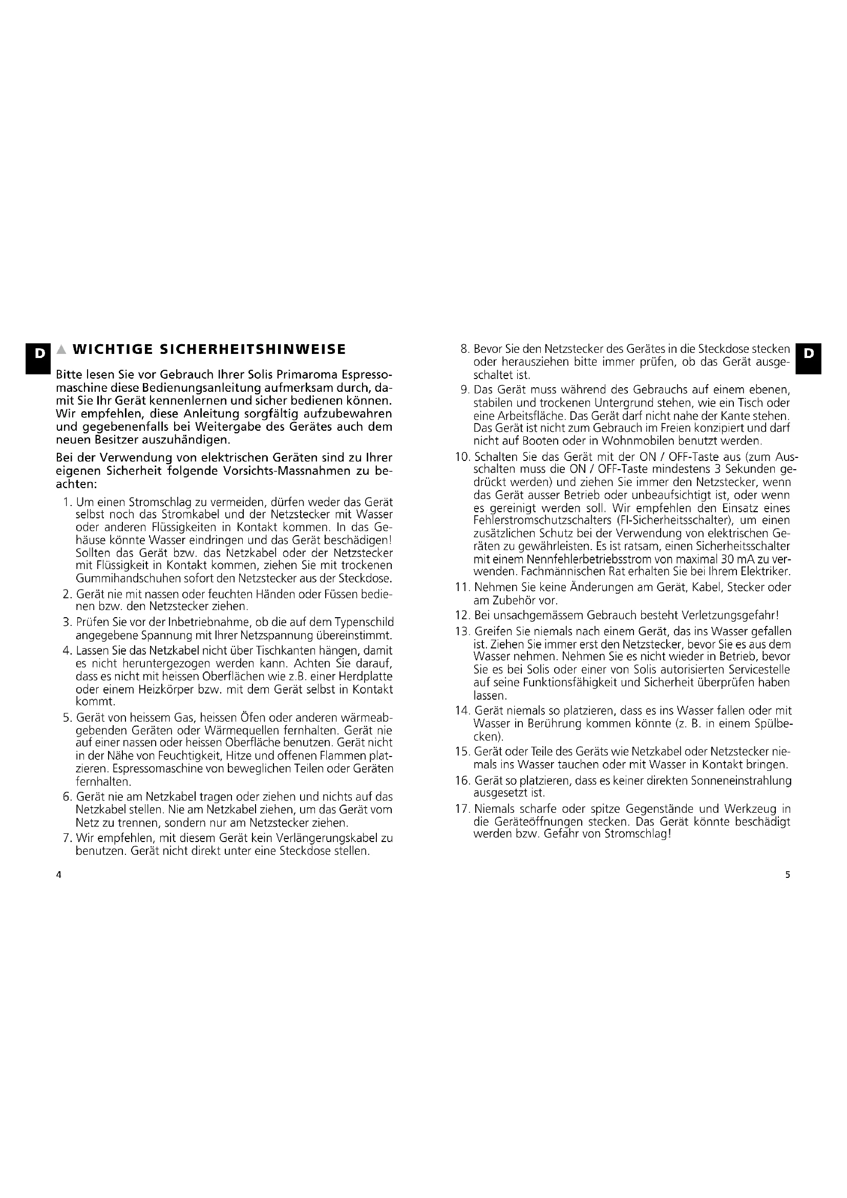 WICHTIGE SICHERHEITSHINWEISE Bitte lesen Sie vor Gebrauch Ihrer Solis Primaroma Espresso- maschine diese Bedienungsanleitung aufmerksam durch, da- mit Sie Ihr Gerät kennenlernen und sicher bedienen können. Wir empfehlen, diese Anleitung sorgfältig aufzubewahren und gegebenenfalls bei Weitergabe des Gerätes auch dem neuen Besitzer auszuhändigen. Bei der Verwendung von elektrischen Geräten sind zu Ihrer eigenen Sicherheit folgende Vorsichts-Massnahmen zu be- achten: