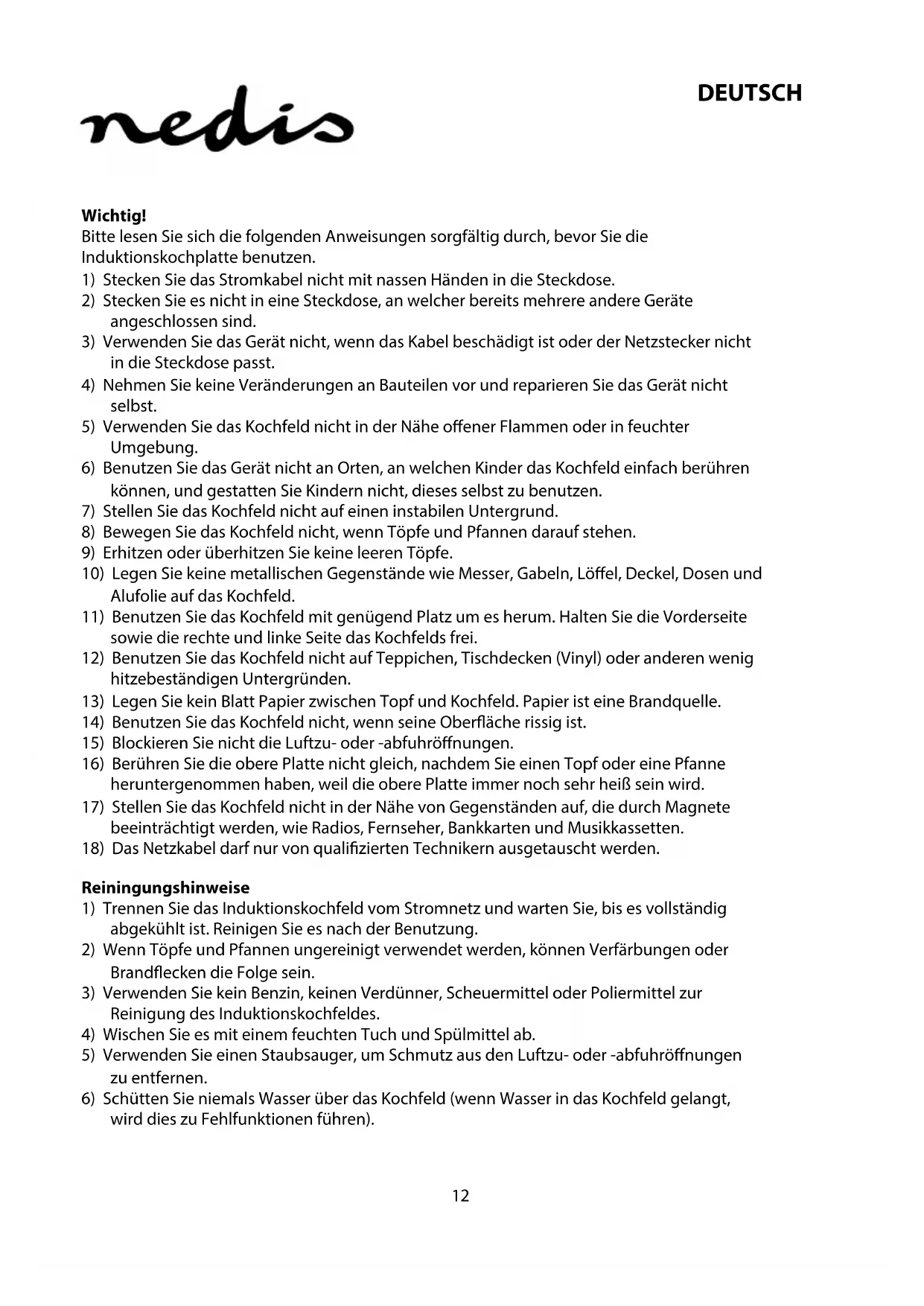 NIET OPENEN Veiligheidsmaatregelen: Om het risico op elektrische schokken te voorkomen mag dit product ALLEEN worden geopend door een erkende technicus wanneer er onderhoud nodig is. Koppel het product los van de elektrische voeding en van andere apparatuur als er zich problemen voordoen. Stel het product niet bloot aan water of vocht. Onderhoud: Uitsluitend reinigen met een droge doek. Gebruik geen reinigingsmiddelen of schuurmiddelen. Garantie: Voor wijzigingen en veranderingen aan het product of schade veroorzaakt door een verkeerd gebruik van dit product, kan geen aansprakelijkheid worden geaccepteerd. Tevens vervalt daardoor de garantie. Algemeen: Ontwerpen en specicaties kunnen zonder kennisgeving worden gewijzigd. Alle logo’s, merken en productnamen zijn handelsmerken of geregistreerde handelsmerken van de respectievelijke eigenaren en worden hierbij als zodanig erkend. Bewaar deze gebruiksaanwijzing voor latere raadpleging. Opgelet: Dit product is voorzien van dit symbool. Dit symbool geeft aan dat afgedankte elektrische en elektronische producten niet met het gewone huisafval verwijderd mogen worden. Voor dit soort producten zijn er speciale inzamelingspunten. Dit product is vervaardigd en geleverd in overeenstemming met de relevante reglementen en richtlijnen die voor alle lidstaten van de Europese Unie gelden. Het voldoet ook aan alle toepasselijke specicaties en reglementen van het land van verkoop. Op aanvraag is ociële documentatie verkrijgbaar. Inclusief, maar niet uitsluitend: Conformiteitsverklaring (en productidentiteit), materiaalveiligheidsinformatie en producttestrapport. Wend u tot onze klantenservice voor ondersteuning: via de website: http://www.nedis.nl/nl-nl/contact/contact-formulier.htm via e-mail: service@nedis.nl telefonisch: +31 (0)73-5991055 (tijdens kantooruren) NEDIS B.V., De Tweeling 28, 5215 MC ’s-Hertogenbosch, NEDERLAND12 DEUTSCH Wichtig! Bitte lesen Sie sich die folgenden Anweisungen sorgfältig durch, bevor Sie die Induktionskochplatte benutzen.