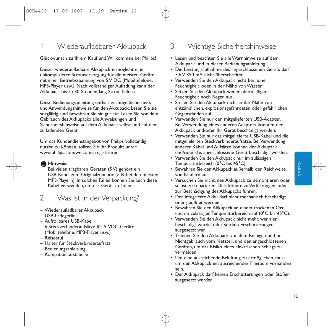 17-09-2007 13:29 Pagina 12 Wiederaufladbarer Akkupack Glückwunsch zu Ihrem Kauf und Willkommen bei Philips! Dieser wiederaufladbare Akkupack ermöglicht eine unkomplizierte Stromversorgung für die meisten Geräte mit einer Betriebsspannung von 5 V DC (Mobiltelefone, MP3-Player usw.). Nach vollständiger Aufladung kann der Akkupack bis zu 30 Stunden lang Strom liefern. Diese Bedienungsanleitung enthält wichtige Sicherheitsund Anwendungshinweise für den Akkupack. Lesen Sie sie sorgfältig, und bewahren Sie sie gut auf. Lesen Sie vor dem Gebrauch des Akkupacks alle Anweisungen und Sicherheitshinweise auf dem Akkupack selbst und auf dem zu ladenden Gerät. Um das Kundendienstangebot von Philips vollständig nutzen zu können, sollten Sie Ihr Produkt unter www.philips.com/welcome registrieren. Hinweis: Bei vielen tragbaren Geräten (5 V) gehört ein USB-Kabel zum Originalzubehör (z. B. bei den meisten MP3-Playern). In solchen Fällen können Sie auch diese Kabel verwenden, um das Gerät zu laden.