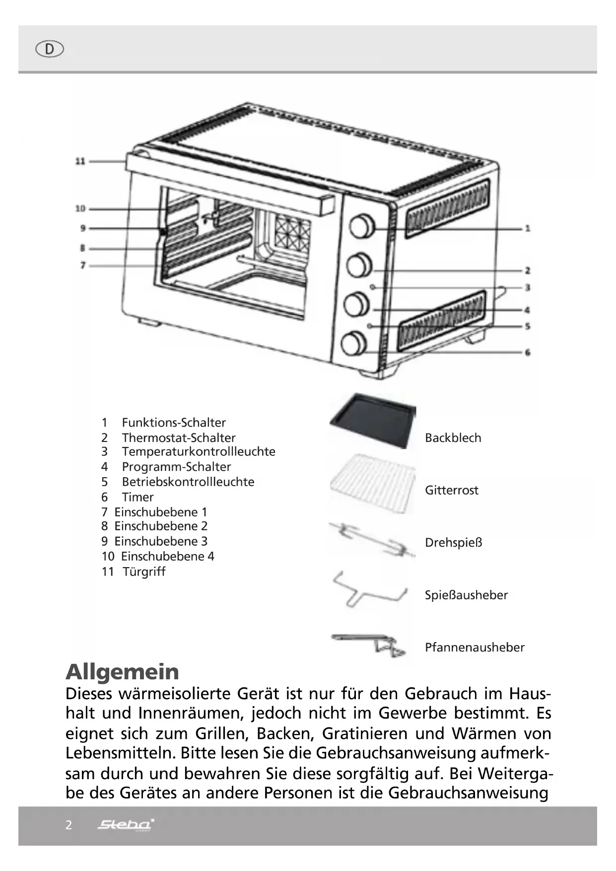 Allgemein DieseswärmeisolierteGerätistnurfürdenGebrauchimHaushaltundInnenräumen,jedoch nichtimGewerbebestimmt.EseignetsichzumGrillen,Backen,GratinierenundWärmen vonLebensmitteln.BittelesenSiedieGebrauchsanweisungaufmerksamdurchund bewahrenSiediesesorgfältigauf.BeiWeitergabedesGerätesananderePersonenistdie Gebrauchsanweisungmitzuübergeben.BenutzenSiedasGerätwieangegebenund beachtenSiedieSicherheitshinweise.FürSchädenoderUnfälle,diedurchNichtbeachtung entstehen,wirdkeineHaftungübernommen.EntfernenSiejeglichesVerpackungsmaterial undalleAufkleber.WaschenSiealleTeilegründlich(sieheReinigung). 1 Funktions-Schalter 2 Thermostat-Schalter 3 Temperaturkontrollleuchte 4 Programm-Schalter 5 Betriebskontrollleuchte 6 Timer 7 Einschubebene 1 8 Einschubebene 2 9 Einschubebene 3 10 Einschubebene 4 11 Türgriff Backblech Gitterrost Drehspieß Spießausheber Pfannenausheber Allgemein Dieses wärmeisolierte Gerät ist nur für den Gebrauch im Haus- halt und Innenräumen, jedoch nicht im Gewerbe bestimmt. Es eignet sich zum Grillen, Backen, Gratinieren und Wärmen von Lebensmitteln. Bitte lesen Sie die Gebrauchsanweisung aufmerk- sam durch und bewahren Sie diese sorgfältig auf. Bei Weiterga- be des Gerätes an andere Personen ist die Gebrauchsanweisung3 mit zu übergeben. Benutzen Sie das Gerät wie angegeben und beachten Sie die Sicherheitshinweise. Für Schäden oder Unfälle, die durch Nichtbeachtung entstehen, wird keine Haftung über- nommen. Entfernen Sie jegliches Verpackungsmaterial und alle Aufkleber. Waschen Sie alle Teile gründlich (siehe Reinigung). Sicherheitshinweise ∙ Heiße Oberfläche! Es besteht Verbrennungsgefahr bei Berühren der Oberfläche im laufenden Betrieb. Das Gerät mit der Rückseite im Abstand von 10cm an die Küchenwand stellen. ∙ Gerät nur gemäß Angaben auf dem Typenschild anschließen und betreiben. ∙ Das Gerät ist kein Einbauofen und darf nicht als solcher verwen- det werden. ∙ Nur benutzen, wenn Zuleitung und Gerät keine Beschädi- gungen aufweisen. Vor jedem Gebrauch überprüfen! ∙ Berühren Sie den Netzstecker nicht mit nassen Händen. ∙ Schließen Sie den Netzstecker nur an eine ordnungsgemäß ge- erdete und gut zugängliche Steckdose an. ∙ Um den Netzstecker zu ziehen, immer am Stecker – nie am Ka- bel – ziehen. ∙ Stecker ziehen nach jedem Gebrauch oder im Fehlerfall ∙ Reißen Sie nicht an der Netzanschlussleitung. Scheuern Sie die- se nicht an Kanten und klemmen Sie diese nicht ein. ∙ Zuleitung von heißen Teilen fernhalten. ∙ Das Gerät kann von Kindern ab 8 Jahren sowie von Per- sonen mit reduzierten physischen, sensorischen oder men- talen Fähigkeiten oder Mangel an Erfahrung und/oder Wissen benutzt werden, wenn sie beaufsichtigt oder bezüglich des si- cheren Gebrauchs des Gerätes unterwiesen wurden und die da- raus resultierenden Gefahren verstanden haben. Reinigung und Benutzer-Wartung dürfen nicht durch Kinder durchgeführt werden, es sei denn sie sind älter als 8 Jahre und beaufsichtigt.4 ∙ Kinder jünger als 8 Jahre sind vom Gerät und der Anschlusslei- tung fernzuhalten. ∙ Kinder sollten beaufsichtigt werden, um sicherzustellen, dass sie nicht mit dem Gerät oder dem Verpackungsmaterial spielen (z.B. Plastiktüten) ∙ Das Gerät darf nicht mit einer Zeitschaltuhr oder mit einem se- paraten Fernwirksystem betrieben werden! ∙ Lassen Sie das Gerät während des Betriebes niemals ohne Auf- sicht. ∙ Bewahren Sie das Gerät nicht im Freien oder einem feuchten Raum auf. ∙ Stellen Sie nichts auf dem Gerät ab und decken Sie die Lüftungsschlitze nicht ab. ∙ Tauchen Sie das Gerät niemals ins Wasser. ∙ Lassen Sie rund um das Gerät mindestens 10cm Platz. ∙ Benutzen Sie das Gerät niemals nach einer Fehlfunktion, z.B. wenn es heruntergefallen ist oder auf eine andere Weise be- schädigt wurde. ∙ Der Hersteller übernimmt keine Verantwortung bei falschen oder unsachgemäßen Gebrauch, der durch die Nichtbeachtung der Gebrauchsanleitung zustande kommt. ∙ Um Gefährdungen zu vermeiden dürfen Reparaturen am Ge- rät, wie z.B. eine beschädigte Zuleitung austauschen, nur durch einen Kundendienst ausgeführt werden. ∙ Gerät wird heiß, nur nach dem Abkühlen transportieren. ∙ Das Gerät nur für die in der Bedienungsanleitung beschrie- benen Zwecke benutzen. ∙ Den Rost nicht mit Alufolie einwickeln (Hitzestau). ∙ Keine Materialien wie Papier, Pappe, Plastik etc. in das Gerät geben. ∙ Vor dem ersten Gebrauch: Alle Teile – außer dem Heizkör- per- gründlich reinigen und trocknen. Um den Neugeruch zu beseitigen, das Gerät ca. 15 min. aufheizen lassen.5 ∙ Vorsicht! Gerät wird heiß. Verbrennungsgefahr! Während des Betriebes kann die Temperatur der be- rührbaren Oberflächen sehr heiß sein! Gerät auf eine ebene nicht empfindliche Unterlage stellen und mindestens 70cm Abstand zu brennbaren Materialien (z.B. Gardinen) ein- halten. ∙ Während des Gebrauchs tritt Dampf aus. Halten Sie Hände und Gesicht auf Abstand. ∙ Bei Verwendung eines Verlängerungskabels muss diese einen Querschnitt von 1,5mm² haben. ∙ Bei einer GS-geprüften 16 A Mehrfach-Steckerleiste darf die- se wegen Brandgefahr nicht mit mehr wie 3680 Watt belastet werden. ∙ Achten Sie drauf, dass Kinder nicht am Kabel ziehen oder eine Stolperfalle entsteht. ∙ Das Gerät ist bei nicht vorhandener Aufsicht und vor dem Zu- sammenbau, dem Auseinandernehmen oder Reinigen stets vom Netz zu trennen. ∙ Achtung: Da sich herabtropfende Fette leicht am Heizkörper entzünden können, niemals ohne Pfanne grillen! Beim Heraus- nehmen der vollen Pfanne kein Fett auf den Heizkörper kippen. ∙ Bitte benutzen Sie zum Herausnehmen des Rostes oder der Pfanne den beigefügten Griff. ∙ Das Gerät nach Gebrauch reinigen. ∙ Das Krümelblech immer unter den unteren Heizkörper, sowie den oberen Reflektor immer über den oberen Heizkörper schie- ben. Reinigung ∙ Achtung! Vor jeder Reinigung Netzstecker ziehen und das Gerät ab