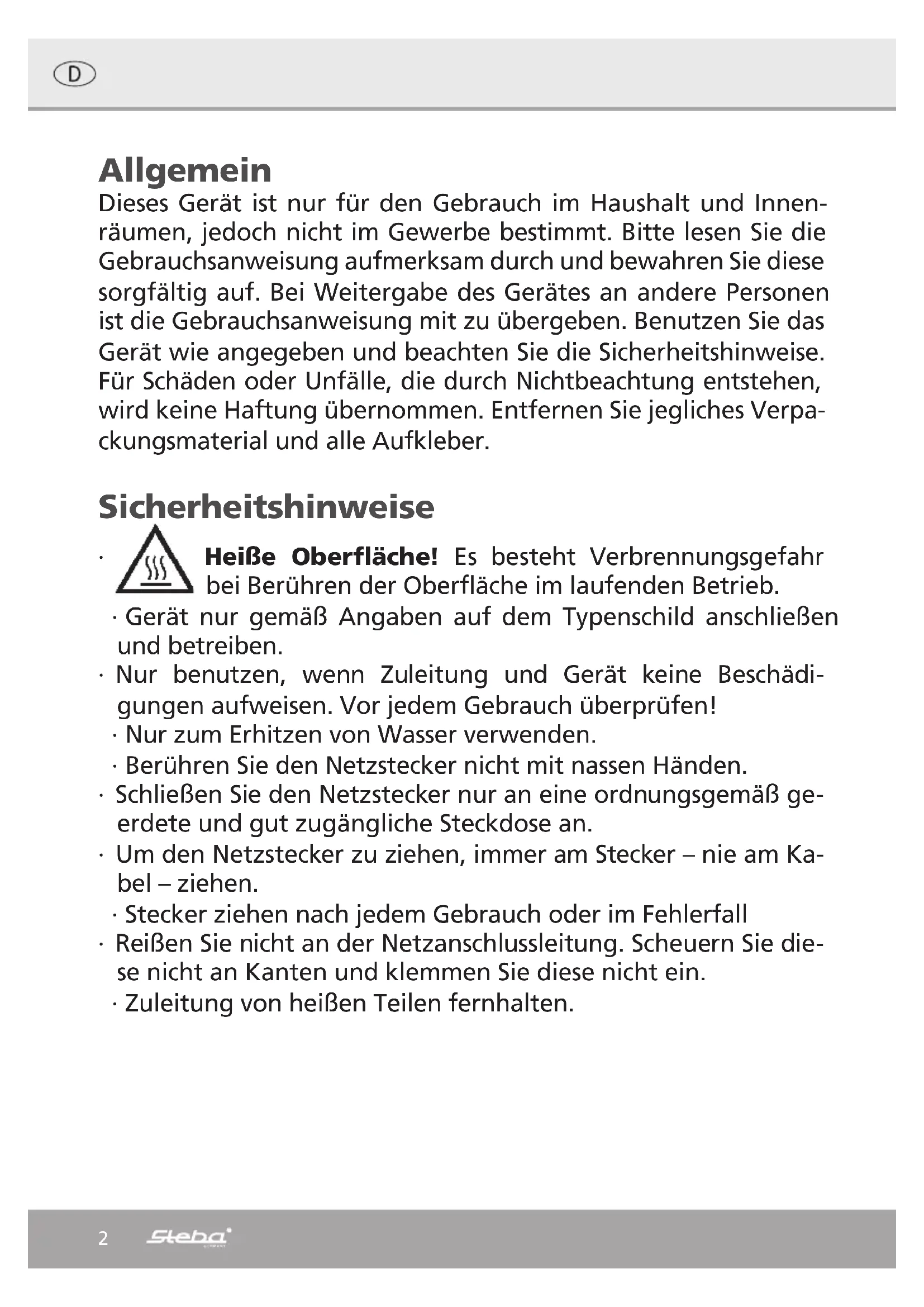 Nicht über den maximalen Füllstand hinaus befüllen, da heißes Wasser aus- treten kann. ∙ Den Behälter auf den Sockel stellen, es piept 2 Mal und die LED leuchten. ∙ Die ON/OFF Taste drücken, die LED leuchtet. ∙ Das Gerät ist im 100°C Modus und heizt sofort. Nach Erreichen der Temperatur piept es 2 Mal und die LED erlischt. ∙ Temperatureinstellung: o Mit der Temperaturwahltaste die Temperatur 50, 70, 80, 90°C wählen. Eine farbige LED zeigt die jeweilige Temperatur an. o Die ON/OFF Taste drücken, das Gerät heizt. o Nach Erreichen der Temperatur piept es 2 Mal und die Beleuchtung er- lischt. ∙ Warmhaltefunktion: o Soll die gewählte Temperatureinstellung für 30 Minuten gehalten werden, dann drücken Sie beim Programmieren die ON/OFF Taste für 5 Sekunden. Die LED am Panel blinkt, die Wasserstandsanzeige leuchtet farbig in der gewählten Temperatur. Nach 30 Minuten schaltet sich das Gerät ab. Fehlerbehebung Sehr geehrter Kunde, vielen Dank für den Kauf eines STEBA-Produktes. Nachfolgende Tabelle gibt Ihnen Hilfestellung bei Problemen, die bei der Benutzung Ihres Gerätes auftreten können. Für viele Probleme gibt es eine einfache Lösung, denn nicht alles, was wie eine Fehl- funktion erscheint, muss schwerwiegend sein. Bitte gehen Sie die folgende Liste durch, bevor Sie unseren Kundendienst kontaktieren. Problem Ursache Problembehandlung Kontrolllampe leuchtet nicht nach Einstecken des Steckers ∙ Kein Strom ∙ Sicherung ausgefallen durch zu viele Geräte an einer Leitung ∙ Ist Netzstecker richtig eingesteckt ∙ Sicherung überprüfen Kochergebnis ist schlecht ∙ Deckel ist nicht richtig geschlossen ∙ Behälterboden ist verkalkt ∙ Deckel schließen ∙ Gerät entkalken Gerät stellt sich aus ∙ Durch Verkalkung ergibt sich Stauhitze, Sicherheitsschalter reagiert ∙ 10 Minuten abkühlen lassen ∙ entkalken8 Korrekte Entsorgung dieses Produkts: Ausgediente Geräte sofort unbrauchbar machen. Innerhalb der EU weist dieses Symbol darauf hin, dass dieses Produkt nicht über den Hausmüll entsorgt werden darf. Altgeräte enthalten wertvolle recy- clingfähige Materialien, die einer Wiederverwertung zugeführt werden soll- ten und um der Umwelt bzw. der menschlichen Gesundheit nicht durch un- kontrollierte Müllbeseitigung zu schaden. Bitte entsorgen Sie Altgeräte deshalb über geeignete Sammelsysteme oder senden Sie das Gerät zur Entsorgung an die Stelle, bei der Sie es gekauft haben. Diese wird dann das Gerät der stofflichen Verwertung zuführen. Verpackungs-Entsorgung Wenn möglich heben Sie die Verpackung auf um im Falle einer Garantie das Gerät zurückschicken zu können. Verpackungsmaterial nicht einfach wegwerfen, sondern der Wiederverwertung zuführen. Papier-, Pappe- und Wellpappeverpackungen bei Altpapiersammelstellen abgeben. Kunststoffverpackungsteile und Folien sollten ebenfalls in die dafür vorgesehenen Sammelbehälter gegeben werden. In den Beispielen für die Kunststoffkennzeichnung steht: PE für Polyethylen, die Kennziffer 02 für PE-HD, 04 für PE-LD, PP für Poly- propylen, PS für Polystyrol. Kundenservice: Sollte Ihr Gerät wider Erwarten einmal den Kundendienst benötigen, wenden Sie sich bitte an nachfolgende Anschrift. Wir werden dann im Garantiefall die Abholung veranlassen. Das Gerät muss transportfähig verpackt sein. Unfreie Pakete können nicht angenommen werden! STEBA Elektrogeräte GmbH & Co KG Pointstr. 2, 96129 Strullendorf / Germany Vertrieb-Tel.: 09543 / 449-17 / -18, Service-Tel.: 09543 / 449-44, Fax: 09543 / 449-19 E-Mail: elektro@steba.com Internet: http://www.steba.com Achtung! Elektrogeräte dürfen nur durch Elektro-Fachkräfte repariert werden, da durch unsachgemäße Reparaturen erhebliche Folgeschäden entstehen können.9 Generally This appliance is for private and indoor use only and must not be used commercially. Please read the instruction manual carefully and keep it at a safe place. When the appliance is given to anoth- er person the instruction manual should be passed to that per- son, too. Only use the appliance as described in the instruction manual and pay attention to the safety information. No liability for damages or accidents will be accepted, which are caused by not paying attention to the instruction manual. Remove all pack- aging and sticker. Safety information ∙ Hot surface! There is danger of burning when touch- ing the surface during operation. ∙ Connect and operate the appliance in accordance with the specifications shown on the rating label. ∙ Do not use if the plug cord is damaged. Verify before every use. ∙ Do not plug with wet hands. ∙ Only use the device for heating up water. ∙ Connect the power plug to a properly installed and easily acces- sible socket only. ∙ To unplug the power plug, always pull the plug – not the cable. ∙ Plug off the appliance after each use or in case of failure. ∙ Do not pull at the cord. Don’t pull it over edges and don’t bend it too much. ∙ Keep the cord away from hot parts. ∙ The appliance can be used by children aged 8 and above and persons with limited physical, sensory or mental capa- bilities or lack of experience/knowledge, provided that are su- pervised or have been provided with instruction in the safe use of the appliance and have understood the resulting dangers. Children must not use the packaging as a toy. Cleaning and user maintenance must not be carried out by children unless they are 8 years or older and are supervised.10 ∙ Children under the age of 8 must be kept away from the appli- ance and the connecting cable. ∙ Children should be supervised to ensure that they do not play with the appliance or packaging material (e.g. Plastic Bags). ∙ The appliance must not be operated using a timer or a separate remote system! ∙ Never leave the appliance unattended when in use. ∙ Do not leave the appliance outdoors or in a damp area. ∙ Never immerse the unit in water. ∙ Never use the device after a malfunction, e.