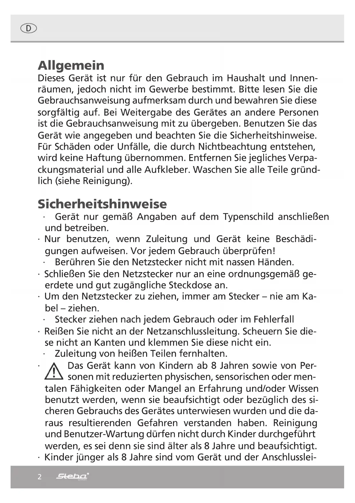 www.steba.com 220-240V~; 50Hz; 600W Standmixer MX 600 Smart Gebrauchsanweisung 2 Instructions for use 8 Mode d´emploi 14 Gebruiksaanwijzing 20 Brugsanvisning 262 Allgemein Dieses Gerät ist nur für den Gebrauch im Haushalt und Innen- räumen, jedoch nicht im Gewerbe bestimmt. Bitte lesen Sie die Gebrauchsanweisung aufmerksam durch und bewahren Sie diese sorgfältig auf. Bei Weitergabe des Gerätes an andere Personen ist die Gebrauchsanweisung mit zu übergeben. Benutzen Sie das Gerät wie angegeben und beachten Sie die Sicherheitshinweise. Für Schäden oder Unfälle, die durch Nichtbeachtung entstehen, wird keine Haftung übernommen. Entfernen Sie jegliches Verpa- ckungsmaterial und alle Aufkleber. Waschen Sie alle Teile gründ- lich (siehe Reinigung). Sicherheitshinweise ∙ Gerät nur gemäß Angaben auf dem Typenschild anschließen und betreiben. ∙ Nur benutzen, wenn Zuleitung und Gerät keine Beschädi- gungen aufweisen. Vor jedem Gebrauch überprüfen! ∙ Berühren Sie den Netzstecker nicht mit nassen Händen. ∙ Schließen Sie den Netzstecker nur an eine ordnungsgemäß ge- erdete und gut zugängliche Steckdose an. ∙ Um den Netzstecker zu ziehen, immer am Stecker – nie am Ka- bel – ziehen. ∙ Stecker ziehen nach jedem Gebrauch oder im Fehlerfall ∙ Reißen Sie nicht an der Netzanschlussleitung. Scheuern Sie die- se nicht an Kanten und klemmen Sie diese nicht ein. ∙ Zuleitung von heißen Teilen fernhalten. ∙ Das Gerät kann von Kindern ab 8 Jahren sowie von Per- sonen mit reduzierten physischen, sensorischen oder men- talen Fähigkeiten oder Mangel an Erfahrung und/oder Wissen benutzt werden, wenn sie beaufsichtigt oder bezüglich des si- cheren Gebrauchs des Gerätes unterwiesen wurden und die da- raus resultierenden Gefahren verstanden haben. Reinigung und Benutzer-Wartung dürfen nicht durch Kinder durchgeführt werden, es sei denn sie sind älter als 8 Jahre und beaufsichtigt. ∙ Kinder jünger als 8 Jahre sind vom Gerät und der Anschlusslei-3 tung fernzuhalten. ∙ Kinder sollten beaufsichtigt werden, um sicherzustellen, dass sie nicht mit dem Gerät oder dem Verpackungsmaterial spielen (z.B. Plastiktüten). ∙ Das Gerät darf nicht mit einer Zeitschaltuhr oder mit einem se- paraten Fernwirksystem betrieben werden! ∙ Lassen Sie das Gerät während des Betriebes niemals ohne Auf- sicht. ∙ Bewahren Sie das Gerät nicht im Freien oder einem feuchten Raum auf. ∙ Tauchen Sie das Gerät niemals ins Wasser. ∙ Benutzen Sie das Gerät niemals nach einer Fehlfunktion, z.B. wenn es heruntergefallen ist oder auf eine andere Weise be- schädigt wurde. ∙ Der Hersteller übernimmt keine Verantwortung bei falschen oder unsachgemäßen Gebrauch, der durch die Nichtbeachtung der Gebrauchsanleitung zustande kommt. ∙ Um Gefährdungen zu vermeiden dürfen Reparaturen am Ge- rät, wie z.B. eine beschädigte Zuleitung austauschen, nur durch einen Kundendienst ausgeführt werden. Es dürfen nur original Ersatzteile verwendet werden. ∙ Das Gerät nur für die in der Bedienungsanleitung beschrie- benen Zwecke benutzen. ∙ Dieses Gerät ist dazu bestimmt im Haushalt und ähnlichen An- wendungen verwendet zu werden wie beispielsweise: o in Küchen für Mitarbeiter in Läden, Büros und anderen gewerblichen Bereichen o in landwirtschaftlichen Anwesen und von Kunden in Ho- tels, Motels und anderen Wohneinrichtungen o in Frühstückspensionen. ∙ Vor dem ersten Gebrauch: Alle Teile gründlich reinigen und trocknen. ∙ Bei Verwendung eines Verlängerungskabels muss dieses einen Querschnitt von 1,5mm² haben. ∙ Bei einer GS-geprüften 16 A Mehrfach-Steckerleiste darf die-4 se wegen Brandgefahr nicht mit mehr wie 3680 Watt belastet werden. ∙ Achten Sie drauf, dass Kinder nicht am Kabel ziehen oder eine Stolperfalle entsteht. ∙ Das Gerät ist bei nicht vorhandener Aufsicht und vor dem Zu- sammenbau, dem Auseinandernehmen oder Reinigen stets vom Netz zu trennen. ∙ Hygiene: Darauf achten, dass das Gerät wegen Bakterien- oder Schimmelbefall immer gereinigt werden soll. ∙ Sicherheitsabschaltung: wird der Deckel während dem Gebrauch geöffnet, schaltet sich das Gerät ab. Reinigung ∙ Achtung! Vor jeder Reinigung Netzstecker ziehen. ∙ Gerät nicht in Wasser tauchen. ∙ Lebensmittelrückstände müssen aus hygienischen Gründen entfernt werden. ∙ Warmes Wasser mit etwas Spülmittel in den Behälter füllen und einige Zeit mixen. Danach gründlich ausspülen. ∙ Den Deckel, sowie den Deckeleinsatz reinigen und abtrocknen. ∙ Vorsicht! Die Messer sind scharf! ∙ Den Motorblock mit einem feuchten Tuch reinigen. ∙ Keine scheuernden oder säurehaltigen Reinigungsmittel, sowie Stahlschwämme benutzen. Arbeitsplatz Wichtig: Das Gerät niemals auf oder neben eine heiße Oberfläche stel- len (z.B. Herdplatte), sondern nur auf einer ebenen, stabilen und temperaturbeständigen Unterlage betreiben. Das Gerät nicht an die Tischkante stellen, damit es nicht von Kindern berührt wer- den kann oder bei Berührung herunterfällt.5 Inbetriebnahme ∙ Lassen Sie das Gerät nie leer laufen, dabei können sich die Lager überhitzen. ∙ Das Gerät nur bis 1250ml mit festen Lebensmitteln befüllen und etwas Flüssigkeit hinzufügen. Flüssige Lebensmittel können bis zu 1750ml gemixt werden. ∙ Den Mixbehälter mit den 2 Nuten auf das Motorteil stecken. ∙ Den Deckel auflegen und mit einer Drehbewegung im Griff einrasten. ∙ Die Nachfüllöffnung im Deckel während dem Mixen nur öffnen, wenn Flüssig- keiten oder Gewürze hinzugefügt werden sollen. ∙ Die maximale Mixdauer sollte 2 Minuten nicht überschreiten, danach eine Pause von 1 Minute einlegen. ∙ Sollte die Übertemperatursicherung des Motors auslösen, den Stecker ziehen und das Gerät abkühlen lassen. Mixen ∙ Das Gerät anschließen, die Power-Taste blinkt. Wird die Taste gedrückt, leuchtet die LED. ∙ Wird die SMART Control Taste gedrückt, blinkt die LED. ∙ Das Automatikprogramm läuft mit unterschied