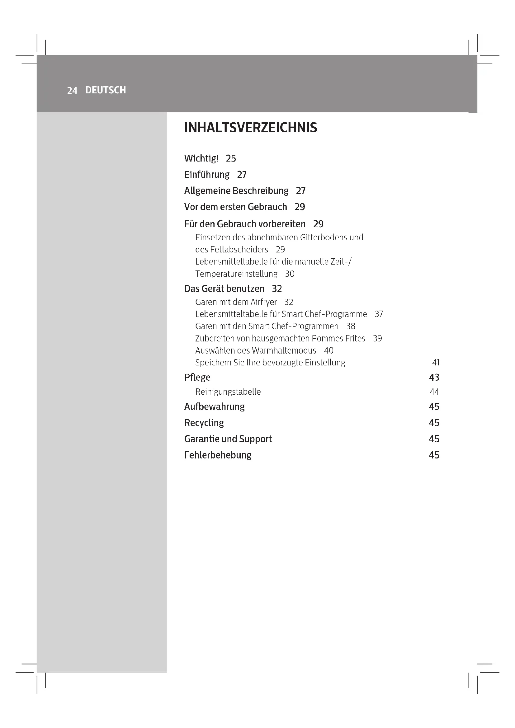 the Philips service hot line or contact the Consumer Care Center in your country.24 DEUTSCH INHALTSVERZEICHNIS Wichtig! 25 Einführung 27 Allgemeine Beschreibung 27 Vor dem ersten Gebrauch 29 Für den Gebrauch vorbereiten 29 Einsetzen des abnehmbaren Gitterbodens und des Fettabscheiders 29 Lebensmitteltabelle für die manuelle Zeit-/ Temperatureinstellung 30 Das Gerät benutzen 32 Garen mit dem Airfryer 32 Lebensmitteltabelle für Smart Chef-Programme 37 Garen mit den Smart Chef-Programmen 38 Zubereiten von hausgemachten Pommes Frites 39 Auswählen des Warmhaltemodus 40 Speichern Sie Ihre bevorzugte Einstellung 41 Pege 43 Reinigungstabelle 44 Aufbewahrung 45 Recycling 45 Garantie und Support 45 Fehlerbehebung 4525 DEUTSCH Wichtig! Lesen Sie diese wichtigen Informationen vor dem Gebrauch des Geräts aufmerksam durch, und bewahren Sie sie für eine spätere Verwendung auf. Achtung! - Tauchen Sie das Gerät niemals in Wasser; spülen Sie es auch nicht unter ießendem Wasser ab. - Achten Sie darauf, dass kein Wasser oder andere Flüssigkeiten in das Gerät eindringen, um Stromschläge zu vermeiden. - Geben Sie die zu bratenden Zutaten in den Korb, damit sie nicht mit den Heizelementen in Kontakt kommen. - Lufteinlass und Luftaustrittsönungen müssen unbedeckt bleiben, während das Gerät in Betrieb ist. - Füllen Sie die Pfanne nicht mit Öl, da sonst Brandgefahr besteht. - Verwenden Sie das Gerät nicht, wenn der Netzstecker, das Netzkabel oder das Gerät selbst defekt oder beschädigt sind. - Berühren Sie nie die Innenseite des Geräts, während es in Betrieb ist. - Befüllen Sie den Korb nie über den angegebenen Maximalpegel. - Stellen Sie jederzeit sicher, dass sich auf dem Heizelement keine Gegenstände oder Lebensmittel benden. Achtung - Wenn das Netzkabel beschädigt ist, muss es von Philips, dessen Kundendienst oder einer ähnlich qualizierten Person ausgetauscht werden, um Gefährdungen zu vermeiden. - Schließen Sie das Gerät nur an eine geerdete Steckdose an. Achten Sie stets darauf, dass der Stecker fest in der Steckdose sitzt. - Dieses Gerät ist nicht dafür geeignet, über einen externen Timer oder ein separates Fernbedienungssystem gesteuert zu werden. - Die zugänglichen Oberächen können während des Betriebs heiß werden. - Dieses Gerät kann von Kindern ab 8 Jahren und Personen mit verringerten physischen, sensorischen oder psychischen Fähigkeiten oder Mangel an Erfahrung und Kenntnis verwendet werden, wenn sie bei der Verwendung beaufsichtigt werden oder Anweisung zum sicheren Gebrauch des Geräts erhalten und die Gefahren verstanden haben. Kinder dürfen nicht mit dem Gerät spielen. Die Reinigung und Wartung darf nicht von Kindern durchgeführt werden, außer Sie sind älter als 8 Jahre und beaufsichtigt. - Bewahren Sie das Gerät und das Kabel außerhalb der Reichweite von Kindern unter 8 Jahren auf. - Stellen Sie das Gerät nicht an einer Wand oder angelehnt an andere Geräte auf. Lassen Sie rund um das Gerät herum mindestens 10 cm Platz frei. Stellen Sie keine Gegenstände auf das Gerät. - Während des Heißluftgarens tritt heißer Dampf aus den Luftaustrittsönungen aus. Halten Sie Hände und Gesicht in sicherer Entfernung vom Dampf und den Luftaustrittsönungen. Achten Sie zudem auf heißen Dampf und heiße Luft, wenn Sie die Pfanne aus dem Gerät nehmen. - Verwenden Sie keine leichten Zutaten und kein Verpackungspapier im Gerät. - Zugängliche Oberächen können während des Betriebs heiß werden.26 DEUTSCH - Lagerung von Kartoeln: Die Temperatur sollte für die gelagerte Kartoelsorte passend sein und über 6°C liegen, um der Gefahr von Acrylamidaufnahme über die fertigen Gerichte vorzubeugen. - Stellen Sie das Gerät nicht auf einen heißen Gas- oder Elektroherd jeglicher Art, elektrische Kochplatten oder in den beheizten Ofen. - Füllen Sie die Pfanne niemals mit Öl. - Dieses Gerät wurde speziell für die Verwendung bei Umgebungstemperaturen zwischen 5°C und 40°C entworfen. - Prüfen Sie, bevor Sie das Gerät in Betrieb nehmen, ob die Spannungsangabe auf dem Gerät mit der örtlichen Netzspannung übereinstimmt. - Achten Sie darauf, dass das Netzkabel nicht in der Nähe heißer Flächen verläuft. - Stellen Sie das Gerät nicht auf oder in der Nähe von brennbaren Materialien auf, wie z. B. Tischdecken oder Vorhängen. - Verwenden Sie das Gerät nie für andere als in dieser Bedienungsanleitung beschriebene Zwecke, und verwenden Sie ausschließlich Original-Zubehör. - Lassen Sie das eingeschaltete Gerät nicht unbeaufsichtigt. - Die Pfanne, der Korb und der Fett-Auangeinsatz werden während und nach dem Gebrauch des Geräts heiß. Seien Sie vorsichtig. - Reinigen Sie vor dem ersten Gebrauch des Geräts alle Teile, die mit Lebensmitteln in Kontakt kommen. Beachten Sie die Anweisungen in der Bedienungsanleitung. Vorsicht - Dieses Gerät ist ausschließlich für die Verwendung in gewöhnlichen Haushalten vorgesehen. Es ist nicht für die Verwendung in Personalküchen von Geschäften, Büros, landwirtschaftlichen Betrieben oder anderen Arbeitsbereichen vorgesehen. Auch ist es nicht für den Gebrauch in Hotels, Motels, Pensionen oder anderen Gastgewerben bestimmt. - Trennen Sie das Gerät immer von der Stromversorgung, wenn Sie es unbeaufsichtigt lassen und bevor Sie es zusammensetzen, auseinandernehmen, verwahren oder reinigen. - Stellen Sie das Gerät auf eine waagerechte, ebene und stabile Unterlage. - Bei unsachgemäßem Gebrauch oder Verwendung für halbprofessionelle oder professionelle Zwecke oder bei Nichtbeachtung der Anweisungen in der Bedienungsanleitung erlischt die Garantie. In diesem Fall lehnt Philips jegliche Haftung für entstandene Schäden ab. - Geben Sie das Gerät zur Überprüfung bzw. Reparatur stets an ein Philips Servicecenter. Versuchen Sie nicht, das Gerät selbst zu reparieren, da andernfalls Ihre Garantie erlischt. - Ziehen Sie nach jedem Gebrauch den Netzstecker aus der Steckdose. - Lassen Sie das Gerät ca. 30 Minuten a