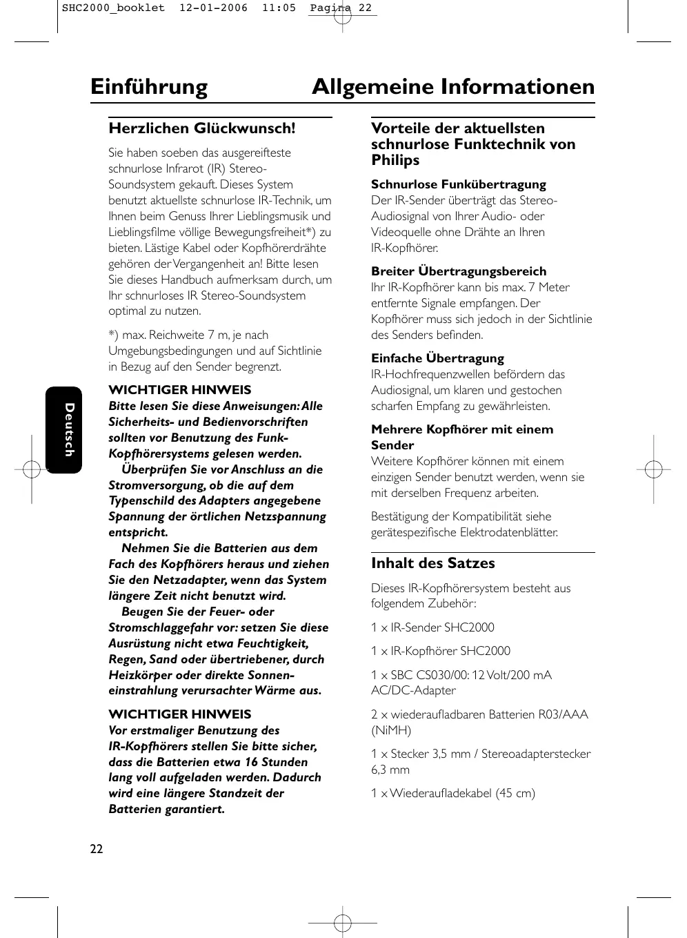 Español SHC2000_booklet SHC2000_booklet 12-01-2006 11:05 Einführung Pagina 22 Allgemeine Informationen Herzlichen Glückwunsch! Sie haben soeben das ausgereifteste schnurlose Infrarot (IR) StereoSoundsystem gekauft. Dieses System benutzt aktuellste schnurlose IR-Technik, um Ihnen beim Genuss Ihrer Lieblingsmusik und Lieblingsfilme völlige Bewegungsfreiheit*) zu bieten. Lästige Kabel oder Kopfhörerdrähte gehören der Vergangenheit an! Bitte lesen Sie dieses Handbuch aufmerksam durch, um Ihr schnurloses IR Stereo-Soundsystem optimal zu nutzen. *) max. Reichweite 7 m, je nach Umgebungsbedingungen und auf Sichtlinie in Bezug auf den Sender begrenzt. Deutsch WICHTIGER HINWEIS Bitte lesen Sie diese Anweisungen:Alle Sicherheits- und Bedienvorschriften sollten vor Benutzung des FunkKopfhörersystems gelesen werden. Überprüfen Sie vor Anschluss an die Stromversorgung, ob die auf dem Typenschild des Adapters angegebene Spannung der örtlichen Netzspannung entspricht. Nehmen Sie die Batterien aus dem Fach des Kopfhörers heraus und ziehen Sie den Netzadapter, wenn das System längere Zeit nicht benutzt wird. Beugen Sie der Feuer- oder Stromschlaggefahr vor: setzen Sie diese Ausrüstung nicht etwa Feuchtigkeit, Regen, Sand oder übertriebener, durch Heizkörper oder direkte Sonneneinstrahlung verursachter Wärme aus. WICHTIGER HINWEIS Vor erstmaliger Benutzung des IR-Kopfhörers stellen Sie bitte sicher, dass die Batterien etwa 16 Stunden lang voll aufgeladen werden. Dadurch wird eine längere Standzeit der Batterien garantiert.