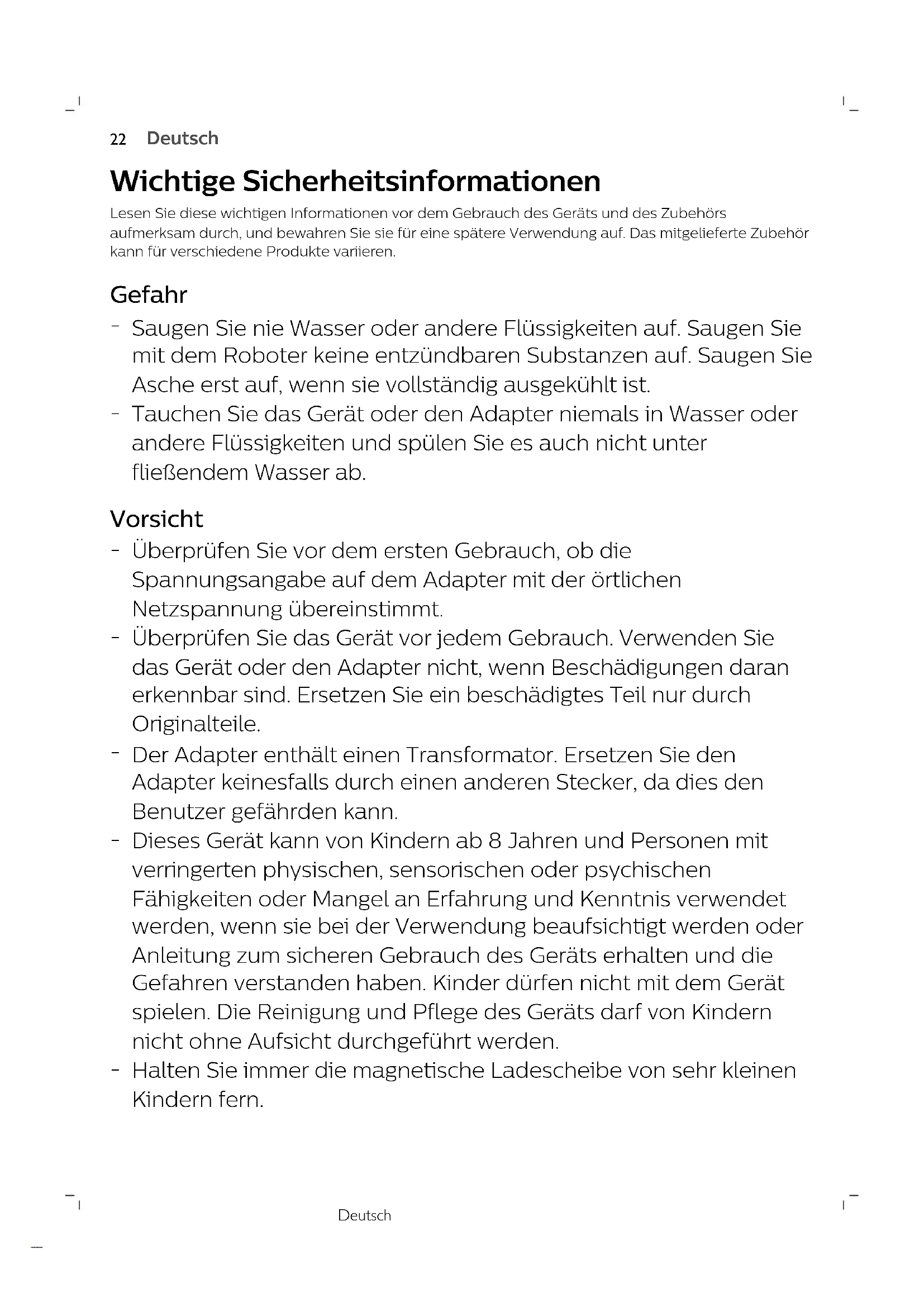 Saugen Sie nie Wasser oder andere Flüssigkeiten auf. Saugen Sie mit dem Roboter keine entzündbaren Substanzen auf. Saugen Sie Asche erst auf, wenn sie vollständig ausgekühlt ist.