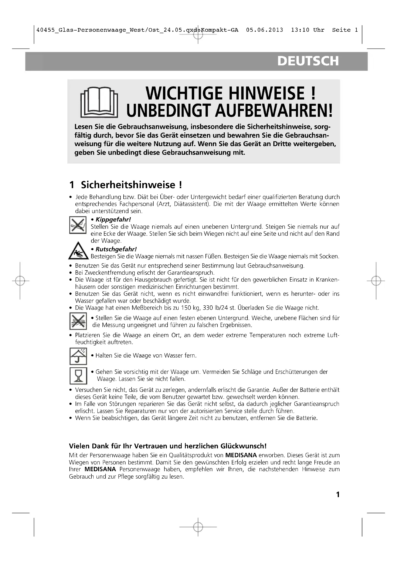- Jede Behandlung bzw. Diät bei Über- oder Untergewicht bedarf einer qualifizierten Beratung durch entsprechendes Fachpersonal (Arzt, Diätassistent). Die mit der Waage ermittelten Werte könnendabei unterstützend sein.• Kippgefahr!Stellen Sie die Waage niemals auf einen unebenen Untergrund. Steigen Sie niemals nur aufeine Ecke der Waage. Stellen Sie sich beim Wiegen nicht auf eine Seite und nicht auf den Randder Waage.• Rutschgefahr!Besteigen Sie die Waage niemals mit nassen Füßen. Besteigen Sie die Waage niemals mit Socken. Benutzen Sie das Gerät nur entsprechend seiner Bestimmung laut Gebrauchsanweisung. Bei Zweckentfremdung erlischt der Garantieanspruch. Die Waage ist für den Hausgebrauch gefertigt. Sie ist nicht für den gewerblichen Einsatz in Kranken-häusern oder sonstigen medizinischen Einrichtungen bestimmt. Benutzen Sie das Gerät nicht, wenn es nicht einwandfrei funktioniert, wenn es herunter- oder insWasser gefallen war oder beschädigt wurde. Die Waage hat einen Meßbereich bis zu 150 kg, 330 lb/24 st. Überladen Sie die Waage nicht. Stellen Sie die Waage auf einen festen ebenen Untergrund. Weiche, unebene Flächen sind fürdie Messung ungeeignet und führen zu falschen Ergebnissen. Platzieren Sie die Waage an einem Ort, an dem weder extreme Temperaturen noch extreme Luft-feuchtigkeit auftreten. Halten Sie die Waage von Wasser fern. Gehen Sie vorsichtig mit der Waage um. Vermeiden Sie Schläge und Erschütterungen derWaage. Lassen Sie sie nicht fallen. Versuchen Sie nicht, das Gerät zu zerlegen, andernfalls erlischt die Garantie. Außer der Batterie enthältdieses Gerät keine Teile, die vom Benutzer gewartet bzw. gewechselt werden können. Im Falle von Störungen reparieren Sie das Gerät nicht selbst, da dadurch jeglicher Garantieansprucherlischt. Lassen Sie Reparaturen nur von der autorisierten Service stelle durch führen. Wenn Sie beabsichtigen, das Gerät längere Zeit nicht zu benutzen, entfernen Sie die Batterie. Vielen Dank für Ihr Vertrauen und herzlichen Glückwunsch! Mit der Personenwaage haben Sie ein Qualitätsprodukt von MEDISANA erworben. Dieses Gerät ist zum Wiegen von Personen bestimmt. Damit Sie den gewünschten Erfolg erzielen und recht lange Freude an Ihrer MEDISANA Personenwaage haben, empfehlen wir Ihnen, die nachstehenden Hinweise zum Gebrauch und zur Pflege sorgfältig zu lesen. 40455_Glas-Personenwaage_West/Ost_24.05.qxd:Kompakt-GA 05.06.2013 13:10 Uhr Seite 122 DEUTSCH 2 Lieferumfang und Verpackung Bitte prüfen Sie zunächst, ob das Gerät vollständig ist und keinerlei Beschädigung aufweist. Im Zweifelsfalle nehmen Sie das Gerät nicht in Betrieb und wenden Sie sich an Ihren Händler oder an Ihre Servicestelle. Zum Lieferumfang gehören: