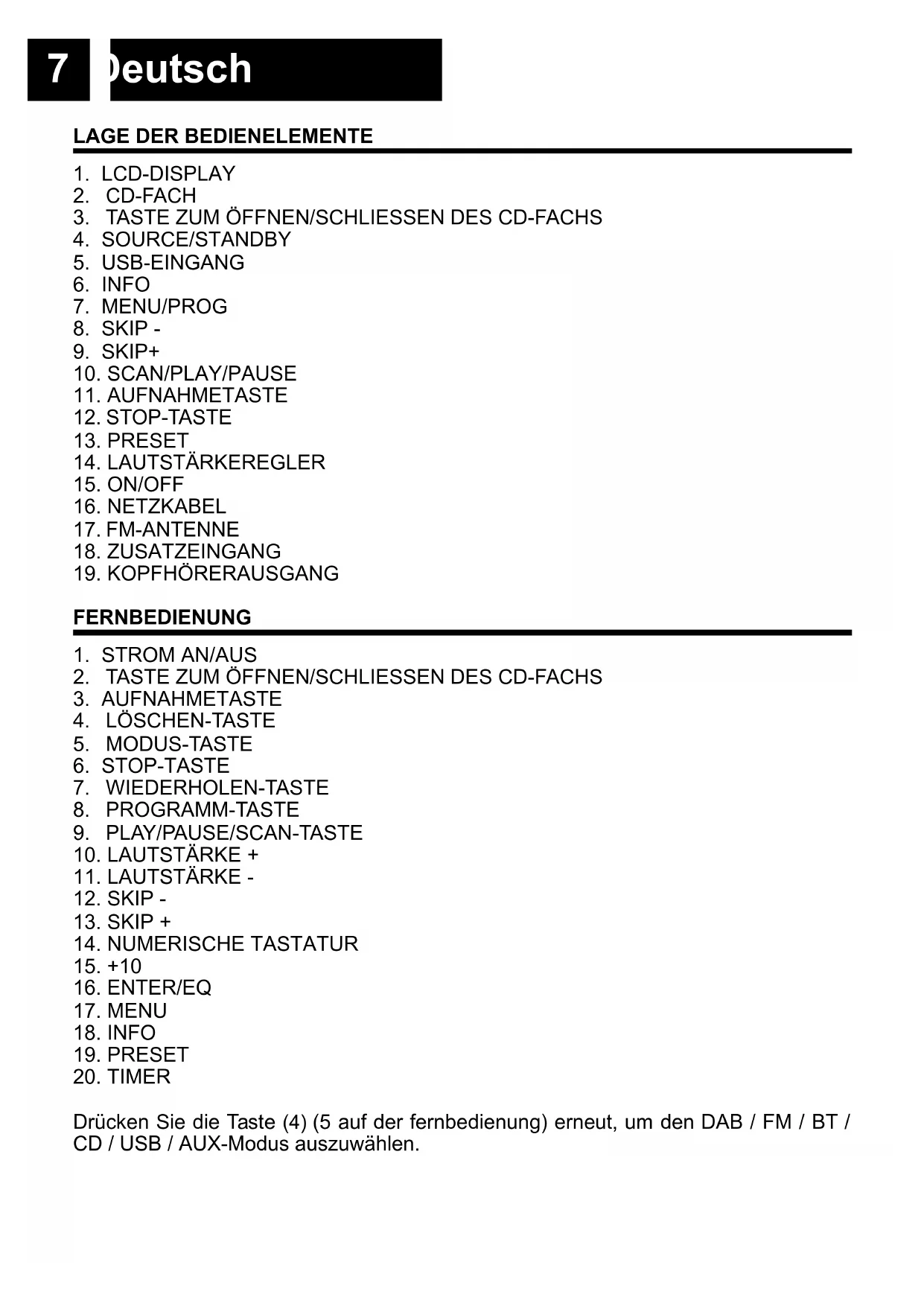 dergabe zu stoppen. Drücken Sie STOP (12) (6 auf der fernbedienung) zweimal, um das Programm zu löschen. AUX-IN Dieses Gerät bietet einen zusätzlichen Audioeingang zum Anschluss externer Audio- geräte wie MP3-Player, CD-Player und ermöglicht die Wiedergabe aus Ihrer externen12 Deutsch Quelle über die Lautsprecher der Anlage.