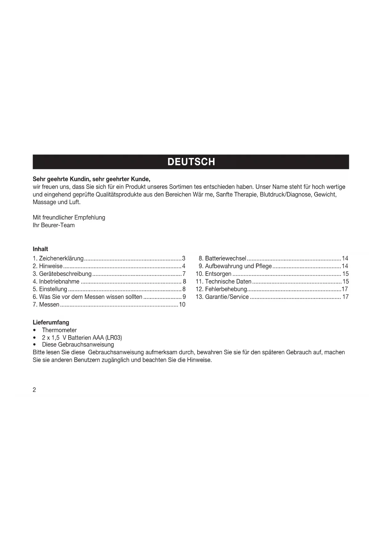 - PL Termometr wielofunkcyjny Instrukcja obsługi Sehr geehrte Kundin, sehr geehrter Kunde, wir freuen uns, dass Sie sich für ein Produkt unseres Sortimen tes entschieden haben. Unser Name steht für hoch wertige und eingehend geprüfte Qualitätsprodukte aus den Bereichen Wär me, Sanfte Therapie, Blutdruck/Diagnose, Gewicht, Massage und Luft. Mit freundlicher Empfehlung Ihr Beurer-Team p. 1182