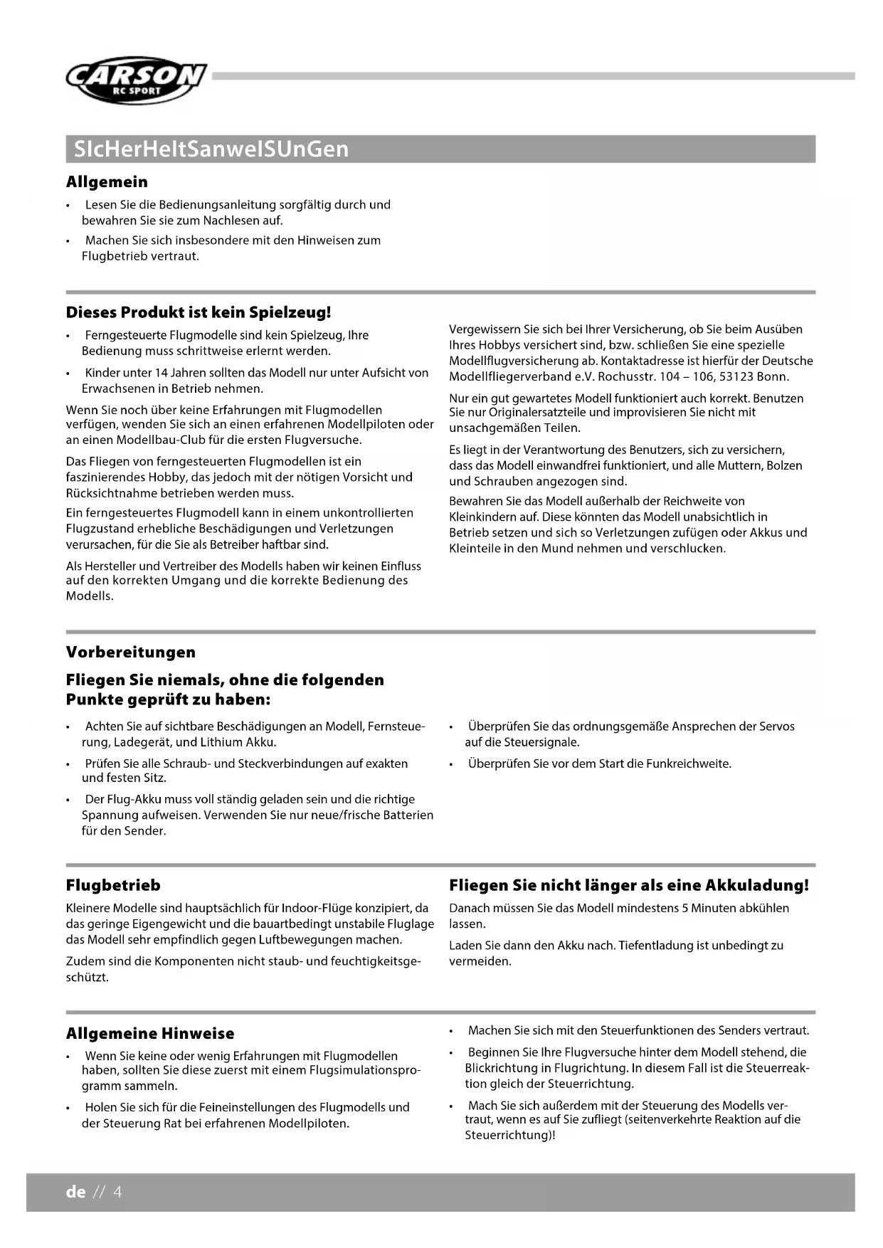 - Kinderunter14JahrensolltendasModellnurunterAufsichtvon Erwachsenen in Betrieb nehmen. Wenn Sie noch über keine Erfahrungen mit Flugmodellen verfügen, wenden Sie sich an einen erfahrenen Modellpiloten oder an einen Modellbau-Club für die ersten Flugversuche. Das Fliegen von ferngesteuerten Flugmodellen ist ein faszinierendes Hobby, das jedoch mit der nötigen Vorsicht und Rücksichtnahme betrieben werden muss. Ein ferngesteuertes Flugmodell kann in einem unkontrollierten Flugzustand erhebliche Beschädigungen und Verletzungen verursachen, für die Sie als Betreiber haftbar sind. Als Hersteller und Vertreiber des Modells haben wir keinen Einfluss auf den korrekten Umgang und die korrekte Bedienung des Modells. Vergewissern Sie sich bei Ihrer Versicherung, ob Sie beim Ausüben Ihres Hobbys versichert sind, bzw. schließen Sie eine spezielle Modellflugversicherung ab. Kontaktadresse ist hierfür der Deutsche Modellfliegerverband e.V. Rochusstr. 104 – 106, 53123 Bonn. Nur ein gut gewartetes Modell funktioniert auch korrekt. Benutzen Sie nur Originalersatzteile und improvisieren Sie nicht mit unsachgemäßen Teilen. Es liegt in der Verantwortung des Benutzers, sich zu versichern, dass das Modell einwandfrei funktioniert, und alle Muttern, Bolzen und Schrauben angezogen sind. Bewahren Sie das Modell außerhalb der Reichweite von Kleinkindern auf. Diese könnten das Modell unabsichtlich in Betrieb setzen und sich so Verletzungen zufügen oder Akkus und Kleinteile in den Mund nehmen und verschlucken. Vorbereitungen Fliegen Sie niemals, ohne die folgenden Punkte geprüft zu haben: