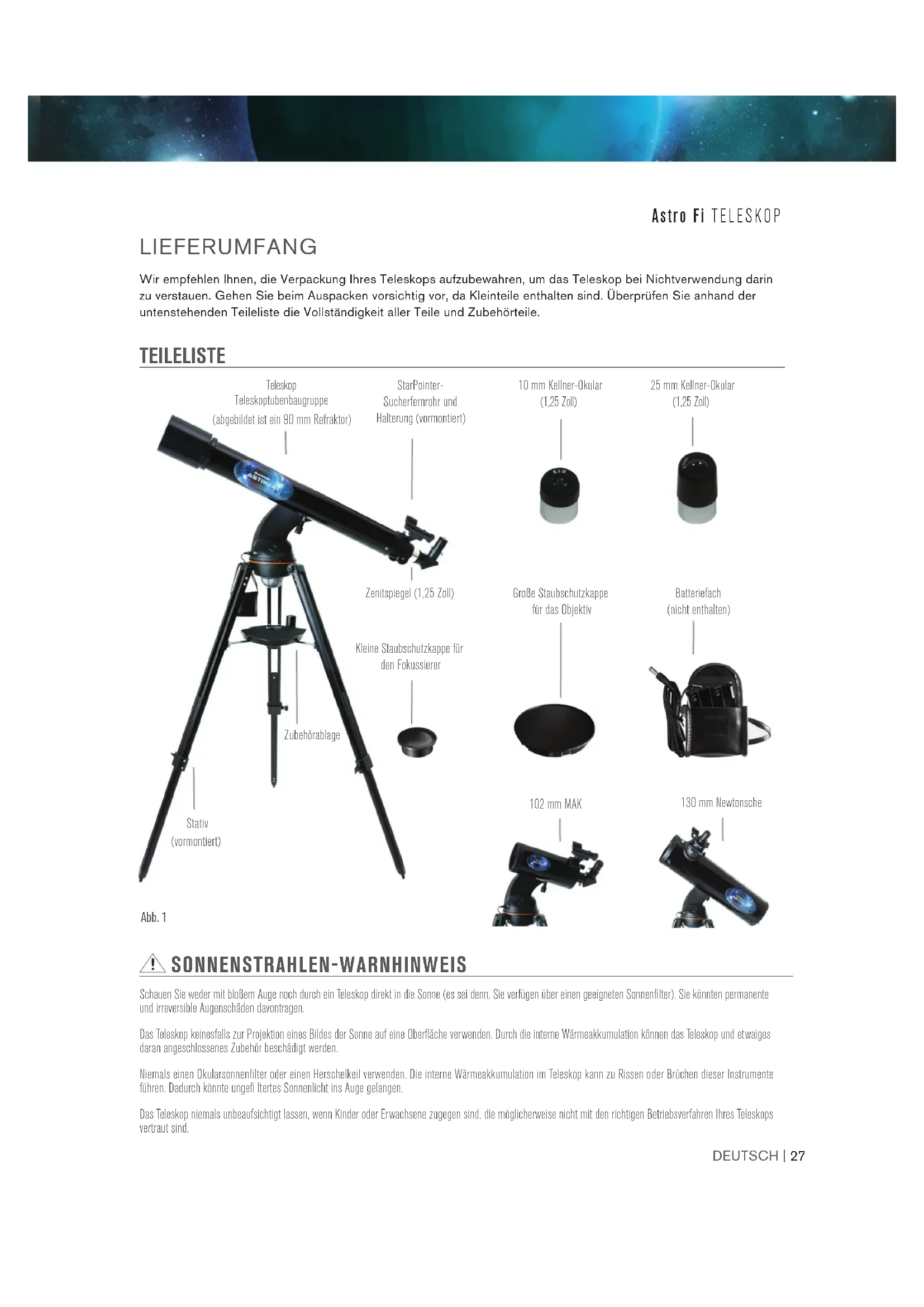 MODELL-NR. 22201, 22202, 22203 90 mm Refraktor 102 mm Maksutov 130 mm Newtonsche26 | DEUTSCH Astro Fi TELESKOPDEUTSCH | 27 Astro Fi TELESKOP 130 mm Newtonsche 102 mm MAK StarPointer- Sucherfernrohr und Halterung (vormontiert) SONNENSTRAHLEN-WARNHINWEIS Schauen Sie weder mit bloßem Auge noch durch ein Teleskop direkt in die Sonne (es sei denn, Sie verfügen über einen geeigneten Sonnenfi lter). Sie könnten permanente und irreversible Augenschäden davontragen. Das Teleskop keinesfalls zur Projektion eines Bildes der Sonne auf eine Oberfl äche verwenden. Durch die interne Wärmeakkumulation können das Teleskop und etwaiges daran angeschlossenes Zubehör beschädigt werden. Niemals einen Okularsonnenfilter oder einen Herschelkeil verwenden. Die interne Wärmeakkumulation im Teleskop kann zu Rissen oder Brüchen dieser Instrumente führen. Dadurch könnte ungefi ltertes Sonnenlicht ins Auge gelangen. Das Teleskop niemals unbeaufsichtigt lassen, wenn Kinder oder Erwachsene zugegen sind, die möglicherweise nicht mit den richtigen Betriebsverfahren Ihres Teleskops vertraut sind. Wir empfehlen Ihnen, die Verpackung Ihres Teleskops aufzubewahren, um das Teleskop bei Nichtverwendung darin zu verstauen. Gehen Sie beim Auspacken vorsichtig vor, da Kleinteile enthalten sind. Überprüfen Sie anhand der untenstehenden Teileliste die Vollständigkeit aller Teile und Zubehörteile. TEILELISTE LIEFERUMFANG Teleskop Teleskoptubenbaugruppe (abgebildet ist ein 90 mm Refraktor) Zenitspiegel (1,25 Zoll) Batteriefach (nicht enthalten) Abb. 1 Zubehörablage Stativ (vormontiert) Kleine Staubschutzkappe für den Fokussierer Große Staubschutzkappe für das Objektiv 10 mm Kellner-Okular (1,25 Zoll) 25 mm Kellner-Okular (1,25 Zoll)28 | DEUTSCH Astro Fi TELESKOP VORAUSSETZUNGEN Ihr Astro Fi-Teleskop benötigt eine der folgenden Energiequellen: