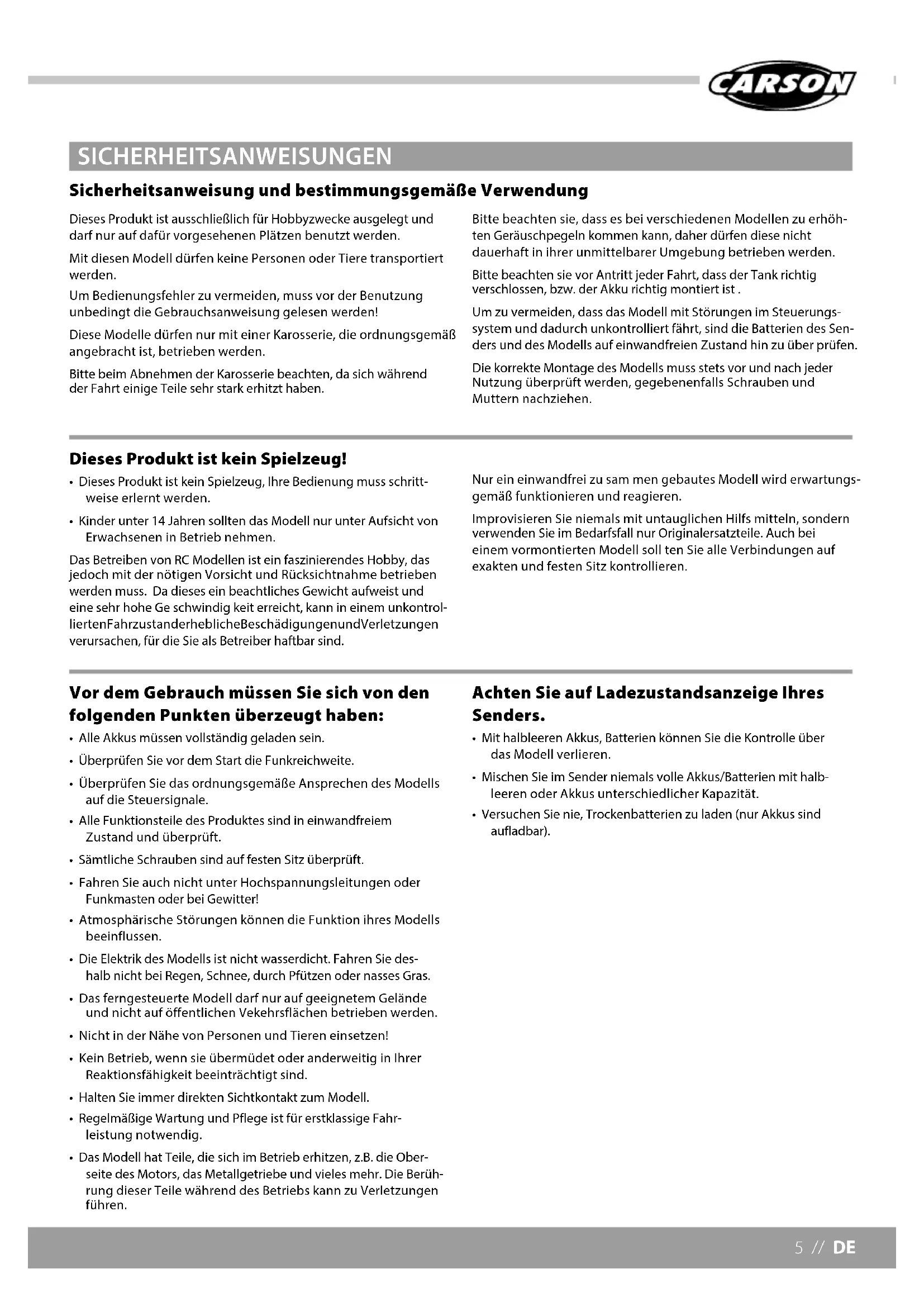 DE // Wichtiger Hinweis GB // Important information FR // Remarque importante IT // Nota importante ES // Nota importante NL // Belangrijke aanwijzing Bitte überprüfen sie vor der ersten Inbetriebnahme ihres Produktes oder vor jeder Ersatzteilbestellung, ob sich ihr Handbuch auf dem aktuellsten Stand befindet. Dieses Handbuch enthält die technischen Anlagen, wichtige Anleitungen zur korrekten Inbetriebnahme und Nutzung sowie Produktinformation entsprechend dem aktuellen Stand vor der Drucklegung. Der Inhalt dieses Handbuchs und die technischen Daten des Produkts können ohne vorherige Ankündigung geändert werden. Den aktuellsten Stand ihres Handbuches finden sie unter: www.carson-modelsport.com Before using your product for the first time or ordering any spare parts, check that your manual is fully up-to-date. This manual contains the technical appendices, important instructions for correct start-up and use and product information, all fully up-to- date before going to press. The contents of this manual and the technical data of the product can change without prior notice. For the latest version of your manual, see: www.carson-modelsport.com Avant de mettre en service le produit ou de commander des pièces détachées, assurez-vous que vous possédez bien la dernière version du manuel. Ce manuel contient des indications techniques, des instructions importantes pour bien mettre en service et utiliser l’appareil, ainsi que des informations sur le produit correspondant à l’état des connaissances à la date d’impression. Le contenu du manuel et les caractéristiques techniques du produit peuvent être modifiées sans annonce préalable. Vous trouverez la version actuelle du manuel à l’adresse suivante: www.carson-modelsport.com Prima della prima messa in funzione del prodotto o prima di ogni ordinazione di ricambi verificare se il manuale a disposizione corrisponde alla versione più recente. Il presente manuale contiene gli allegati tecnici, le istruzioni importanti per la corretta messa in funzione e il corretto utilizzo, nonché le informazioni sul prodotto che corrispondono allo stato attuale prima della stampa. Il contenuto del presente manuale e i dati tecnici del prodotto possono essere modificati senza preavviso. La versione più aggiornata del presente manuale è disponibile al seguente link: www.carson-modelsport.com Antes de la primera puesta en funcionamiento de su producto y cada vez que solicite piezas de recambio compruebe que su manual se encuentra actualizado. Este manual contiene datos técnicos, instrucciones importantes para una puesta en funcionamiento adecuada y el uso así como información del producto conforme al estado más actual antes de la impresión. El contenido de este manual y los datos técnicos del producto pueden modificarse sin previo aviso. Encontrará la versión actualizada del manual en: www.carson-modelsport.com Controleer voor de eerste ingebruikneming van uw product of voor elke bestelling van vervangende onderdelen of uw handboek up-to-date is. Dit handboek bevat de technische bijlagen, belangrijke aanwijzingen voor de juiste inbedrijfstelling en het gebruik, alsmede productie-informatie volgens de actuele stand voor het ter perse gaan. De inhoud van dit handboek en de technische productspecificaties kunnen zonder voorafgaande aankondiging worden gewijzigd. De meest actuele stand van uw handboek is te vinden onder: www.carson-modelsport.com3 // DE Sehr geehrter Kunde Wir beglückwünschen Sie zum Kauf Ihres CARSON Produktes, welches nach dem heutigen Stand der Technik gefertigt wurde. Da wir stets um Weiterentwicklung und Verbesserung unserer Produkte bemüht sind, behalten wir uns eine Änderung in tech- nischer Hinsicht und in Bezug auf Ausstattung, Materialien und Design jederzeit und ohne Ankündigung vor. Aus geringfügigen Abweichungen des Ihnen vorliegenden Produktes gegenüber Daten und Abbildungen dieser Anleitung können daher keinerlei Ansprüche abgeleitet werden. Diese Bedienungsanleitung ist Bestandteil des Produkts. Bei Nichtbeachtung der Bedienungsanleitung und der enthaltenen Sicherheitsanweisungen erlischt der Garantieanspruch. Bewahren Sie diese Anleitung zum Nachlesen und für die even tuelle Weitergabe des Produktes an Dritte auf. Garantiebedingungen Für dieses Produkt leistet CARSON eine Garantie von 24 Monaten betreffend Fehler bei der Herstellung in Bezug auf Material und Fertigung bei normalem Gebrauch ab dem Kauf beim autorisier- ten Fachhändler. Im Falle eines Defekts während der Garantiezeit bringen Sie das Produkt zusammen mit dem Kaufbeleg zu Ihrem Fachhändler. CARSON wird nach eigener Entscheidung, falls nicht anders im Gesetz vorgesehen: (a) Den Defekt durch Reparatur kostenlos in Bezug auf Material und Arbeit beheben; (b) Das Produkt durch ein gleichartiges oder im Aufbau ähnliches ersetzen. Alle ersetzten Teile und Produkte, für die Ersatz geleistet wird, werden zum Eigentum von CARSON. Im Rahmen der Garantie- leistungen dürfen neue oder wiederaufbereitete Teile verwendet werden. Auf reparierte oder ersetzte Teile gilt eine Garantie für die Restlauf- zeit der ursprünglichen Garantiefrist. Nach Ablauf der Garantiefrist vorgenommene Reparaturen oder gelieferte Ersatzteile werden in Rechnung gestellt. Von der Garantie ausgeschlossen sind:
