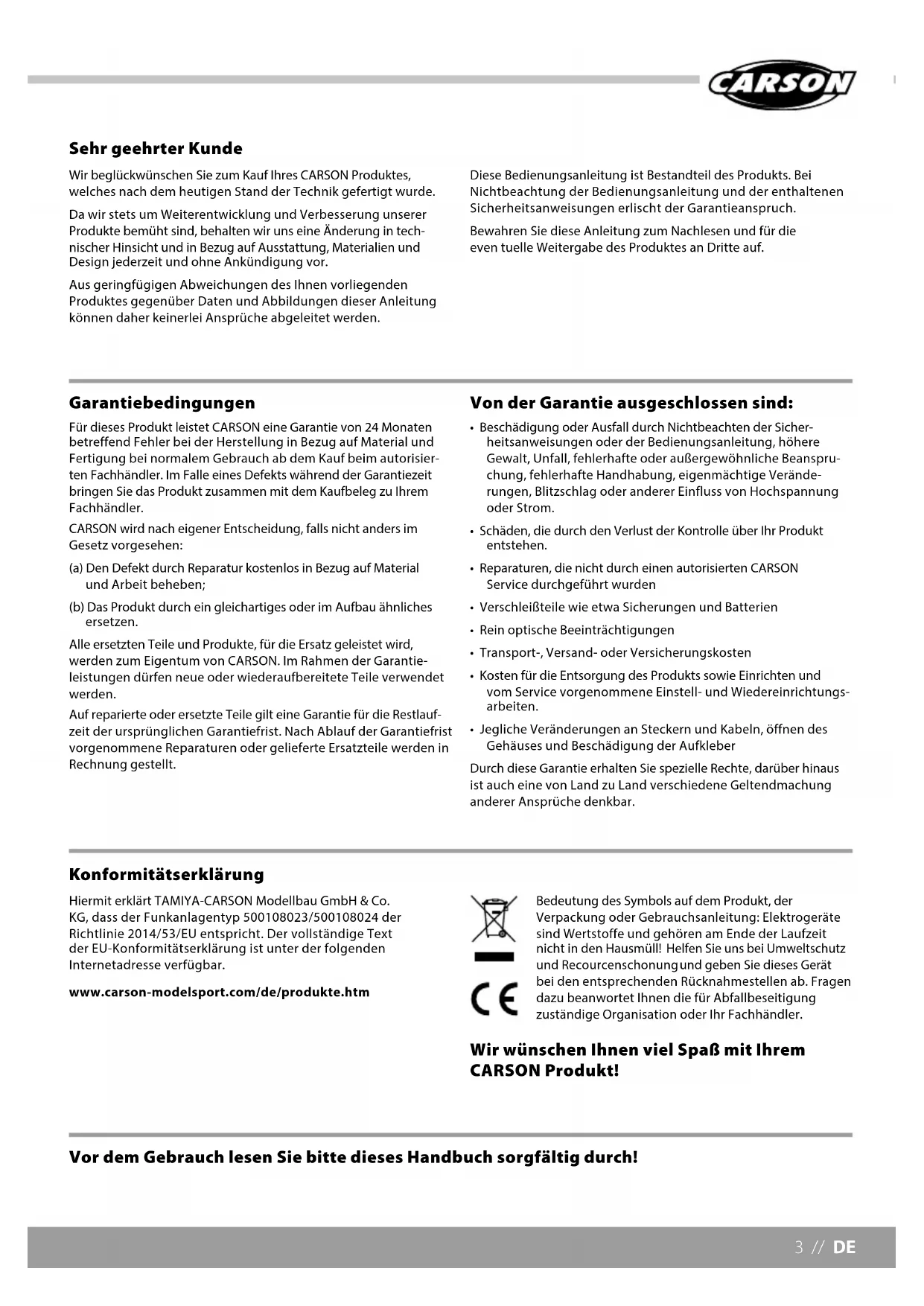DE // Wichtiger Hinweis GB // Important information FR // Remarque importante IT // Nota importante ES // Nota importante NL // Belangrijke aanwijzing Bitte überprüfen sie vor der ersten Inbetriebnahme ihres Produktes oder vor jeder Ersatzteilbestellung, ob sich ihr Handbuch auf dem aktuellsten Stand befindet. Dieses Handbuch enthält die technischen Anlagen, wichtige Anleitungen zur korrekten Inbetriebnahme und Nutzung sowie Produktinformation entsprechend dem aktuellen Stand vor der Drucklegung. Der Inhalt dieses Handbuchs und die technischen Daten des Produkts können ohne vorherige Ankündigung geändert werden. Den aktuellsten Stand ihres Handbuches finden sie unter: www.carson-modelsport.com Before using your product for the first time or ordering any spare parts, check that your manual is fully up-to-date. This manual contains the technical appendices, important instructions for correct start-up and use and product information, all fully up-to- date before going to press. The contents of this manual and the technical data of the product can change without prior notice. For the latest version of your manual, see: www.carson-modelsport.com Avant de mettre en service le produit ou de commander des pièces détachées, assurez-vous que vous possédez bien la dernière version du manuel. Ce manuel contient des indications techniques, des instructions importantes pour bien mettre en service et utiliser l’appareil, ainsi que des informations sur le produit correspondant à l’état des connaissances à la date d’impression. Le contenu du manuel et les caractéristiques techniques du produit peuvent être modifiées sans annonce préalable. Vous trouverez la version actuelle du manuel à l’adresse suivante: www.carson-modelsport.com Prima della prima messa in funzione del prodotto o prima di ogni ordinazione di ricambi verificare se il manuale a disposizione corrisponde alla versione più recente. Il presente manuale contiene gli allegati tecnici, le istruzioni importanti per la corretta messa in funzione e il corretto utilizzo, nonché le informazioni sul prodotto che corrispondono allo stato attuale prima della stampa. Il contenuto del presente manuale e i dati tecnici del prodotto possono essere modificati senza preavviso. La versione più aggiornata del presente manuale è disponibile al seguente link: www.carson-modelsport.com Antes de la primera puesta en funcionamiento de su producto y cada vez que solicite piezas de recambio compruebe que su manual se encuentra actualizado. Este manual contiene datos técnicos, instrucciones importantes para una puesta en funcionamiento adecuada y el uso así como información del producto conforme al estado más actual antes de la impresión. El contenido de este manual y los datos técnicos del producto pueden modificarse sin previo aviso. Encontrará la versión actualizada del manual en: www.carson-modelsport.com Controleer voor de eerste ingebruikneming van uw product of voor elke bestelling van vervangende onderdelen of uw handboek up-to-date is. Dit handboek bevat de technische bijlagen, belangrijke aanwijzingen voor de juiste inbedrijfstelling en het gebruik, alsmede productie-informatie volgens de actuele stand voor het ter perse gaan. De inhoud van dit handboek en de technische productspecificaties kunnen zonder voorafgaande aankondiging worden gewijzigd. De meest actuele stand van uw handboek is te vinden onder: www.carson-modelsport.com3 // DE Sehr geehrter Kunde Wir beglückwünschen Sie zum Kauf Ihres CARSON Produktes, welches nach dem heutigen Stand der Technik gefertigt wurde. Da wir stets um Weiterentwicklung und Verbesserung unserer Produkte bemüht sind, behalten wir uns eine Änderung in tech- nischer Hinsicht und in Bezug auf Ausstattung, Materialien und Design jederzeit und ohne Ankündigung vor. Aus geringfügigen Abweichungen des Ihnen vorliegenden Produktes gegenüber Daten und Abbildungen dieser Anleitung können daher keinerlei Ansprüche abgeleitet werden. Diese Bedienungsanleitung ist Bestandteil des Produkts. Bei Nichtbeachtung der Bedienungsanleitung und der enthaltenen Sicherheitsanweisungen erlischt der Garantieanspruch. Bewahren Sie diese Anleitung zum Nachlesen und für die even tuelle Weitergabe des Produktes an Dritte auf. Garantiebedingungen Für dieses Produkt leistet CARSON eine Garantie von 24 Monaten betreffend Fehler bei der Herstellung in Bezug auf Material und Fertigung bei normalem Gebrauch ab dem Kauf beim autorisier- ten Fachhändler. Im Falle eines Defekts während der Garantiezeit bringen Sie das Produkt zusammen mit dem Kaufbeleg zu Ihrem Fachhändler. CARSON wird nach eigener Entscheidung, falls nicht anders im Gesetz vorgesehen: (a) Den Defekt durch Reparatur kostenlos in Bezug auf Material und Arbeit beheben; (b) Das Produkt durch ein gleichartiges oder im Aufbau ähnliches ersetzen. Alle ersetzten Teile und Produkte, für die Ersatz geleistet wird, werden zum Eigentum von CARSON. Im Rahmen der Garantie- leistungen dürfen neue oder wiederaufbereitete Teile verwendet werden. Auf reparierte oder ersetzte Teile gilt eine Garantie für die Restlauf- zeit der ursprünglichen Garantiefrist. Nach Ablauf der Garantiefrist vorgenommene Reparaturen oder gelieferte Ersatzteile werden in Rechnung gestellt. Von der Garantie ausgeschlossen sind: