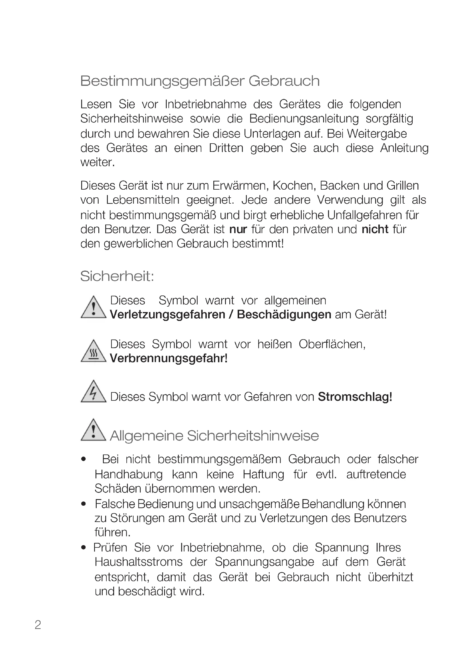Bestimmungsgemäßer Gebrauch Lesen Sie vor Inbetriebnahme des Gerätes die folgenden Sicherheitshinweise sowie die Bedienungsanleitung sorgfältig durch und bewahren Sie diese Unterlagen auf. Bei Weitergabe des Gerätes an einen Dritten geben Sie auch diese Anleitung weiter. Dieses Gerät ist nur zum Erwärmen, Kochen, Backen und Grillen von Lebensmitteln geeignet. Jede andere Verwendung gilt als nicht bestimmungsgemäß und birgt erhebliche Unfallgefahren für den Benutzer. Das Gerät ist nur für den privaten und nicht für den gewerblichen Gebrauch bestimmt! Sicherheit: Dieses Symbol warnt vor allgemeinen Verletzungsgefahren / Beschädigungen am Gerät! Dieses Symbol warnt vor heißen Oberächen, Verbrennungsgefahr! Dieses Symbol warnt vor Gefahren von Stromschlag! Allgemeine Sicherheitshinweise