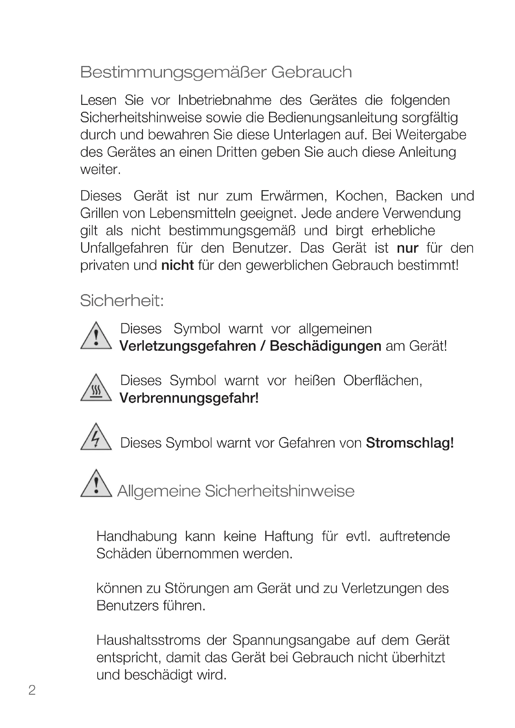 - Verwenden Siedieses Gerätnicht zusammen mit einerexternenZeitschaltuhrodereinemseparaten Fernwirksystem. Gerätebezogene Sicherheitshinweise Warnung! Zur Vermeidung von Verletzungen/ Beschädigungen des Gerätes, elektrischem Schock, eines Brandes und Verbrennungen!