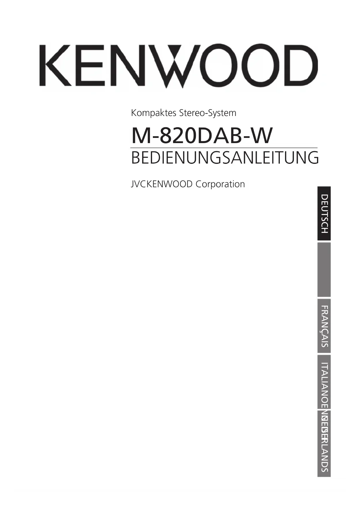 Kompaktes Stereo-System M-820DAB-W BEDIENUNGSANLEITUNG JVCKENWOOD Corporation DEUTSCH FRANÇAIS ITALIANOENGLISH NEDERLANDSVor der Inbetriebnahme Inhalt Vor Einschalten der Spannungsversorgung Sicherheitshinweise Vor der Inbetriebnahme Anschließen Handhabung von CDs Wissenswertes über USB-Geräte Komponentennamen und –funktionen Grundfunktionen Anschalten des Systems Ausschalten in Standby Lautstärkeregler Einstellen des Klangs Verwendung von CD und USB Vorbereitung Wiedergabe von CD oder Audiodatei (USB, CD) Auswählen eines Ordners (nur Audiodateien) Programmieren von Titeln und Dateien - Vorgehensweise bei Audio-CD - Vorgehensweise bei Audiodateien Zufallswiedergabe und Wiederholungsfunktion - Vorgehensweise bei Audio-CD - Vorgehensweise bei Audiodateien Verwendung des DAB+ Radios Einstellen der DAB+ Sender Anwählen eines DAB+ Senders Speichern von Stationen im Senderspeicher Erweiterte DAB+ Informationen Menüfunktionen DAB+ Verwendung des UKW Radios Einstellen der UKW Sender Speichern von Stationen im Senderspeicher Menüfunktionen UKW Verwendung von BLUETOOTH Koppeln von BLUETOOTH-Geräten Wiedergabe über BLUETOOTH Verwendung von Line-In Abspielen eines externen Zuspielers Störungsbehebung Allgemeine Informationen WartungundPege Entsorgung Technische Daten Garantie