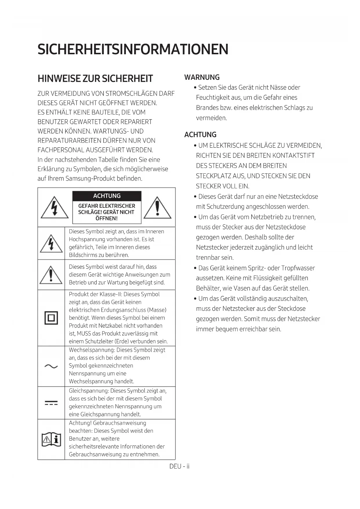 FACHPERSONAL AUSGEFÜHRT WERDEN. In der nachstehenden Tabelle nden Sie eine Erklärung zu Symbolen, die sich möglicherweise auf Ihrem Samsung-Produkt benden. ACHTUNG GEFAHR ELEKTRISCHER SCHLÄGE! GERÄT NICHT ÖFFNEN!Dieses Symbol zeigt an, dass im Inneren Hochspannung vorhanden ist. Es ist gefährlich, Teile im Inneren dieses Bildschirms zu berühren.Dieses Symbol weist darauf hin, dass diesem Gerät wichtige Anweisungen zum Betrieb und zur Wartung beigefügt sind.Produkt der Klasse-II: Dieses Symbol zeigt an, dass das Gerät keinen elektrischen Erdungsanschluss (Masse) benötigt. Wenn dieses Symbol bei einem Produkt mit Netzkabel nicht vorhanden ist, MUSS das Produkt zuverlässig mit einem Schutzleiter (Erde) verbunden sein.Wechselspannung: Dieses Symbol zeigt an, dass es sich bei der mit diesem Symbol gekennzeichneten Nennspannung um eine Wechselspannung handelt.Gleichspannung: Dieses Symbol zeigt an, dass es sich bei der mit diesem Symbol gekennzeichneten Nennspannung um eine Gleichspannung handelt.Achtung! Gebrauchsanweisung beachten: Dieses Symbol weist den Benutzer an, weitere sicherheitsrelevante Informationen der Gebrauchsanweisung zu entnehmen. WARNUNG