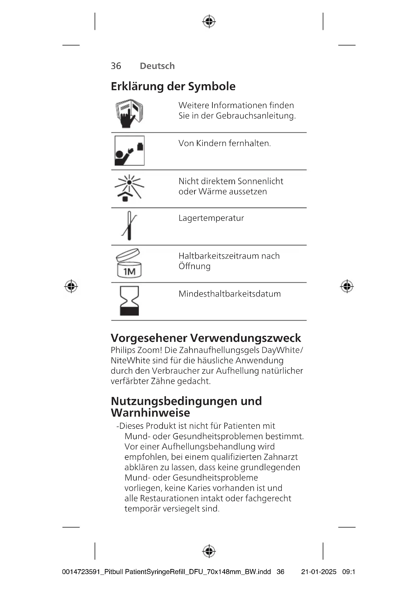 - Garantie WICHTIG LESEN SIE ALLE ANWEISUNGEN, BEVOR SIE DIESES PRODUKT VERWENDEN. 300014723591_Pitbull PatientSyringeRefill_DFU_70x148mm_BW.indd 35300014723591_Pitbull PatientSyringeRefill_DFU_70x148mm_BW.indd 35 21-01-2025 09:1121-01-2025 09:1136 Deutsch Deutsch 37 Erklärung der Symbole Weitere Informationen nden Sie in der Gebrauchsanleitung. Von Kindern fernhalten. Nicht direktem Sonnenlicht oder Wärme aussetzen Lagertemperatur Haltbarkeitszeitraum nach Önung Mindesthaltbarkeitsdatum Vorgesehener Verwendungszweck PhilipsZoom! Die Zahnaufhellungsgels DayWhite/ NiteWhite sind für die häusliche Anwendung durch den Verbraucher zur Aufhellung natürlicher verfärbter Zähne gedacht. Nutzungsbedingungen und Warnhinweise - Dieses Produkt ist nicht für Patienten mit Mund- oder Gesundheitsproblemen bestimmt. Vor einer Aufhellungsbehandlung wird empfohlen, bei einem qualizierten Zahnarzt abklären zu lassen, dass keine grundlegenden Mund- oder Gesundheitsprobleme vorliegen, keine Karies vorhanden ist und alle Restaurationen intakt oder fachgerecht temporär versiegelt sind. - Vor Beginn der Behandlung ist eine Prophylaxe durchzuführen, um Zahnstein oder leicht zu entfernende äußerliche Verfärbungen beim Patienten auszuschließen. - Darf nur an Zahnärzte abgegeben werden. In jedem Anwendungszyklus muss die erste Anwendung stets einem Zahnarzt vorbehalten sein oder unter dessen direkter Aufsicht erfolgen, falls ein gleichwertiges Sicherheitsniveau gewährleistet ist. Danach muss das Mittel dem Verbraucher für den verbleibenden Anwendungszyklus bereitgestellt werden. - Nicht bei Personen unter 18 Jahren anwenden. - Nutzen Sie das Produkt nicht zwei Wochen vor oder unmittelbar nach Zahnbehandlungen. - Schwangere oder Personen, die regelmäßig Tabak und/oder Alkohol konsumieren, dürfen dieses Produkt nicht anwenden. - Nicht für Patienten mit überempndlichen Zähnen und Zähnen mit großen Pulpahöhlen bestimmt. - DayWhite- und NiteWhite-Produkte enthalten entweder Wasserstoperoxid oder Karbamidperoxid. Augen- und Hautkontakt vermeiden. Sofort Augen spülen, falls das Erzeugnis mit den Augen in Berührung gekommen ist. - NiteWhite 10% Karbamidperoxid: 3,5%iges Wasserstoperoxid freigegeben. - NiteWhite 16% Karbamidperoxid: 5,9%iges Wasserstoperoxid freigegeben. - DayWhite 6%: 6%iges Wasserstoperoxid enthalten. - Enthält Natriumuorid. - Spritzen können unter leichtem Druck stehen. Spritze vom Gesicht weghalten und Kappe vorsichtig abziehen. - Verschlucken Sie das Kosmetikum oder Teile davon nicht. 300014723591_Pitbull PatientSyringeRefill_DFU_70x148mm_BW.indd 36300014723591_Pitbull PatientSyringeRefill_DFU_70x148mm_BW.indd 36 21-01-2025 09:1121-01-2025 09:1136 Deutsch Deutsch 37 Erklärung der Symbole Weitere Informationen nden Sie in der Gebrauchsanleitung. Von Kindern fernhalten. Nicht direktem Sonnenlicht oder Wärme aussetzen Lagertemperatur Haltbarkeitszeitraum nach Önung Mindesthaltbarkeitsdatum Vorgesehener Verwendungszweck PhilipsZoom! Die Zahnaufhellungsgels DayWhite/ NiteWhite sind für die häusliche Anwendung durch den Verbraucher zur Aufhellung natürlicher verfärbter Zähne gedacht. Nutzungsbedingungen und Warnhinweise - Dieses Produkt ist nicht für Patienten mit Mund- oder Gesundheitsproblemen bestimmt. Vor einer Aufhellungsbehandlung wird empfohlen, bei einem qualizierten Zahnarzt abklären zu lassen, dass keine grundlegenden Mund- oder Gesundheitsprobleme vorliegen, keine Karies vorhanden ist und alle Restaurationen intakt oder fachgerecht temporär versiegelt sind. - Vor Beginn der Behandlung ist eine Prophylaxe durchzuführen, um Zahnstein oder leicht zu entfernende äußerliche Verfärbungen beim Patienten auszuschließen. - Darf nur an Zahnärzte abgegeben werden. In jedem Anwendungszyklus muss die erste Anwendung stets einem Zahnarzt vorbehalten sein oder unter dessen direkter Aufsicht erfolgen, falls ein gleichwertiges Sicherheitsniveau gewährleistet ist. Danach muss das Mittel dem Verbraucher für den verbleibenden Anwendungszyklus bereitgestellt werden. - Nicht bei Personen unter 18 Jahren anwenden. - Nutzen Sie das Produkt nicht zwei Wochen vor oder unmittelbar nach Zahnbehandlungen. - Schwangere oder Personen, die regelmäßig Tabak und/oder Alkohol konsumieren, dürfen dieses Produkt nicht anwenden. - Nicht für Patienten mit überempndlichen Zähnen und Zähnen mit großen Pulpahöhlen bestimmt. - DayWhite- und NiteWhite-Produkte enthalten entweder Wasserstoperoxid oder Karbamidperoxid. Augen- und Hautkontakt vermeiden. Sofort Augen spülen, falls das Erzeugnis mit den Augen in Berührung gekommen ist. - NiteWhite 10% Karbamidperoxid: 3,5%iges Wasserstoperoxid freigegeben. - NiteWhite 16% Karbamidperoxid: 5,9%iges Wasserstoperoxid freigegeben. - DayWhite 6%: 6%iges Wasserstoperoxid enthalten. - Enthält Natriumuorid. - Spritzen können unter leichtem Druck stehen. Spritze vom Gesicht weghalten und Kappe vorsichtig abziehen. - Verschlucken Sie das Kosmetikum oder Teile davon nicht. 300014723591_Pitbull PatientSyringeRefill_DFU_70x148mm_BW.indd 37300014723591_Pitbull PatientSyringeRefill_DFU_70x148mm_BW.indd 37 21-01-2025 09:1121-01-2025 09:1138 Deutsch Deutsch 39 - Sollte Übelkeit oder Erbrechen auftreten, ist der Zahnarzt oder Hausarzt umgehend zu informieren. - Verwenden Sie für die DayWhite- und NiteWhite-Aufhellungsprodukte von Zoom! nur Aufhellungsschienen von Zoom! - Nicht essen, trinken oder rauchen, während Sie die passgenauen Schienen tragen. - Nutzen Sie keine Haushaltsprodukte für die Aufhellung von Zähnen. - Bei Auftreten von Empndlichkeit, Reizungen (wie z.B. Rötungen, Schwellungen, Schmerzen) von Zahneisch oder Mund, Zahnschmerzen, Übelkeit usw. oder wenn Restaurationen beschädigt werden, setzen Sie das Produkt ab, und wenden Sie sich an Ihren Zahnarzt. - Darf nicht in die Hände von Kindern gelangen. - Reizend und Gefahr ernster Augenschäden. - Verwenden Sie keine beschädigten Schienen, da das Gel auslaufen könnte, was zu Zahn