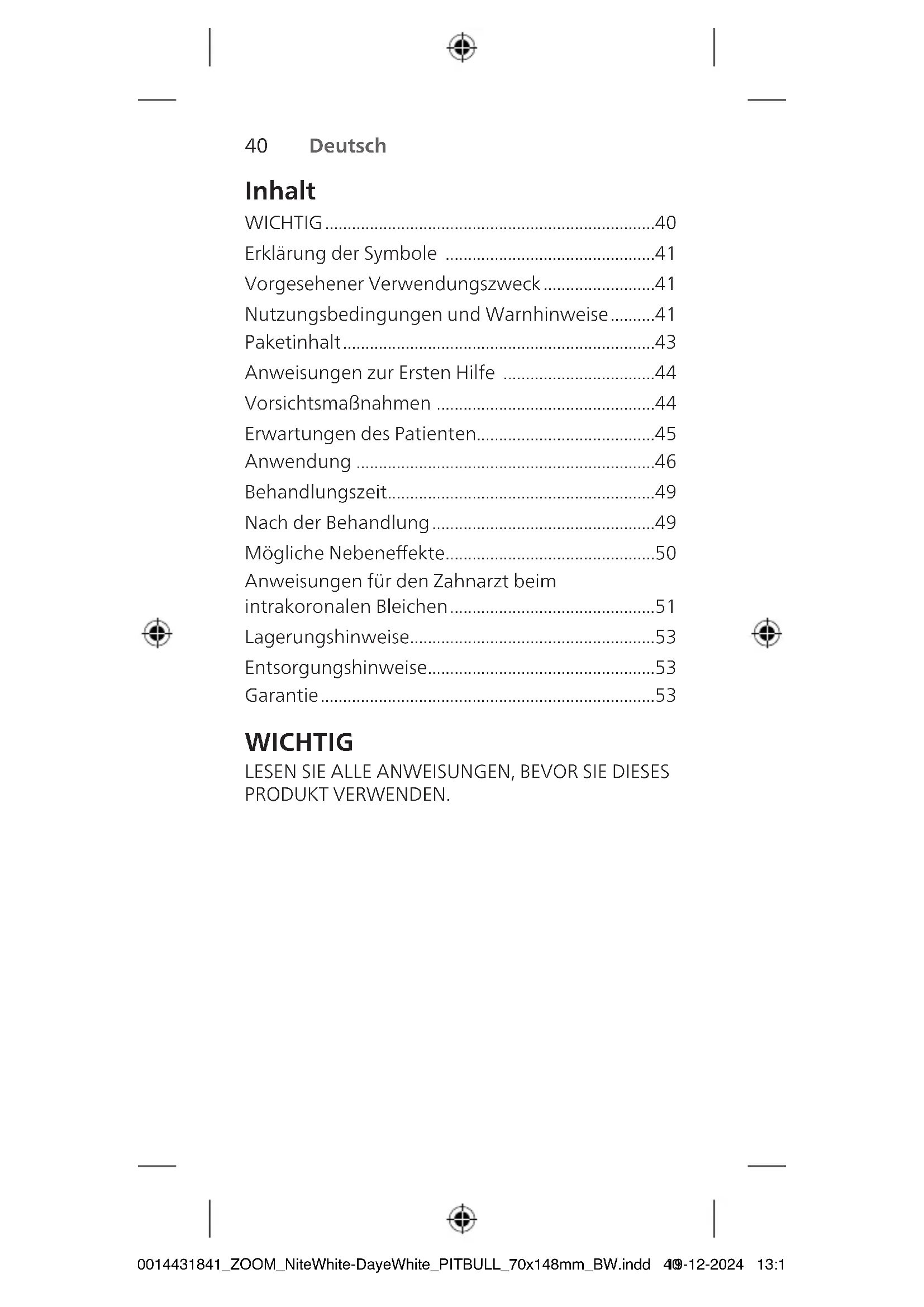 - Garantie WICHTIG LESEN SIE ALLE ANWEISUNGEN, BEVOR SIE DIESES PRODUKT VERWENDEN. Erklärung der Symbole Weitere Informationen nden Sie in der Gebrauchsanleitung. Von Kindern fernhalten. Nicht direktem Sonnenlicht oder Wärme aussetzen Lagertemperatur Haltbarkeitszeitraum nach Önung Mindesthaltbarkeitsdatum Vorgesehener Verwendungszweck PhilipsZoom! Die Zahnaufhellungsgels DayWhite/ NiteWhite sind für die häusliche Anwendung durch den Verbraucher zur Aufhellung natürlicher verfärbter Zähne gedacht. Nutzungsbedingungen und Warnhinweise - Dieses Produkt ist nicht für Patienten mit Mund- oder Gesundheitsproblemen bestimmt. Vor einer Aufhellungsbehandlung wird empfohlen, bei einem qualizierten Zahnarzt abklären zu lassen, dass keine grundlegenden Mund- oder Gesundheitsprobleme vorliegen, keine Karies vorhanden ist und alle Restaurationen intakt oder fachgerecht temporär versiegelt sind. 300014431841_ZOOM_NiteWhite-DayeWhite_PITBULL_70x148mm_BW.indd 41300014431841_ZOOM_NiteWhite-DayeWhite_PITBULL_70x148mm_BW.indd 4119-12-2024 13:1219-12-2024 13:12Deutsch 43 42 Deutsch - Vor Beginn der Behandlung ist eine Prophylaxe durchzuführen, um Zahnstein oder leicht zu entfernende äußerliche Verfärbungen beim Patienten auszuschließen. - Darf nur an Zahnärzte abgegeben werden. In jedem Anwendungszyklus muss die erste Anwendung stets einem Zahnarzt vorbehalten sein oder unter dessen direkter Aufsicht erfolgen, falls ein gleichwertiges Sicherheitsniveau gewährleistet ist. Danach muss das Mittel dem Verbraucher für den verbleibenden Anwendungszyklus bereitgestellt werden. - Nicht bei Personen unter 18 Jahren anwenden. - Nutzen Sie das Produkt nicht zwei Wochen vor oder unmittelbar nach Zahnbehandlungen. - Schwangere oder Personen, die regelmäßig Tabak und/oder Alkohol konsumieren, dürfen dieses Produkt nicht anwenden. - Nicht für Patienten mit überempndlichen Zähnen und Zähnen mit großen Pulpahöhlen bestimmt. - DayWhite- und NiteWhite-Produkte enthalten entweder Wasserstoperoxid oder Karbamidperoxid. Augen- und Hautkontakt vermeiden. Sofort Augen spülen, falls das Erzeugnis mit den Augen in Berührung gekommen ist. - NiteWhite 10% Karbamidperoxid: 3,5%iges Wasserstoperoxid freigegeben. - NiteWhite 16% Karbamidperoxid: 5,9%iges Wasserstoperoxid freigegeben. - DayWhite 6%: 6%iges Wasserstoperoxid enthalten. - Enthält Natriumuorid. - Spritzen können unter leichtem Druck stehen. Spritze vom Gesicht weghalten und Kappe vorsichtig abziehen. - Verschlucken Sie das Kosmetikum oder Teile davon nicht. - Sollte Übelkeit oder Erbrechen auftreten, ist der Zahnarzt oder Hausarzt umgehend zu informieren. - Verwenden Sie für die DayWhite- und NiteWhite-Aufhellungsprodukte von Zoom! nur Aufhellungsschienen von Zoom! - Nicht essen, trinken oder rauchen, während Sie die passgenauen Schienen tragen. - Nutzen Sie keine Haushaltsprodukte für die Aufhellung von Zähnen. - Bei Auftreten von Empndlichkeit, Reizungen (wie z.B. Rötungen, Schwellungen, Schmerzen) von Zahneisch oder Mund, Zahnschmerzen, Übelkeit usw. oder wenn Restaurationen beschädigt werden, setzen Sie das Produkt ab, und wenden Sie sich an Ihren Zahnarzt. - Darf nicht in die Hände von Kindern gelangen. - Reizend und Gefahr ernster Augenschäden. - Verwenden Sie keine beschädigten Schienen, da das Gel auslaufen könnte, was zu Zahneischreizungen führen kann. - Vor einer längerfristigen Anwendung des Produkts den Zahnarzt fragen. - Wenn Probleme auftreten, die Behandlung abbrechen und umgehend den Zahnarzt kontaktieren. Paketinhalt - Individuell angepasste Aufhellungsschienen (vom Zahnarzt angefertigt) - Spritzen mit Aufhellungsgel (6x 2,4ml) - Wiederverwendbare Mischspitzen - Aufbewahrungsbox für Schienen - Farbtonskala - Gebrauchsanleitung - Kurzanleitung 300014431841_ZOOM_NiteWhite-DayeWhite_PITBULL_70x148mm_BW.indd 42300014431841_ZOOM_NiteWhite-DayeWhite_PITBULL_70x148mm_BW.indd 4219-12-2024 13:1219-12-2024 13:12Deutsch 43 42 Deutsch - Vor Beginn der Behandlung ist eine Prophylaxe durchzuführen, um Zahnstein oder leicht zu entfernende äußerliche Verfärbungen beim Patienten auszuschließen. - Darf nur an Zahnärzte abgegeben werden. In jedem Anwendungszyklus muss die erste Anwendung stets einem Zahnarzt vorbehalten sein oder unter dessen direkter Aufsicht erfolgen, falls ein gleichwertiges Sicherheitsniveau gewährleistet ist. Danach muss das Mittel dem Verbraucher für den verbleibenden Anwendungszyklus bereitgestellt werden. - Nicht bei Personen unter 18 Jahren anwenden. - Nutzen Sie das Produkt nicht zwei Wochen vor oder unmittelbar nach Zahnbehandlungen. - Schwangere oder Personen, die regelmäßig Tabak und/oder Alkohol konsumieren, dürfen dieses Produkt nicht anwenden. - Nicht für Patienten mit überempndlichen Zähnen und Zähnen mit großen Pulpahöhlen bestimmt. - DayWhite- und NiteWhite-Produkte enthalten entweder Wasserstoperoxid oder Karbamidperoxid. Augen- und Hautkontakt vermeiden. Sofort Augen spülen, falls das Erzeugnis mit den Augen in Berührung gekommen ist. - NiteWhite 10% Karbamidperoxid: 3,5%iges Wasserstoperoxid freigegeben. - NiteWhite 16% Karbamidperoxid: 5,9%iges Wasserstoperoxid freigegeben. - DayWhite 6%: 6%iges Wasserstoperoxid enthalten. - Enthält Natriumuorid. - Spritzen können unter leichtem Druck stehen. Spritze vom Gesicht weghalten und Kappe vorsichtig abziehen. - Verschlucken Sie das Kosmetikum oder Teile davon nicht. - Sollte Übelkeit oder Erbrechen auftreten, ist der Zahnarzt oder Hausarzt umgehend zu informieren. - Verwenden Sie für die DayWhite- und NiteWhite-Aufhellungsprodukte von Zoom! nur Aufhellungsschienen von Zoom! - Nicht essen, trinken oder rauchen, während Sie die passgenauen Schienen tragen. - Nutzen Sie keine Haushaltsprodukte für die Aufhellung von Zähnen. - Bei Auftreten von Empndlichkeit, Reizungen (wie z.B. Rötungen, Schwellungen, Schmerzen) von Zahneisch oder Mund, Zahnschmerzen, Übelkeit usw. oder wenn Restaurationen beschädigt werden, setzen Sie das 