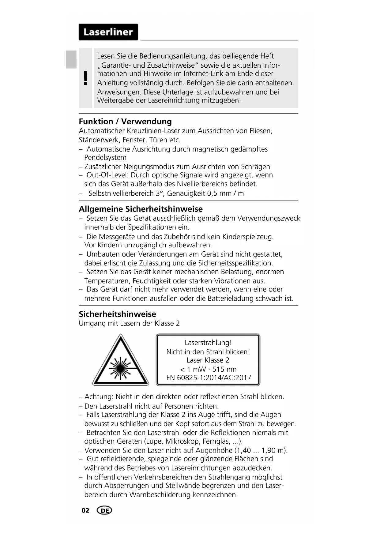 Allgemeine Sicherheitshinweise – Setzen Sie das Gerät ausschließlich gemäß dem Verwendungszweck innerhalb der Spezikationen ein. – Die Messgeräte und das Zubehör sind kein Kinderspielzeug. Vor Kindern unzugänglich aufbewahren. – Umbauten oder Veränderungen am Gerät sind nicht gestattet, dabei erlischt die Zulassung und die Sicherheitsspezikation. – Setzen Sie das Gerät keiner mechanischen Belastung, enormen Temperaturen, Feuchtigkeit oder starken Vibrationen aus. – Das Gerät darf nicht mehr verwendet werden, wenn eine oder mehrere Funktionen ausfallen oder die Batterieladung schwach ist. – Achtung: Nicht in den direkten oder reektierten Strahl blicken. – Den Laserstrahl nicht auf Personen richten. – Falls Laserstrahlung der Klasse 2 ins Auge trifft, sind die Augen bewusst zu schließen und der Kopf sofort aus dem Strahl zu bewegen. – Betrachten Sie den Laserstrahl oder die Reektionen niemals mit optischen Geräten (Lupe, Mikroskop, Fernglas, ...). – Verwenden Sie den Laser nicht auf Augenhöhe (1,40 ... 1,90 m). – Gut reektierende, spiegelnde oder glänzende Flächen sind während des Betriebes von Lasereinrichtungen abzudecken. – In öffentlichen Verkehrsbereichen den Strahlengang möglichst durch Absperrungen und Stellwände begrenzen und den Laser- bereich durch Warnbeschilderung kennzeichnen. Sicherheitshinweise Umgang mit Lasern der Klasse 2 Laserstrahlung! Nicht in den Strahl blicken! Laser Klasse 2 < 1 mW · 515 nm EN 60825-1:2014/AC:2017 Funktion / Verwendung Automatischer Kreuzlinien-Laser zum Aussrichten von Fliesen, Ständerwerk, Fenster, Türen etc. – Automatische Ausrichtung durch magnetisch gedämpftes Pendelsystem – Zusätzlicher Neigungsmodus zum Ausrichten von Schrägen – Out-Of-Level: Durch optische Signale wird angezeigt, wenn sich das Gerät außerhalb des Nivellierbereichs bendet. – Selbstnivellierbereich 3°, Genauigkeit 0,5 mm / mEasyCross-Laser Green