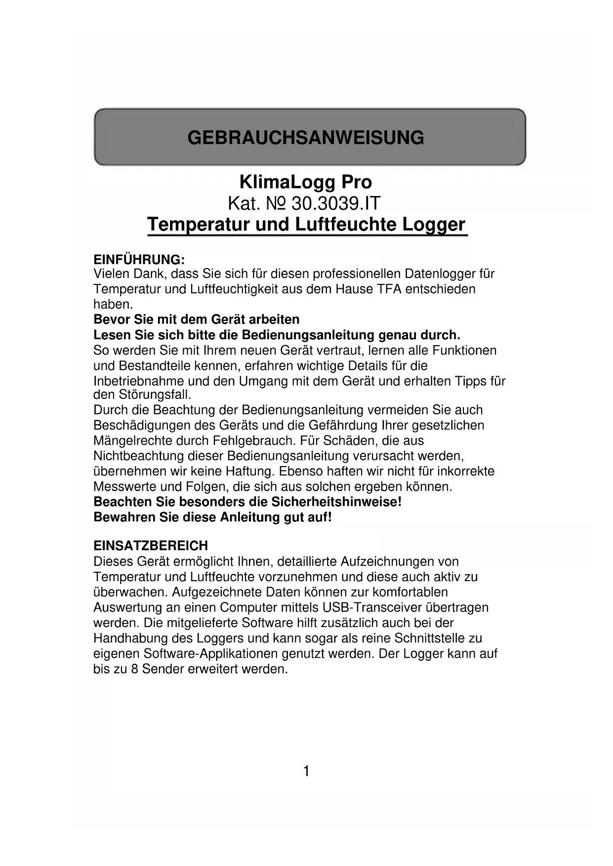 Vielen Dank, dass Sie sich für diesen professionellen Datenlogger für Temperatur und Luftfeuchtigkeit aus dem Hause TFA entschieden haben.