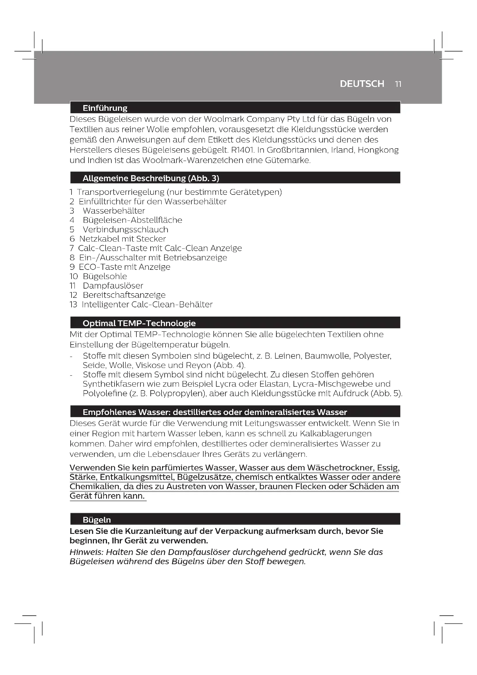 For the best results on tough fabrics you can use the TURBO mode. 1 Press and hold the on/o button for 2 seconds until the light turns white. 2 To deactivate the TURBO mode, press and hold the on/o button for 2 seconds again until the light turns blue. Safety auto-o (specic types only) The safety auto-o function automatically switches o the appliance if it has not been used for 5 minutes, to save energy. Troubleshooting This chapter summarises the most common problems you could encounter with the appliance. If you are unable to solve the problem with the information below, visit www.philips.com/support for a list of frequently asked questions or contact the Consumer Care Centre in your country. Problem Possible cause Solution The iron does not produce any steam. There is not enough water in the water tank. Fill the water tank beyond the MIN indication. Press and hold the steam trigger until steam comes out. It may take up to 30 seconds until steam comes out. You have not pressed the steam trigger. Press and hold the steam trigger until steam comes out. The steam function has been disabled until you have performed the Calc-Clean process. Perform the calc-clean process to restore the steam function (see chapter ‘IMPORTANT - Cleaning and maintenance’). The light of the Calc-Clean button ashes and/or the appliance beeps. This is the Calc-Clean reminder. Perform the Calc-Clean process within 1 hour after the Calc-Clean reminder is given (see chapter ‘IMPORTANT - Cleaning and maintenance’). ENGLISH9 Problem Possible cause Solution The light of the Calc-Clean button ashes and the appliance beeps every time I press the steam trigger. No steam comes out of the soleplate. You have not done or have not completed the Calc-Clean process. Perform the Calc-Clean process to enable the steam function again (see chapter ‘IMPORTANT - Cleaning and maintenance’). The appliance has switched o. The safety auto-o function was activated. This happens automatically when the steam generator has not been used for more than 5 minutes. Set the on/o switch to ‘o’ position and then to ‘on’ position. The appliance produces a loud pumping sound. The water tank is empty. Fill the water tank with water and press the steam trigger until the pumping sound becomes softer and steam comes out of the soleplate. Water droplets come out of the soleplate. After the Calc-Clean process, remaining water may drip out of the soleplate. Wipe the soleplate dry with a piece of cloth. If the light in the Calc- Clean button still ashes and the appliance still beeps, perform the Calc-Clean process (see chapter ‘IMPORTANT - Cleaning and maintenance’). The Calc-Clean process has not been completed. You have to perform the Calc- Clean process again (see chapter ‘IMPORTANT - Cleaning and maintenance’). Dirty water and impurities come out of the soleplate. Impurities or chemicals present in the water have deposited in the steam vents and/or soleplate. Perform the Calc-Clean process regularly (see chapter ‘IMPORTANT - Cleaning and maintenance’). Water ushes out of the soleplate. You have accidentally started the Calc-Clean process (see chapter ‘IMPORTANT - Cleaning and maintenance’). Switch o the appliance. Then switch it back on again. Let the iron heat up until the ‘iron ready’ light lights up steadily. The Calc-Clean process does not start. You have not pressed the Calc-Clean button for 2 seconds until the appliance started beeping. See chapter ‘IMPORTANT - Cleaning and maintenance’. ENGLISH10 Problem Possible cause Solution The iron leaves a shine or an imprint on the garment. The surface to be ironed was uneven, for instance because you were ironing over a seam or a fold in the garment. Perfect Care is safe on all garments. The shine or imprint is not permanent and will disappear when you wash the garment. Avoid ironing over seams or folds or you can place a cotton cloth over the area to be ironed to avoid imprints. The ironing board cover becomes wet or water droplets come out of the soleplate. Steam has condensed on the ironing board cover after a long ironing session. Replace the ironing board cover if the foam material has worn out. You can also add an extra layer of felt material under the ironing board cover to prevent condensation on the ironing board. You may have an ironing board that is not designed to cope with the high steam rate of the steam generator. Put an extra layer of felt material under the ironing board cover to prevent condensation on the ironing board. Steam continues to come out after I release the steam trigger. Steam is generated in the soleplate. When you release the steam trigger, remaining water is transformed into steam. This is normal. Release the steam trigger 2 to 3 seconds before you place the iron back on the iron platform or ironing board. There is a strong gush of steam when I release the steam trigger after placing the iron on the iron platform. When the iron is tilted upwards, remaining water is collected and converted into strong steam. This is normal. Release the steam trigger 2 to 3 seconds before you place the iron back on the iron platform or ironing board. Steam is weak. You do not press the steam trigger continuously. Keep the steam trigger pressed continuously when you move the iron over the fabric. You use the ECO mode. For more steam, switch o the ECO mode by pressing the ECO button. The green ECO light goes o. Steam does not come out immediately when I press the steam trigger. Water is converted into steam in the soleplate. When you press the steam trigger, it will take 1 to 2 seconds until steam is generated and released. This is normal. Keep the steam trigger pressed continuously when you move the iron over the fabric. ENGLISH11 Einführung Dieses Bügeleisen wurde von der Woolmark Company Pty Ltd für das Bügeln von Textilien aus reiner Wolle empfohlen, vorausgesetzt die Kleidungsstücke werden gemäß den Anweisungen auf dem Etikett des Kleidungs