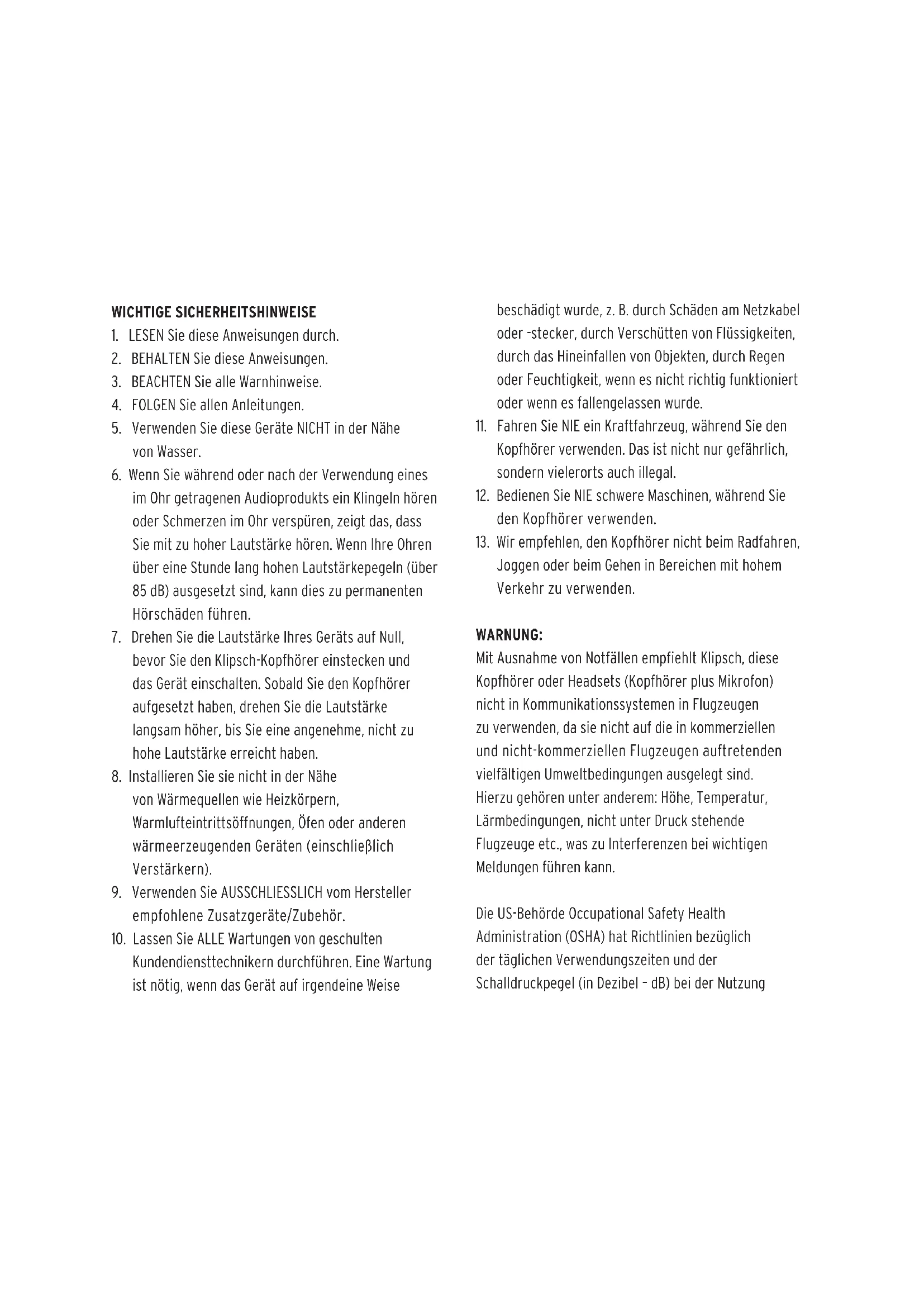 Joggen oder beim Gehen in Bereichen mit hohem Verkehr zu verwenden. WARNUNG: Mit Ausnahme von Notfällen empfiehlt Klipsch, diese Kopfhörer oder Headsets (Kopfhörer plus Mikrofon) nicht in Kommunikationssystemen in Flugzeugen zu verwenden, da sie nicht auf die in kommerziellen und nicht-kommerziellen Flugzeugen auftretenden vielfältigen Umweltbedingungen ausgelegt sind. Hierzu gehören unter anderem: Höhe, Temperatur, Lärmbedingungen, nicht unter Druck stehende Flugzeuge etc., was zu Interferenzen bei wichtigen Meldungen führen kann. Die US-Behörde Occupational Safety Health Administration (OSHA) hat Richtlinien bezüglich der täglichen Verwendungszeiten und der Schalldruckpegel (in Dezibel – dB) bei der Nutzungvon Kopfhörern herausgegeben. Ein Dezibel ist eine Lautstärkemaßeinheit, und die Einheiten nehmen bei steigender Lautstärke exponentiell zu. Beispielsweise ist ein typisches Gespräch etwa 60 dB laut, ein Rock- Konzert in einem Stadium hingegen oft um die 110 dB.