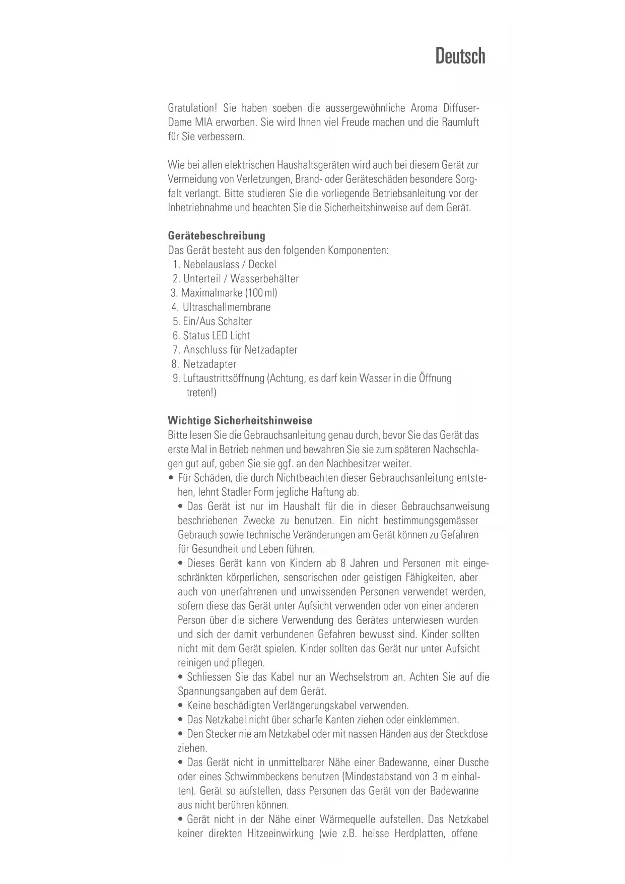 hen Sie den Netzstecker. Entfernen Sie den Deckel und füllen das Wasser bis zur Maximalmarke auf. Hinweis: Möchten Sie den Duftstoff wechseln, leeren Sie Mia komplett und reinigen Sie den Wasserbehälter mit einem feuchten Tuch. Befüllen Sie Mia erneut und geben Sie die Tropfen gemäss der Bedienungsanleitung ins Gerät.Reinigung Vor jeder Wartung und nach jedem Gebrauch das Gerät ausschalten und den Netzadapter von der Steckdose trennen. Bevor Sie Mia reinigen, muss der Netzadapter ausgesteckt werden. Achtung: Das Gerät nie ins Wasser tauchen (Kurzschlussgefahr).