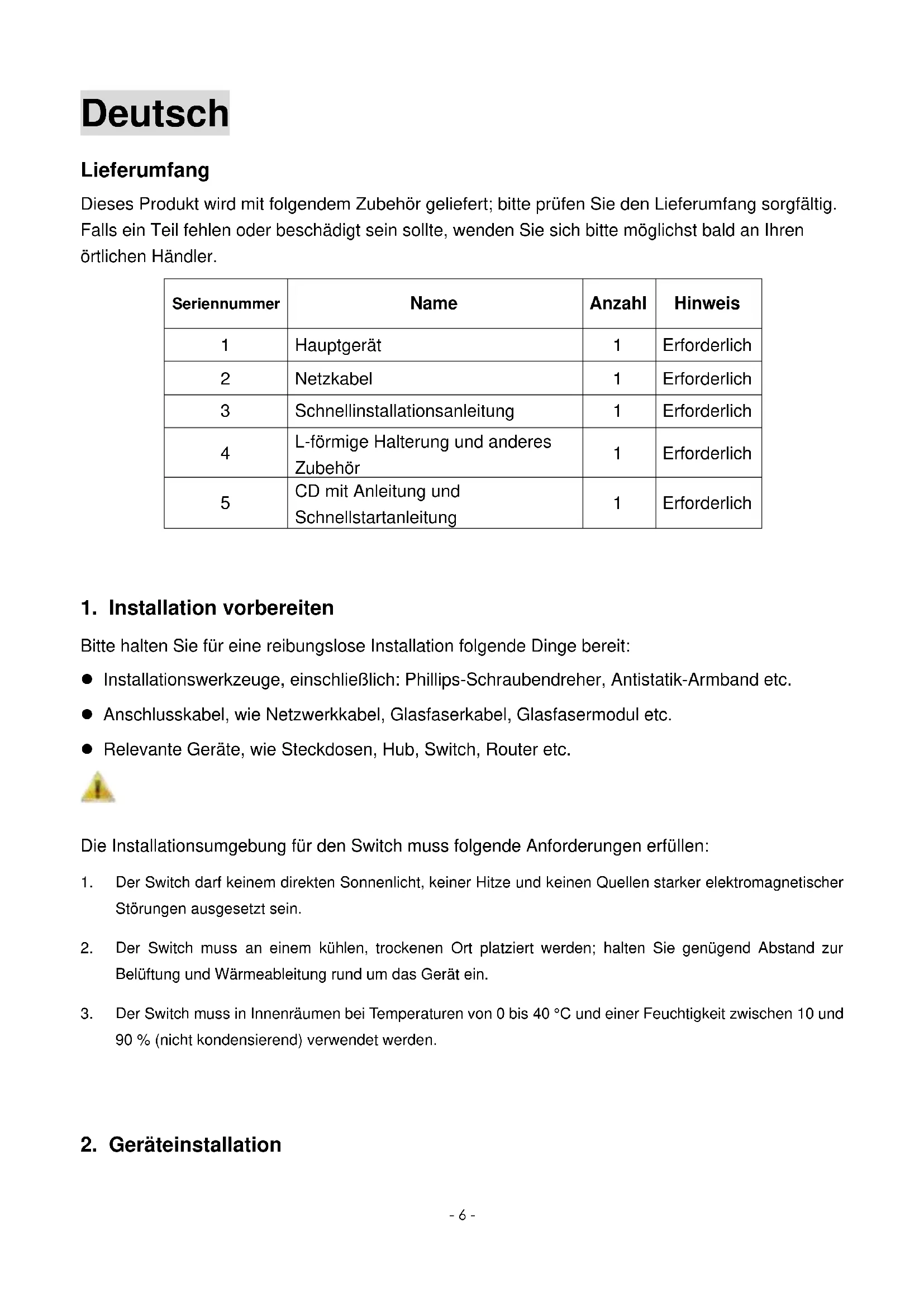 Bitte halten Sie für eine reibungslose Installation folgende Dinge bereit: Installationswerkzeuge, einschließlich: Phillips-Schraubendreher, Antistatik-Armband etc. Anschlusskabel, wie Netzwerkkabel, Glasfaserkabel, Glasfasermodul etc. Relevante Geräte, wie Steckdosen, Hub, Switch, Router etc. Die Installationsumgebung für den Switch muss folgende Anforderungen erfüllen: