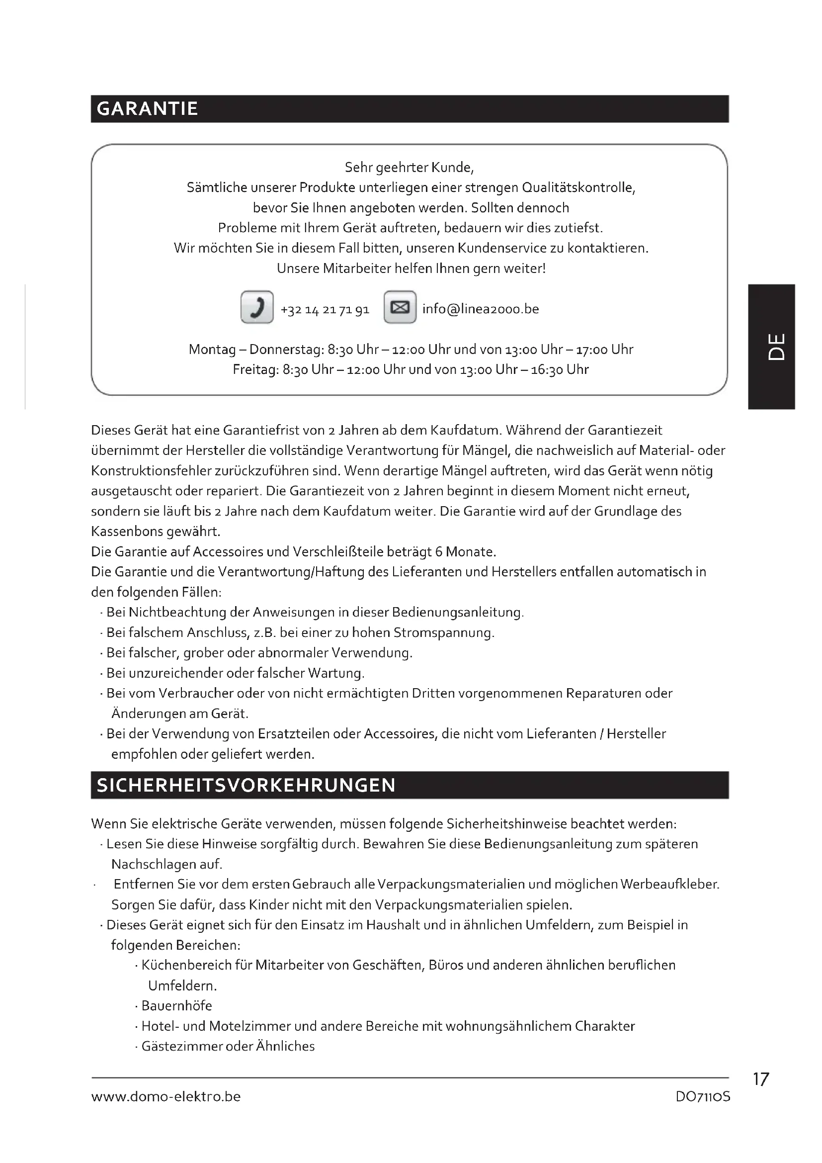 GARANTIE Sehr geehrter Kunde, Sämtliche unserer Produkte unterliegen einer strengen Qualitätskontrolle, bevor Sie Ihnen angeboten werden. Sollten dennoch Probleme mit Ihrem Gerät auftreten, bedauern wir dies zutiefst. Wir möchten Sie in diesem Fall bitten, unseren Kundenservice zu kontaktieren. Unsere Mitarbeiter helfen Ihnen gern weiter! +32 14 21 71 91 info@linea2000.be Montag – Donnerstag: 8:30 Uhr – 12:00 Uhr und von 13:00 Uhr – 17:00 Uhr Freitag: 8:30 Uhr – 12:00 Uhr und von 13:00 Uhr – 16:30 Uhr Dieses Gerät hat eine Garantiefrist von 2 Jahren ab dem Kaufdatum. Während der Garantiezeit übernimmt der Hersteller die vollständige Verantwortung für Mängel, die nachweislich auf Material- oder Konstruktionsfehler zurückzuführen sind. Wenn derartige Mängel auftreten, wird das Gerät wenn nötig ausgetauscht oder repariert. Die Garantiezeit von 2 Jahren beginnt in diesem Moment nicht erneut, sondern sie läuft bis 2 Jahre nach dem Kaufdatum weiter. Die Garantie wird auf der Grundlage des Kassenbons gewährt. Die Garantie auf Accessoires und Verschleißteile beträgt 6 Monate. Die Garantie und die Verantwortung/Haftung des Lieferanten und Herstellers entfallen automatisch in den folgenden Fällen: