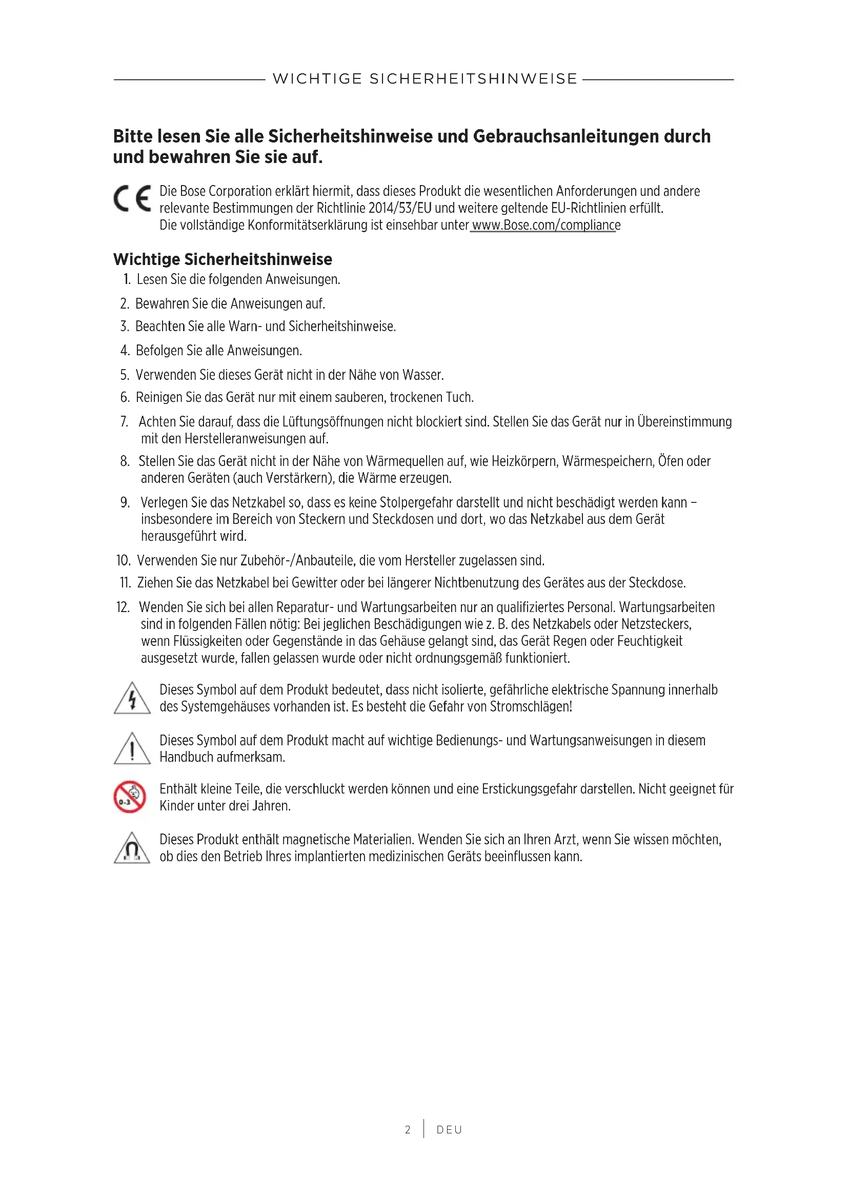 DEU Bitte lesen Sie alle Sicherheitshinweise und Gebrauchsanleitungen durch und bewahren Sie sie auf. Die Bose Corporation erklärt hiermit, dass dieses Produkt die wesentlichen Anforderungen und andere relevante Bestimmungen der Richtlinie 2014/53/EU und weitere geltende EU-Richtlinien erfüllt. Dievollständige Konformitätserklärung ist einsehbar unter www.Bose.com/compliance Wichtige Sicherheitshinweise