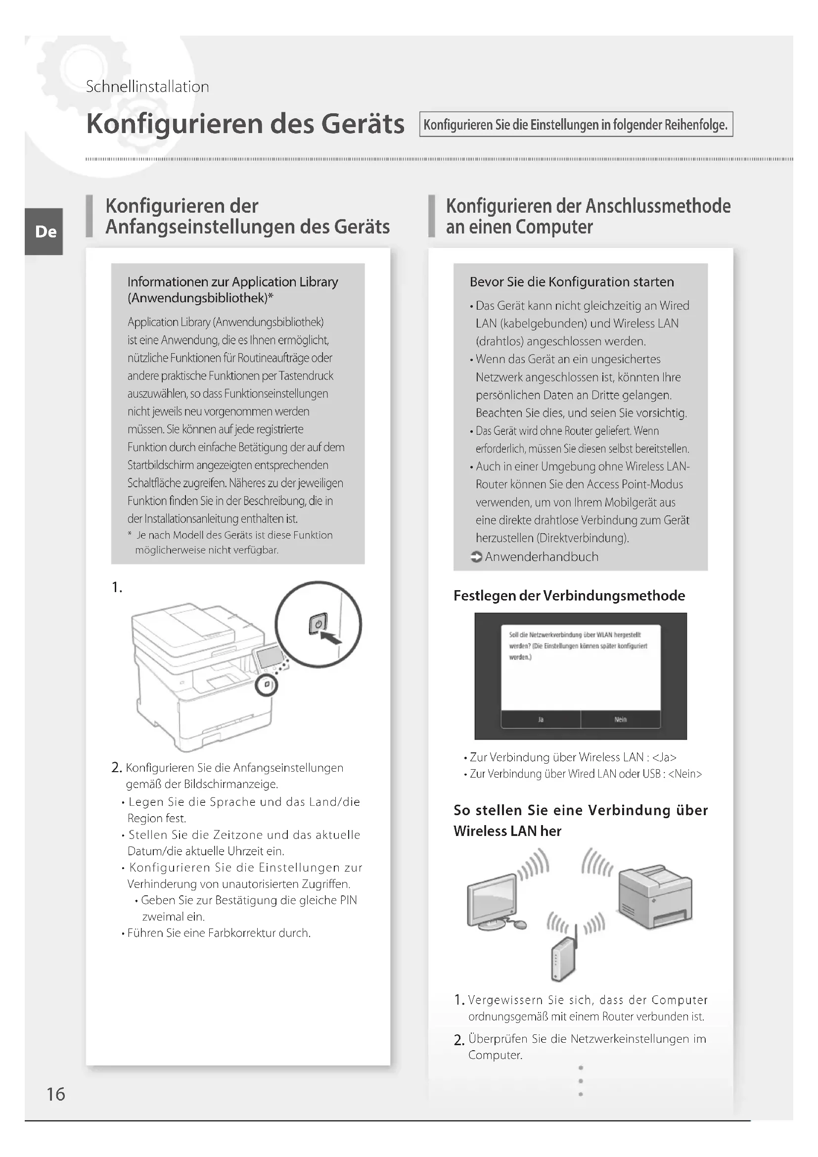 Configuration des réglages de fax Conguration rapide FrKonfigurieren der Anschlussmethode an einen Computer Informationen zur Application Library (Anwendungsbibliothek)* Application Library (Anwendungsbibliothek) ist eine Anwendung, die es Ihnen ermöglicht, nützlicheFunktionenfürRoutineaufträgeoderandere praktische Funktionen per Tastendruck auszuwählen, so dass Funktionseinstellungen nicht jeweils neu vorgenommen werden müssen. Sie können auf jede registrierte Funktion durch einfache Betätigung der auf dem Startbildschirm angezeigten entsprechenden Schaltfläche zugreifen. Näheres zu der jeweiligen Funktion finden Sie in der Beschreibung, die in der Installationsanleitung enthalten ist.* Je nach Modell des Geräts ist diese Funktion möglicherweise nicht verfügbar.
