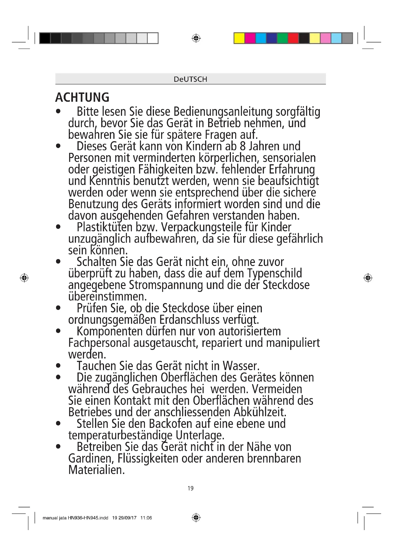 - Betreiben Sie das Gerät nicht in der Nähe von Gardinen, Flüssigkeiten oder anderen brennbaren Materialien. manual jata HN936-HN945.indd 19 29/09/17 11:0620