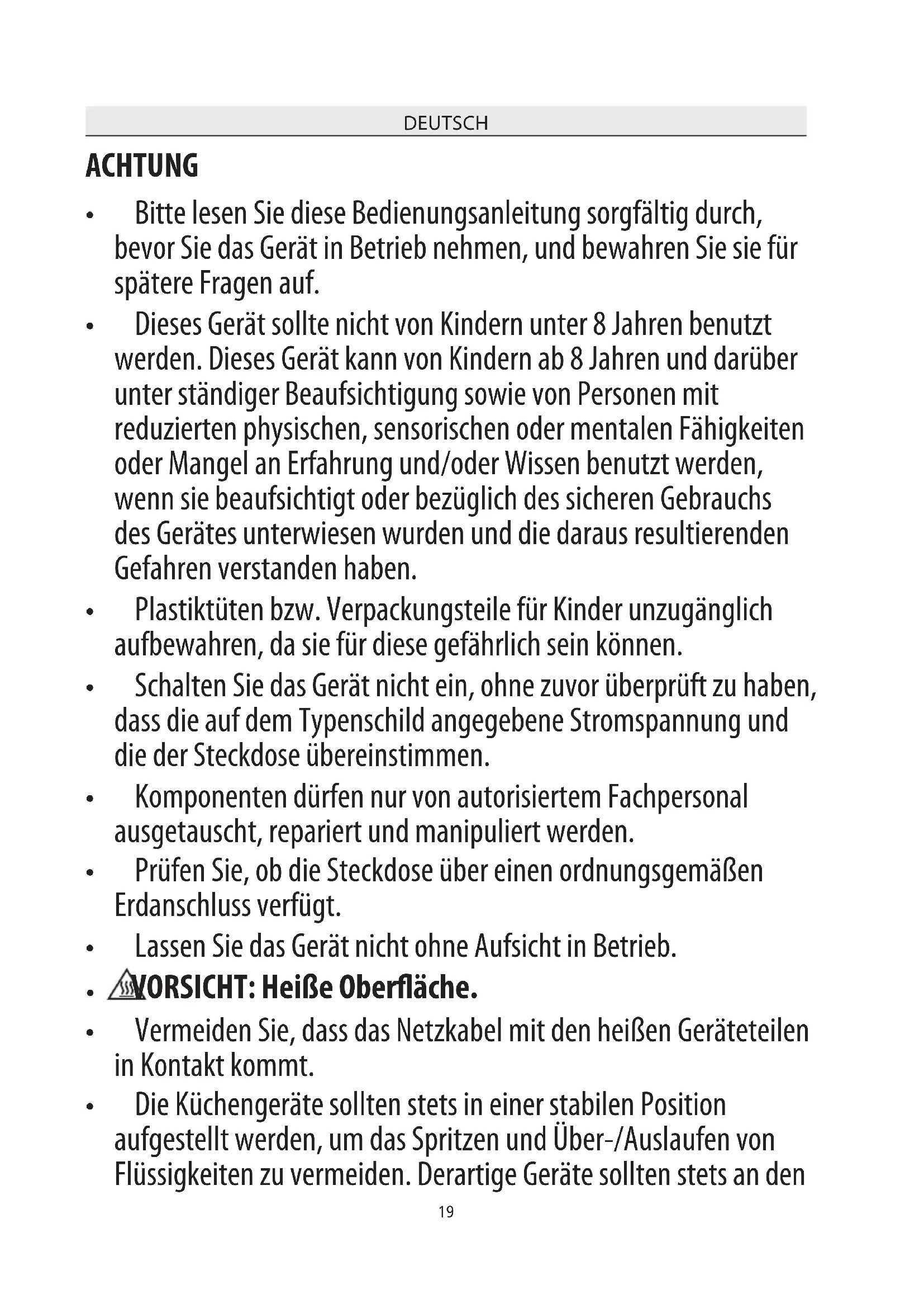 - WARNHINWEIS: Das Gerät sowie die Zuleitung und Anschlusskabel niemals in Wasser oder anderer Flüssigkeit eintauchen.