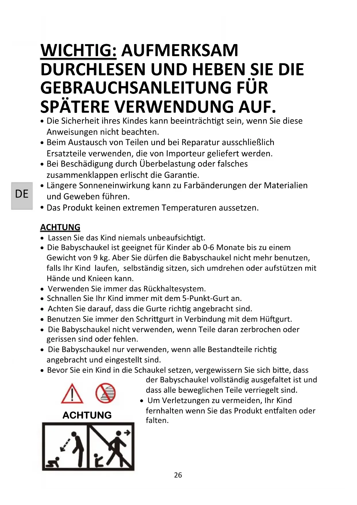 - Falten Sie die Babyschaukel nicht zusammen, wenn ein Kind darin sitzt.