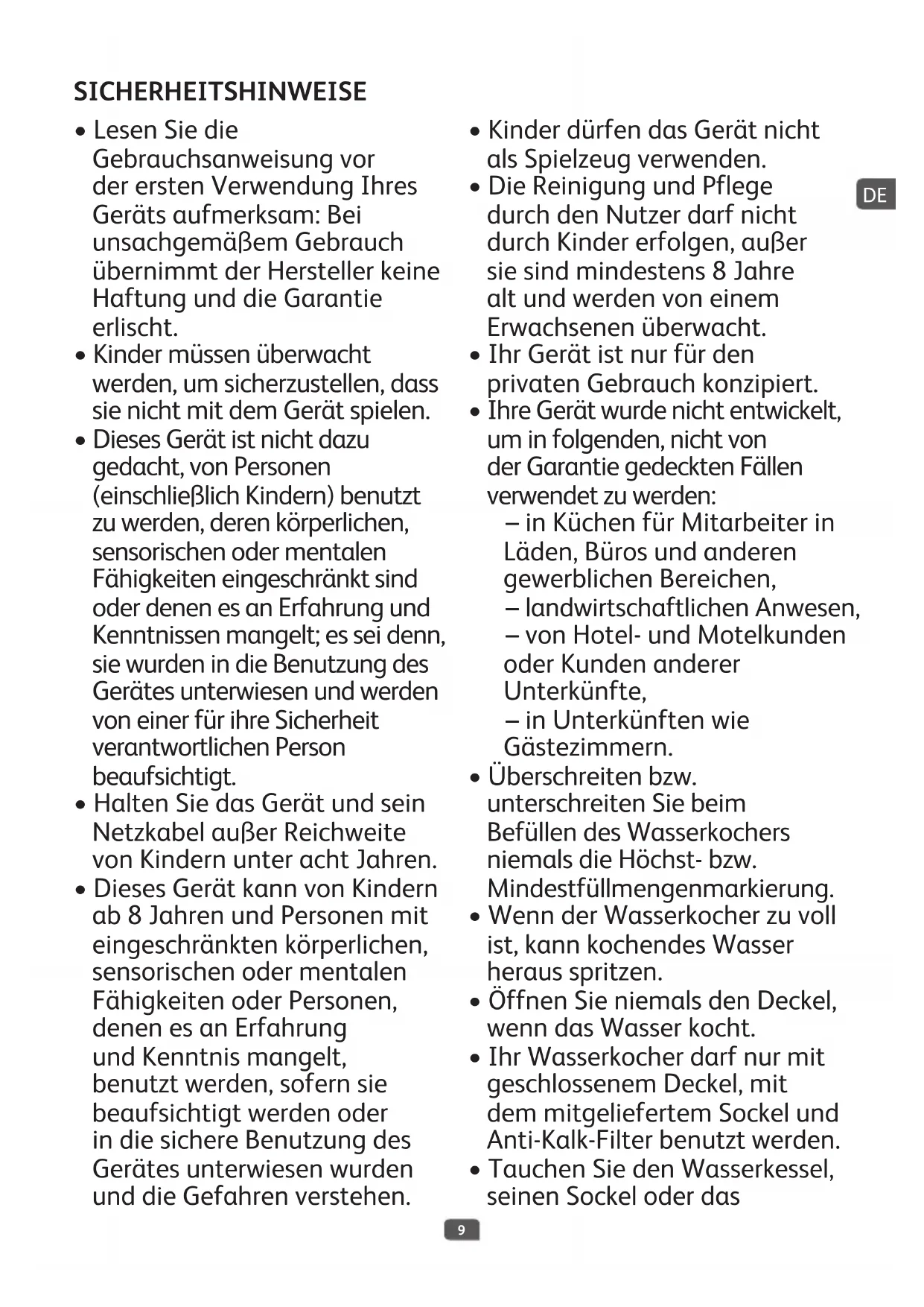 - Tauchen Sie den Wasserkessel, seinen Sockel oder das SICHERHEITSHINWEISE DE10 Stromkabel und den Stecker nicht in Wasser oder andere Flüssigkeiten.