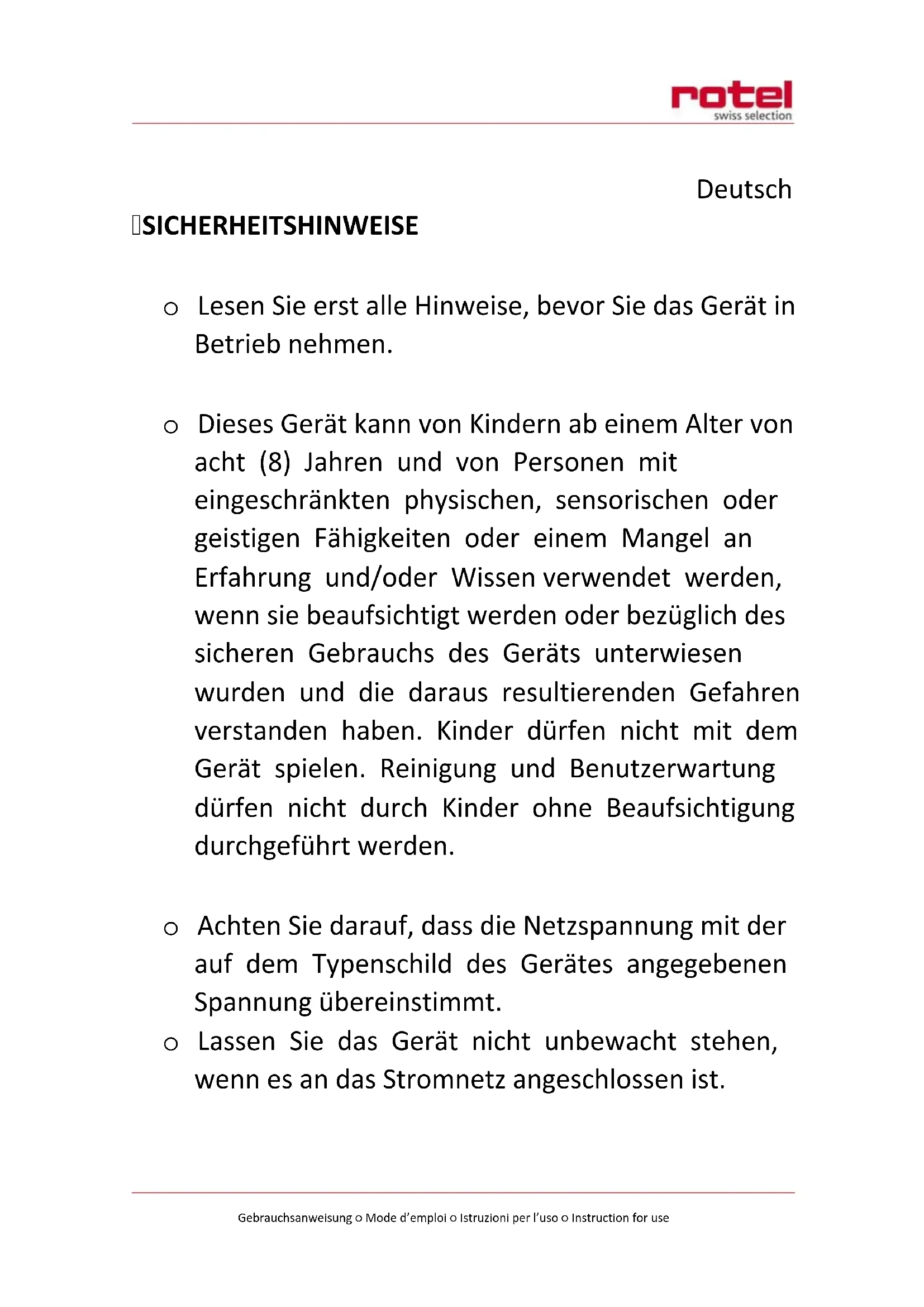 - Für eine sachgerechte Entsorgung ist das Gerät dem Fachhändler, der Servicestelle oder der Firma Rotel AG zurückzugeben.