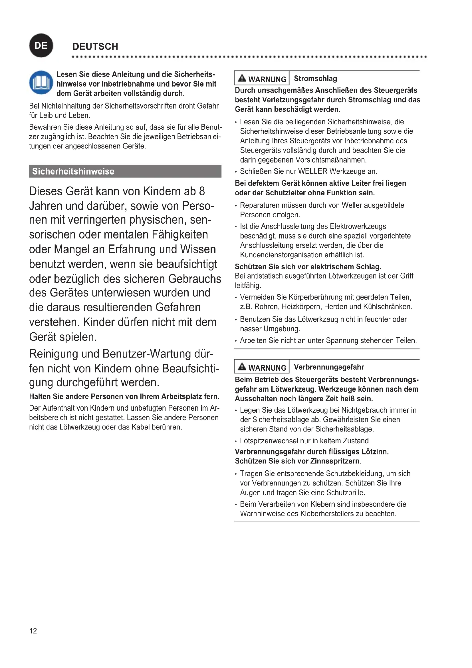 - Bringen Sie keine brennbaren Gegenstände, Flüssigkei- ten oder Gasen in die Nähe des heißen Lötwerkzeugs. Bewahren Sie Ihr Lötwerkzeug sicher auf. Unbenutzte Geräte und Werkzeuge sollten an einem trockenen, hochgelegenen oder abgeschlossenen Ort, außerhalb der Reichweite von Kindern, abgelegt werden. Schalten Sie unbenutzte Lötwerkzeuge spannungs- und druckfrei. Das Netzkabel darf nur in die dafür zugelassenen Netzsteckdosen oder Adapter eingesteckt werden. Überprüfen Sie, ob die Netzspannung mit der Angabe auf demTypenschildübereinstimmt.Gerätnurausgeschaltetan die Steckdose anschließen. Verwenden Sie das Kabel nicht für Zwecke, für die es nicht bestimmt ist.Tragen Sie das Gerät niemals am Kabel. Benutzen Sie das Kabel nicht, um den Stecker aus der Steckdose zu ziehen. Schützen Sie das Kabel vor Hitze, Öl und scharfen Kanten. Seien Sie aufmerksam. Achten Sie darauf, was Sie tun. Gehen Sie mit Vernunft an die Arbeit. Benutzen Sie das Lötwerkzeug nicht wenn Sie unkonzentriert sind. Vermeiden Sie abnormale Körperhaltung. Gestalten Sie Ihren Arbeitsplatz ergonomisch richtig. Vermeiden Sie Haltungsfehler beim Arbeiten, Haltungsfehler verursachen Haltungsschäden. Das Lötwerkzeug darf nur in technisch einwandfreien Zustand in Betrieb genommen werden. Schutzvorrichtun- gen dürfen nicht außer Betrieb gesetzt werden. Störungen und Defekte müssen umgehend beseitigt werden. VorjedemGebrauchdesGeräts/Werkzeugs müssen Schutzvorrichtungen sorgfältig auf Ihre einwandfreie und bestimmungsgemäße Funktion untersucht werden. Überprüfen Sie, ob die beweglichen Teile einwandfrei funktionieren und nicht klemmen oder ob Teile beschädigt sind. Sämtliche Teile müssen richtig montiert sein und alle Bedingungen erfüllen, um den einwandfreien Betrieb des Geräts zu gewährleisten. Benutzen Sie das richtige Werkzeug. Benutzen Sie nur ZubehöroderZusatzgeräte,dieinderZubehörlisteaufge- führt sind oder vom Hersteller freigegeben sind. Benutzen SieWELLERZubehöroderZusatzgerätenuranoriginal WELLER Geräten. Der Gebrauch anderer Werkzeuge und anderenZubehörskanneineVerletzungsgefahrfürSie bedeuten. Sichern Sie das Werkzeug. Benutzen Sie Spannvorrichtun- gen um das Werkstück festzuhalten. Verwenden Sie eine Lötrauchabsaugung. Wenn Vorrichtungen zum Anschluss von Lötrauchabsaugungen vorhanden sind, überzeugen Sie sich, dass diese angeschlossen und richtig benutzt werden. Bestimmungsgemäße Verwendung Versorgungseinheit für WELLER Lötwerkzeuge. Verwenden Sie die Lötstation ausschließlich gemäß dem in der BetriebsanleitungangegebenenZweckzumLötenunterden hier angegebenen Bedingungen. Dieses Gerät darf nur bei Raumtemperatur und in Innen- räumen verwendet werden. Vor Feuchtigkeit und direkter Sonneneinstrahlung schützen. Benutzergruppen Aufgrund unterschiedlich hoher Risiken und Gefahrenpo- tentiale dürfen einige Arbeitsschritte nur von geschulten Fachkräften ausgeführt werden. Arbeitsschritt Benutzergruppen Vorgabe der Lötparameter Fachpersonal mit techni- scher Ausbildung Auswechseln von elektri- schen Ersatzteilen Elektrofachkraft Vorgabe von Wartungsin- tervallen Sicherheitsfachkraft Bedienen Laien Bedienen Auswechseln von elektri- schen Ersatzteilen Technische Auszubildende unter Anleitung und Auf- sicht einer ausgebildeten Fachkraft Pege und Wartung WARNUNG Vor allen Arbeiten am Gerät Stecker aus der Steckdose ziehen. Gerät abkühlen lassen. Kontrollieren Sie regelmäßig alle angeschlossenen Kabel und Schläuche. Schadhafte Elektrowerkzeuge sofort jeder weiteren Verwendung entziehen. Reparaturen müssen durch von Weller ausgebildete Personen erfolgen. Nur original WELLER-Ersatzteile verwenden. Garantie Die Mängelansprüche des Käufers verjähren in einem Jahr ab Ablieferung an ihn. Dies gilt nicht für Rückgriffsansprüche des Käufers nach §§ 478, 479 BGB. Aus einer von uns abgegebenen Garantie haften wir nur, wenn die Beschaffenheits- oder Haltbarkeitsgarantie von uns schriftlich und unter Verwendung des Begriffs „Garantie“ abgegeben worden ist. Die Garantie verfällt bei unsachgemäßem Gebrauch und wennvonunqualiziertenPersonenEingriffevorgenommen wurden.